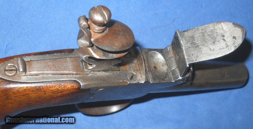 Description: UNMARKED LATE 1700s EARLY 1800s ERA ENGLISH BIG BORE .51 CALIBER FLINTLOCK POCKET or MUFF PISTOL. ABOUT 6 1/2" OVERALL WITH 1 1/2" SMOOTHBORE SCREW OFF BARREL. SMOOTH METAL SURFACES CLEANED BRIGHT AT SOME POINT. WALNUT GRIP RATES EXCELLENT WITH NO HANDLING MARKS or CRACKS. THIS LITTLE PISTOL SHOWS HARDLY ANY USE. THE LOCK IS CRISP & TIGHT WITH SLIDING SAFETY FOR HALF COCK. I PERSONALLY WOULD HAVE NO PROBLEM FIRING IT. VERY ATTRACTIVE EARLY GUN, AS PICTURED & FOUND. $12.00 S&H DIRECT TO BUYER ANYWHERE THAT'S OK. M40 SEE ALL "ESTATE ANTIQUES" LISTINGS FOR MORE FAIRLY PRICED GUNS FROM OLD TIME COLLECTIONS & ESTATES. SOLD Antique: Yes Manufacturer: UNMARKED Model: FLINTLOCK Barrel Length: 2 Bore: SMOOTH BORE Chambers: CLEAR Condition: VERY GOOD Metal Condition: SMOOTH Wood Condition: EXCELLENT Barrel Type: ROUND Action: CRISP & TIGHT Triggers: SINGLE Stock: WALNUT Finish: BRIGHT |