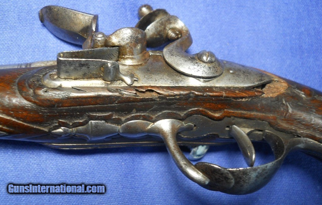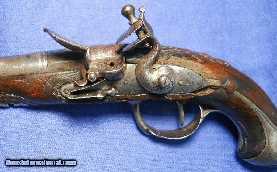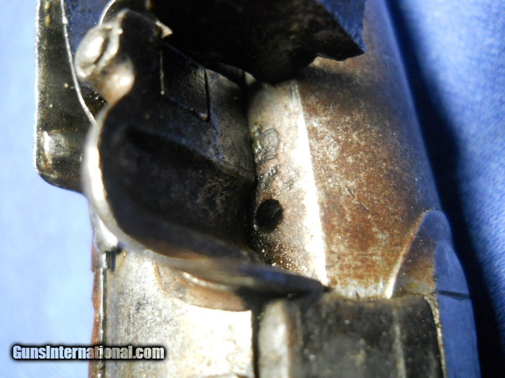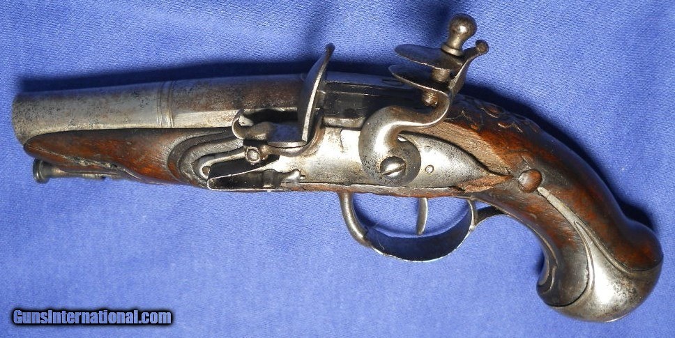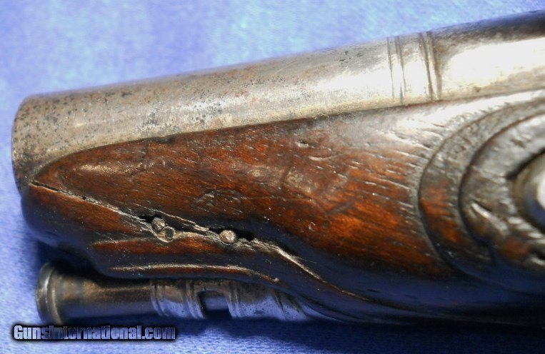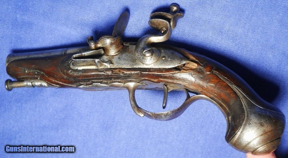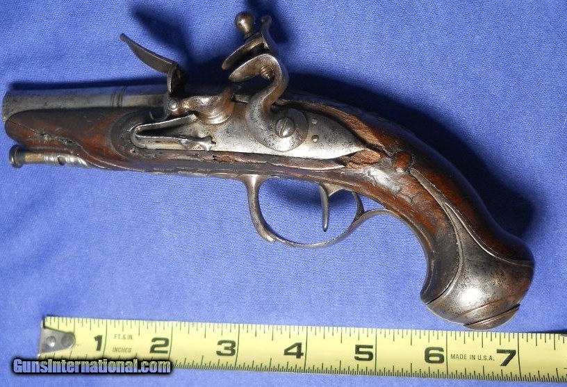 Description: SALE PENDING ! INTERESTING SMALL LATE 18th EARLY 19th CENTURY LEFT HAND FLINTLOCK POCKET PISTOL WITH ENGLISH PROOF. ORIGINAL FLINT (NOT RECONVERTED) ABOUT 7 1/2" OVERALL WITH .44 CALIBER 3 1/4" BARREL. ALL THE FITTINGS ARE IN THE WHITE WITH SCATTERED LIGHT STAINS AND JUST A LITTLE MINOR PEPPERING AROUND THE PAN & TOUCH HOLE. WALNUT STOCK RATES ABOUT GOOD WITH MISSING WOOD AROUND BACK OF LOCK & OTHER OLD DEFECTS THAT CAN BE SEEN IN PICS. STOCK IS RELIEF CARVED WITH ROSE & VINE REAR OF TANG. THE LOCK & FRIZZEN STILL FUNCTION CRISPLY. BRASS RAMROD OF CORRECT TYPE BUT LIKELY A REPLACEMENT. OVERALL A VERY NICE LITTLE PISTOL THAT MAY HAVE BEEN FOR A LADY or GENTLEMAN OF MEANS. PIECE IS BETTER IN HAND THAN PICS SHOW. I WILL INCLUDE AN OLD WALNUT GRIP OF SIMILAR COLOR FOR REPAIR IF NEEDED. $20.00 S&H ALL 50 WHERE OK. $35.00 INTERNATIONAL S&H INSURED WORLD WIDE WHERE ALLOWED. SOLD Antique: Yes |
