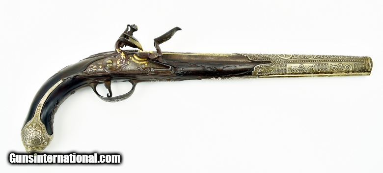 Description: European made (probably Italian) for export to Albania as was the Custom of Italy and Spain to export to Muslim countries at the time. The decoration such as the silver buttcap and barrel shroud are most likely done in Prizren which is in modern day Kosovo. Barrel is 11” long and has scrolling tendrils in chiseled relief. The gold on the barrel and cock and lock are also Prizren work. The sock lock and trigger guard and sideplate and barrel are Italian work in our opinion. Very good condition and very buy appealing. SOLD Antique: Yes |