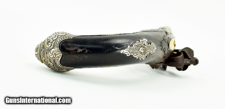 European made (probably Italian) for export to Albania as was the Custom of Italy and Spain to export to Muslim countries at the time. The decoration such as the silver buttcap and barrel shroud are most likely done in Prizren which is in modern day Kosovo. Barrel is 11” long and has scrolling tendrils in chiseled relief. The gold on the barrel and cock and lock are also Prizren work. The sock lock and trigger guard and sideplate and barrel are Italian work in our opinion. Very good condition and very buy appealing.