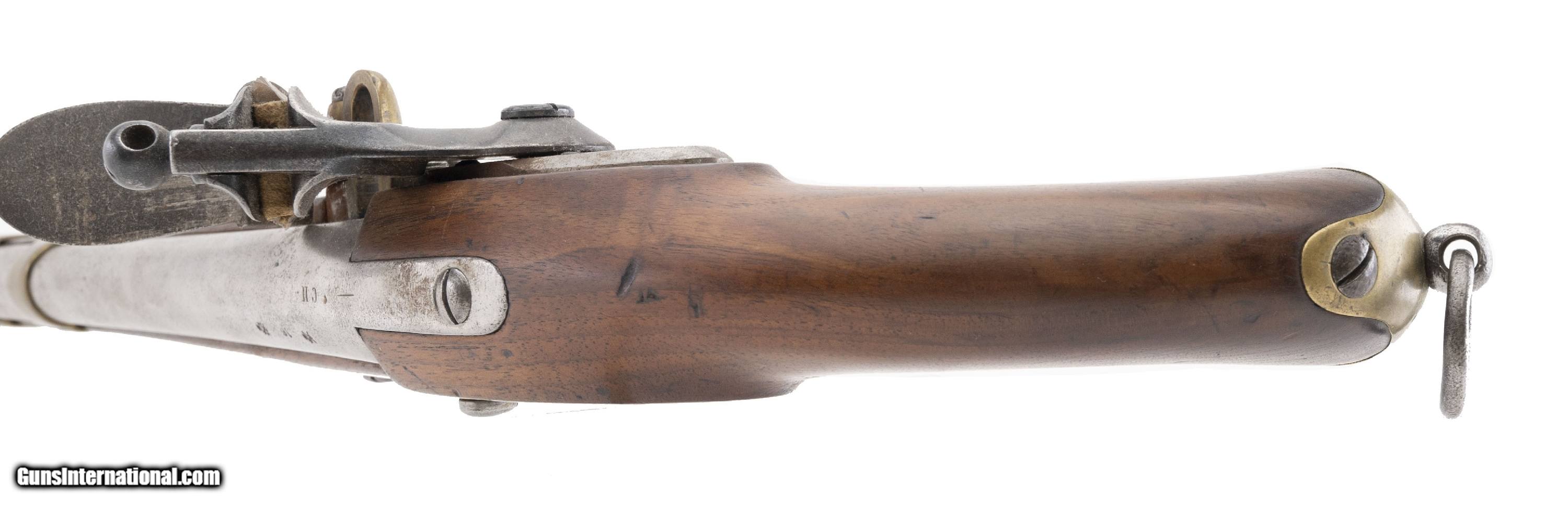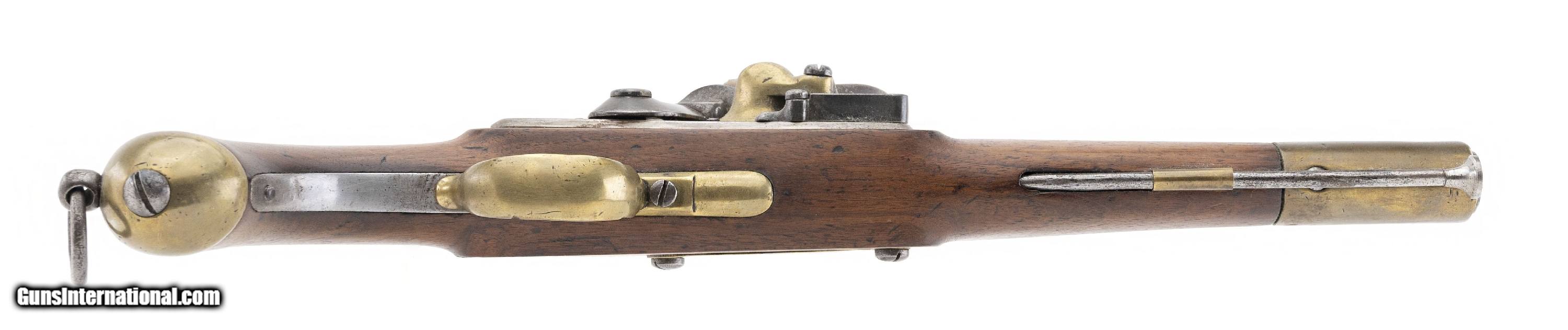 Description: "This pistol started as an Austrian Model 1851 tube lock cavalry pistol. About 1866, Austria sold a large number to gun firms in Belgium and England. This pistol was altered in England. Having a market for flintlock pistols in Africa and South America, the tube lock action Model 1851 pistols, for which there was no demand, were altered to flintlocks. This required a new hammer and frizzen and entailed a new Birmingham proofs and 16 gauge mark of the on the barrel at the time the alteration was done. The overall length is approx. 17"". The approx. 9 7/8"" round 67 caliber smooth bore barrel has an excellent bore. In addition to the Birmingham proofs the top of the barrel is marked CII. The barrel is bright with light freckling. The lock has the Austrian Vienna proof mark at the tail and 853 (1853) at the center. The lock and hammer are bright with light freckling. Unlike the Belgian altered guns, the Birmingham pistols feature a brass pan and reinforced hammer. The brass nose cap, trigger guard, butt cap with swivel and ring, and side plate have an even aged patina. The stock is fine with sharp edges, no cracks or chips, and very light usage wear. The ramrod is present. The action functions correctly. Not many guns were back-altered from percussion to flintlock. Don't miss this unusual Birmingham-altered pistol! Antique: Yes Price: $2,150.00 Contact Seller |