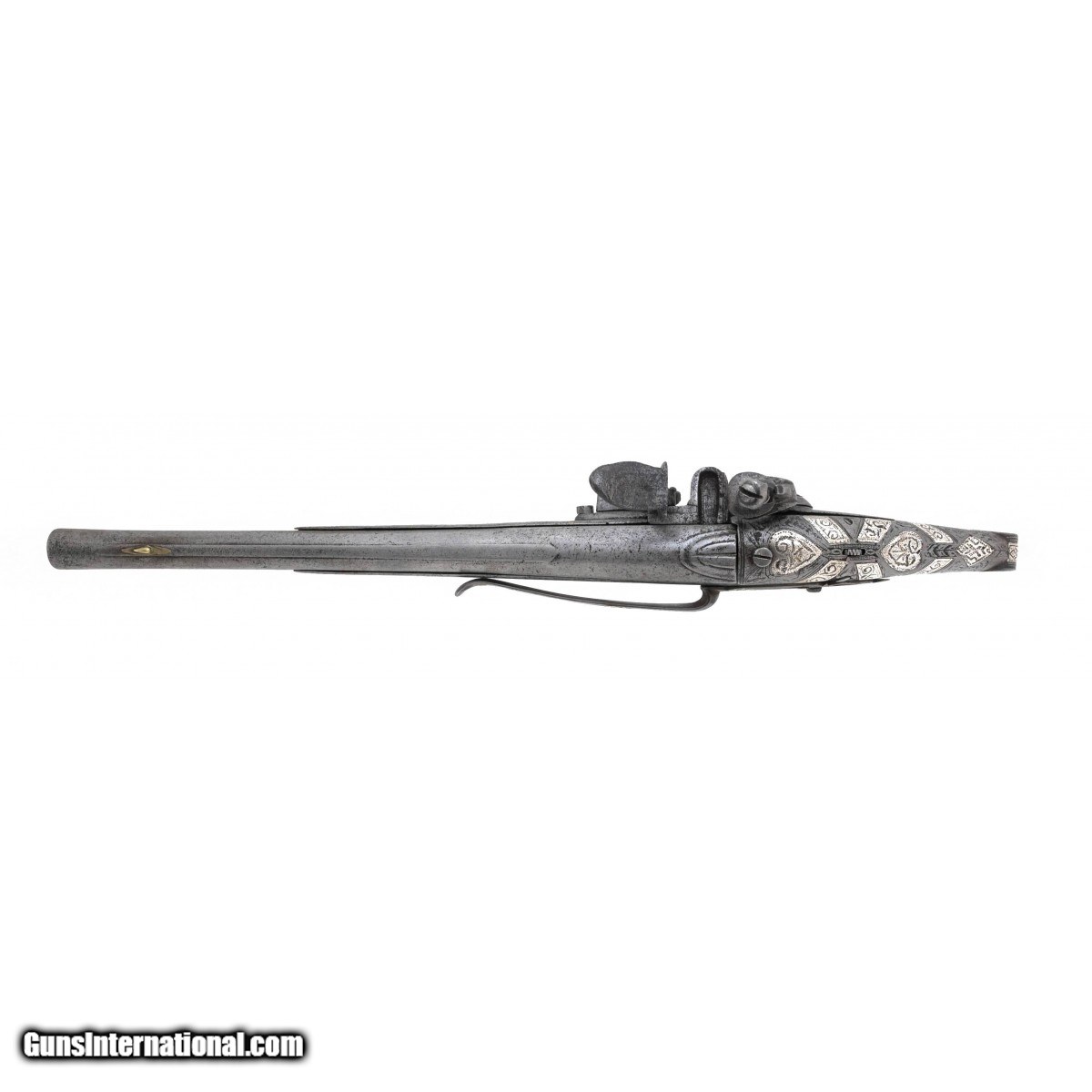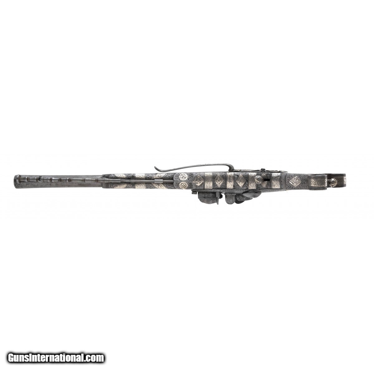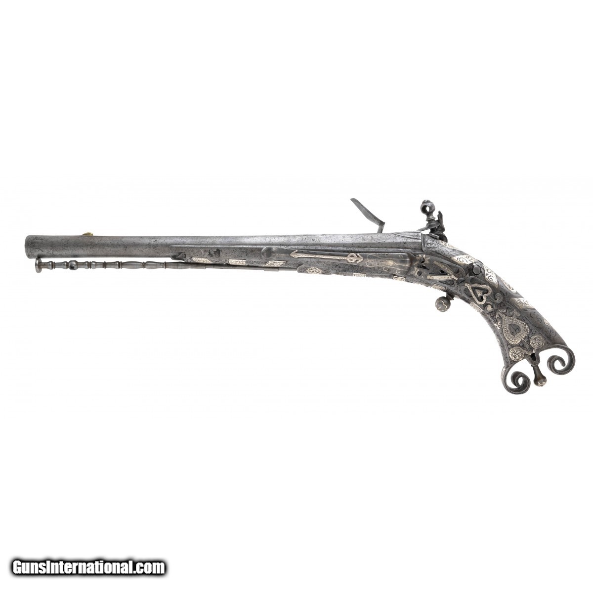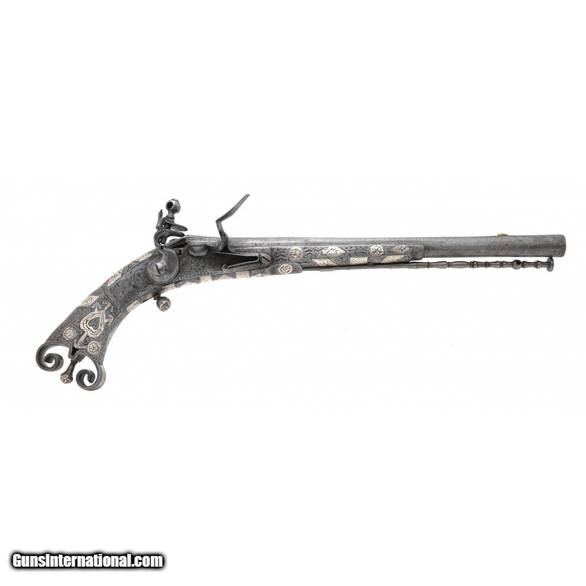 Description: "Made circa 1700. 58 caliber bore with a 12" barrel. This is a massive example of a Scottish Pistol with an overall length of 18". Barrel has been cleaned. Metal stock is silver inlayed and engraved. The Lock is marked “JOHN CAMPLL" John Campbell was one of the early Doune maker. This gun has a rams horn butt. Absolutely wonderful gun and among the rarest we have ever owned! SOLD Antique: Yes |
