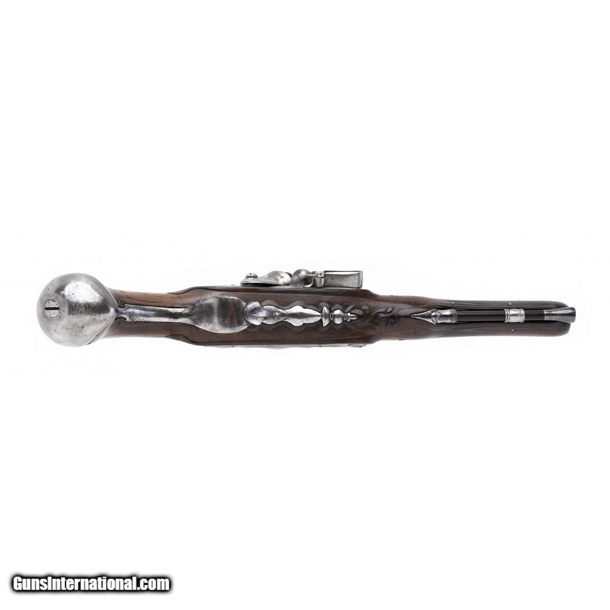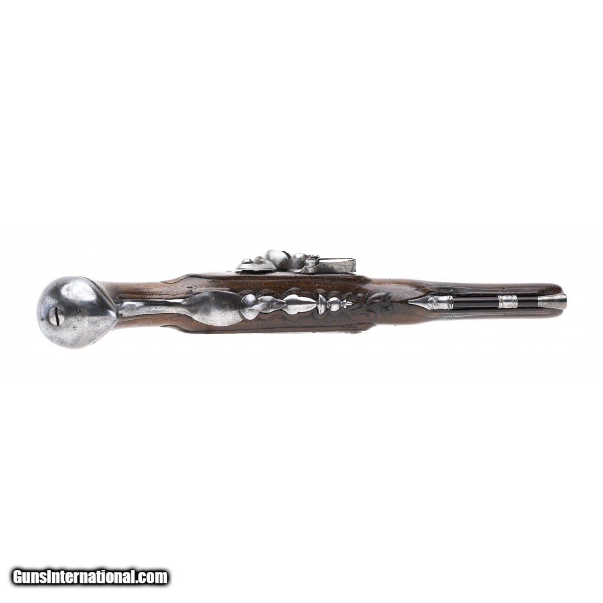 Description: "Made circa 1770 in St. Etienne, France. Antoine Dumarest worked between 1750 and 1783. 52 caliber with 6" barrels. Barrels are damascened with 70% of the gilding. Stocks are excellent with very fine relief Rosettes behind the tang and silver escutcheons. The overall length of each pistol is 12". Beautiful pair made during the American Revolutionary war pistols! SOLD Antique: Yes |