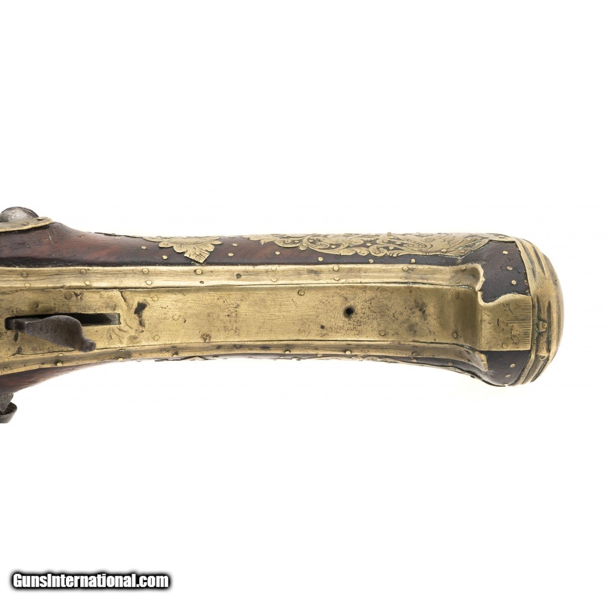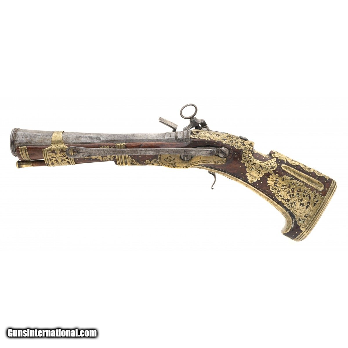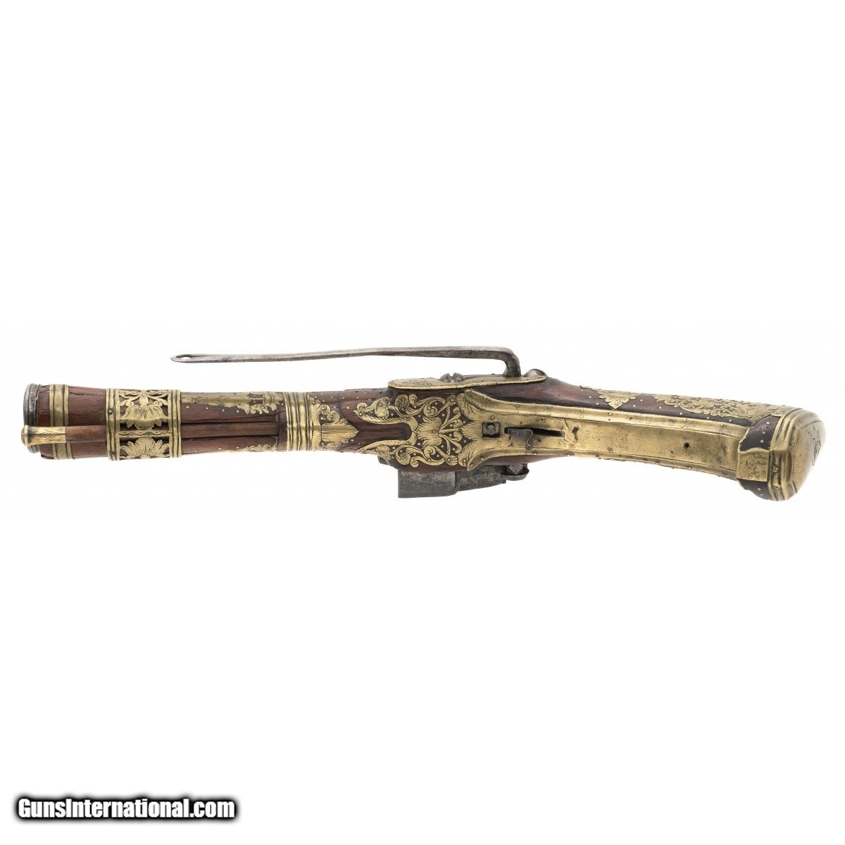 Description: "Made circa 1750. 1 ½" bore with a 9" barrel. Very fine large example of a Migulet blunderbuss pistol. This gun is in the classic ripol style. The wood has extensive brass inlays that consists of scrolls with birds, flowers and along with grotesque faces. Small brass tacks also adorn the wood. We believe this gun has a chance of being Mexican because of the themes of the inlays that we have seen on other Mexican Ripol style guns The lock is engraved and the Frizzen is marked “Sn HCER" There is a name on the top of the barrel, but it is illegible. SOLD Antique: Yes |