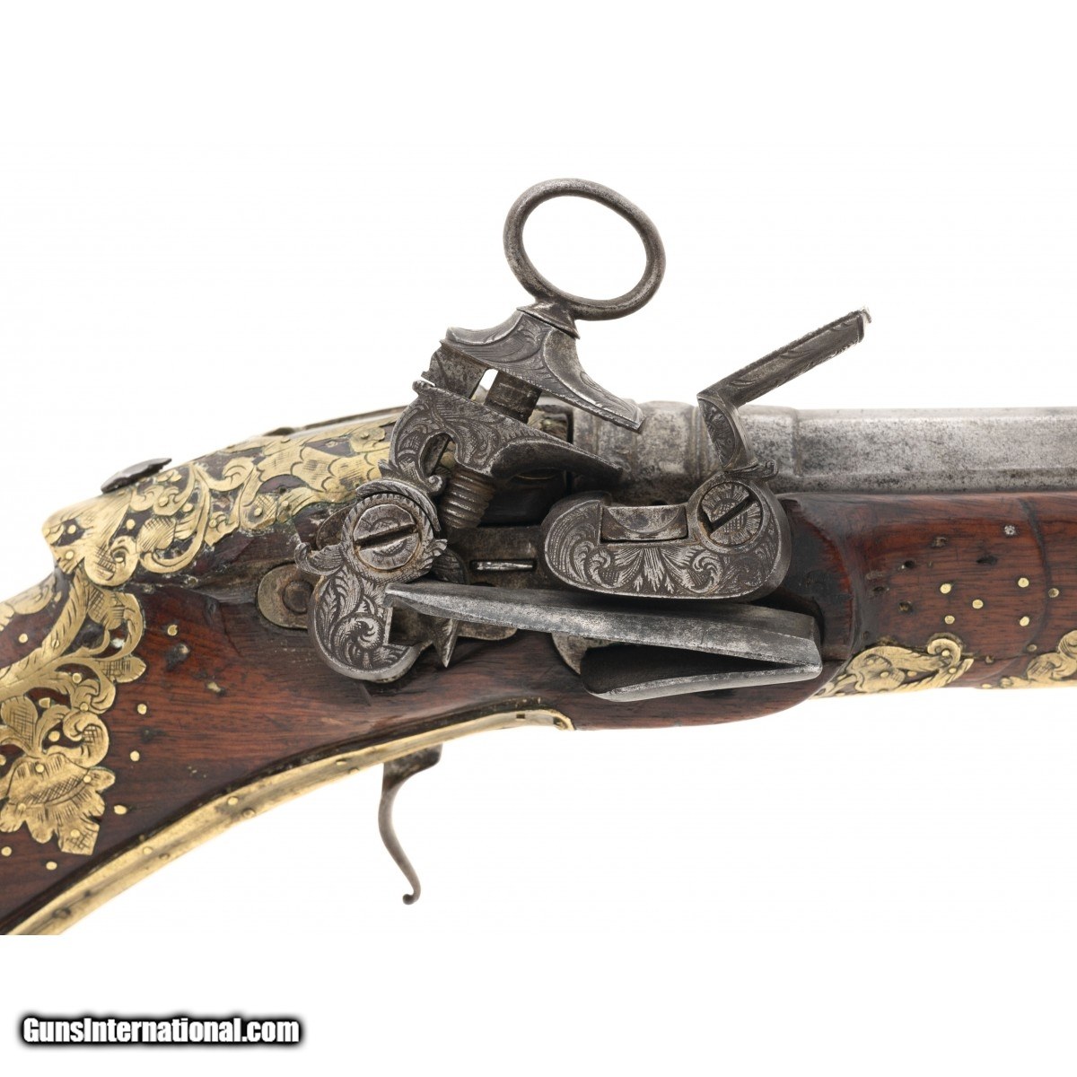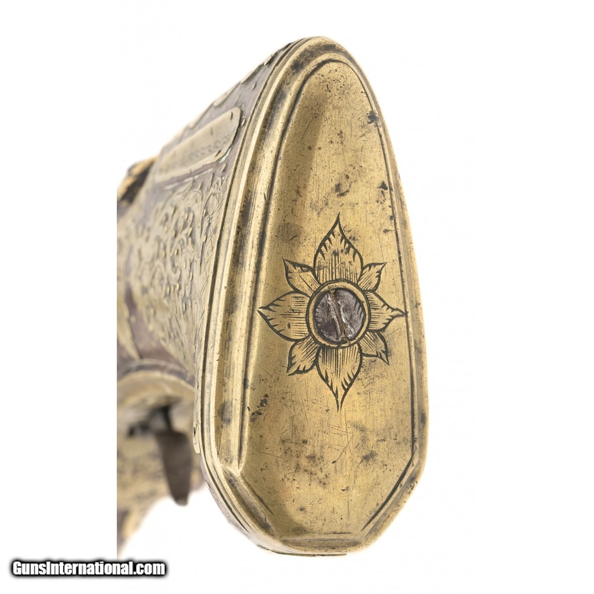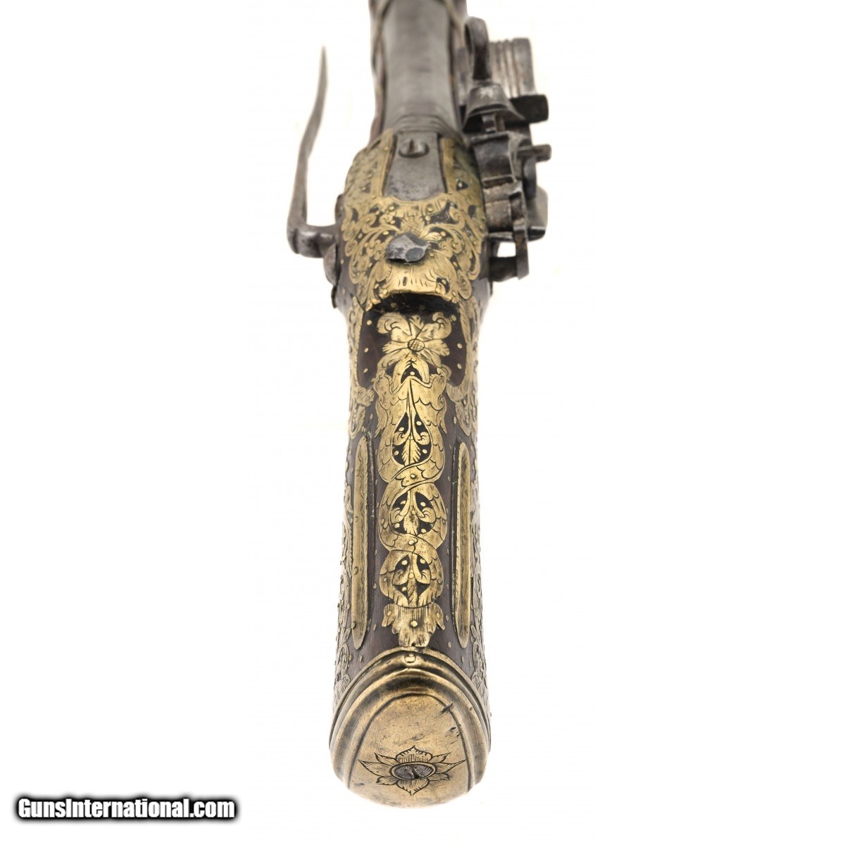 Description: "Made circa 1750. 1 ½" bore with a 9" barrel. Very fine large example of a Migulet blunderbuss pistol. This gun is in the classic ripol style. The wood has extensive brass inlays that consists of scrolls with birds, flowers and along with grotesque faces. Small brass tacks also adorn the wood. We believe this gun has a chance of being Mexican because of the themes of the inlays that we have seen on other Mexican Ripol style guns The lock is engraved and the Frizzen is marked “Sn HCER" There is a name on the top of the barrel, but it is illegible. SOLD Antique: Yes |