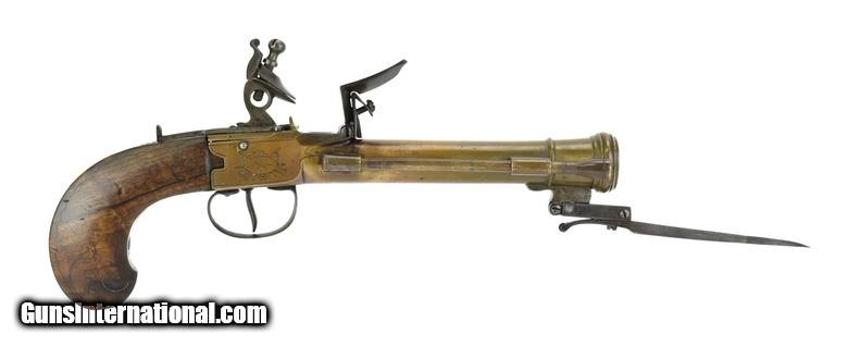 Belgian, Liege Flintlock pistol with spring bayonet (dagger) by Guillaume Berleur of Liege. Worked 1780-1840. Barrel length 6.5" and overall length 11.5". Barrel has a cannon flared muzzle. Barrel measures one inch at muzzle. This pistol has a most attractive untouched patina with deep color. Spring bayonet is 5" length. Stock has silver wire inlays. Action and sliding safety work perfectly. Very fine overall condition.