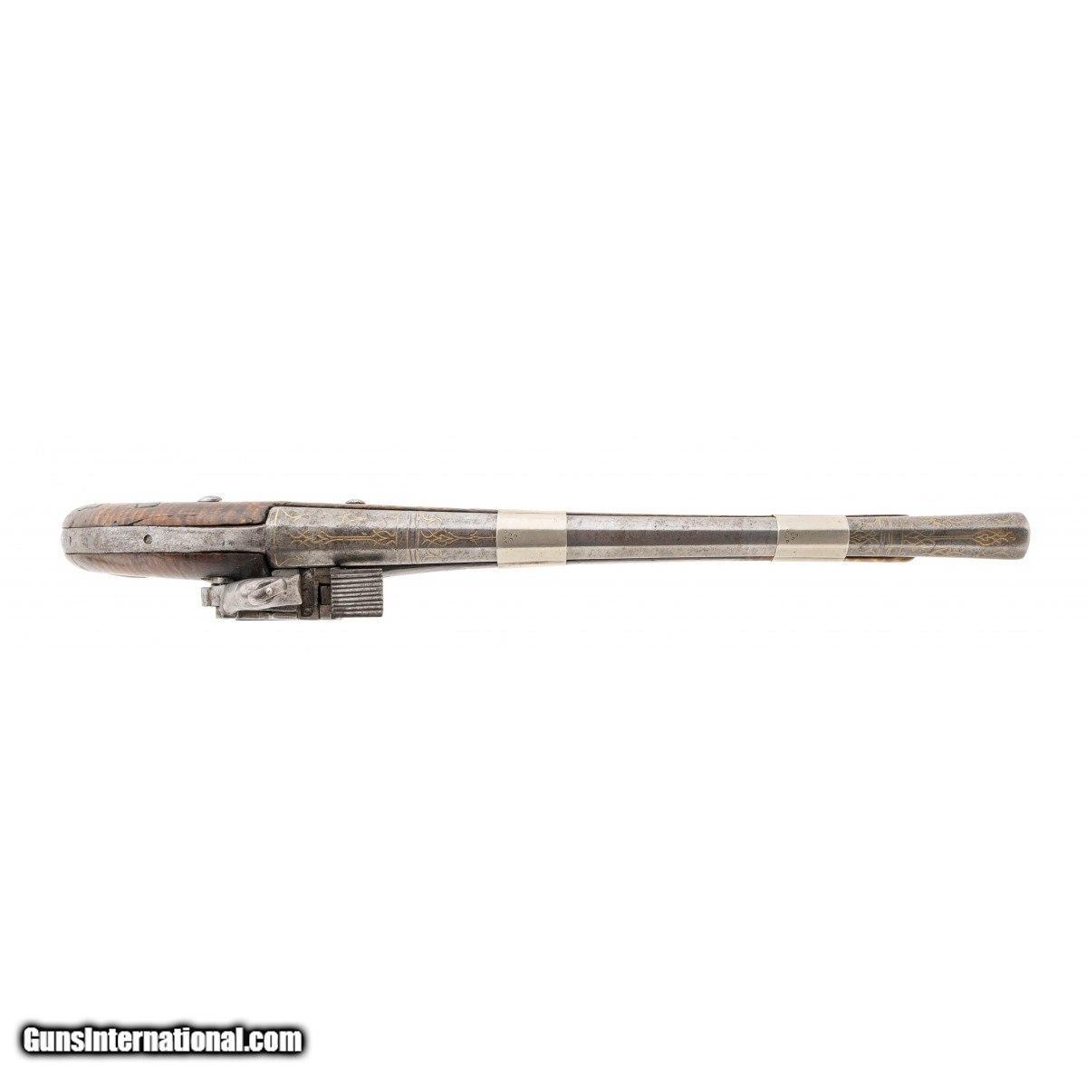 Description: " Caucasian Miguelet Lock Pistol. Barrel length 17 ¾" and 16" overall length. Barrel has gold wire inlay, NOT BRASS. We tested it. Miguelet Lock works fine and is not hard to cock as most Caucasian pistols. Butt cap is deeply chiseled in rococco to scrolls with a silver cameo of a robed figure holding a lance. Stock is very good plus. Very fine example of a Caucasian pistol. SOLD Antique: Yes |