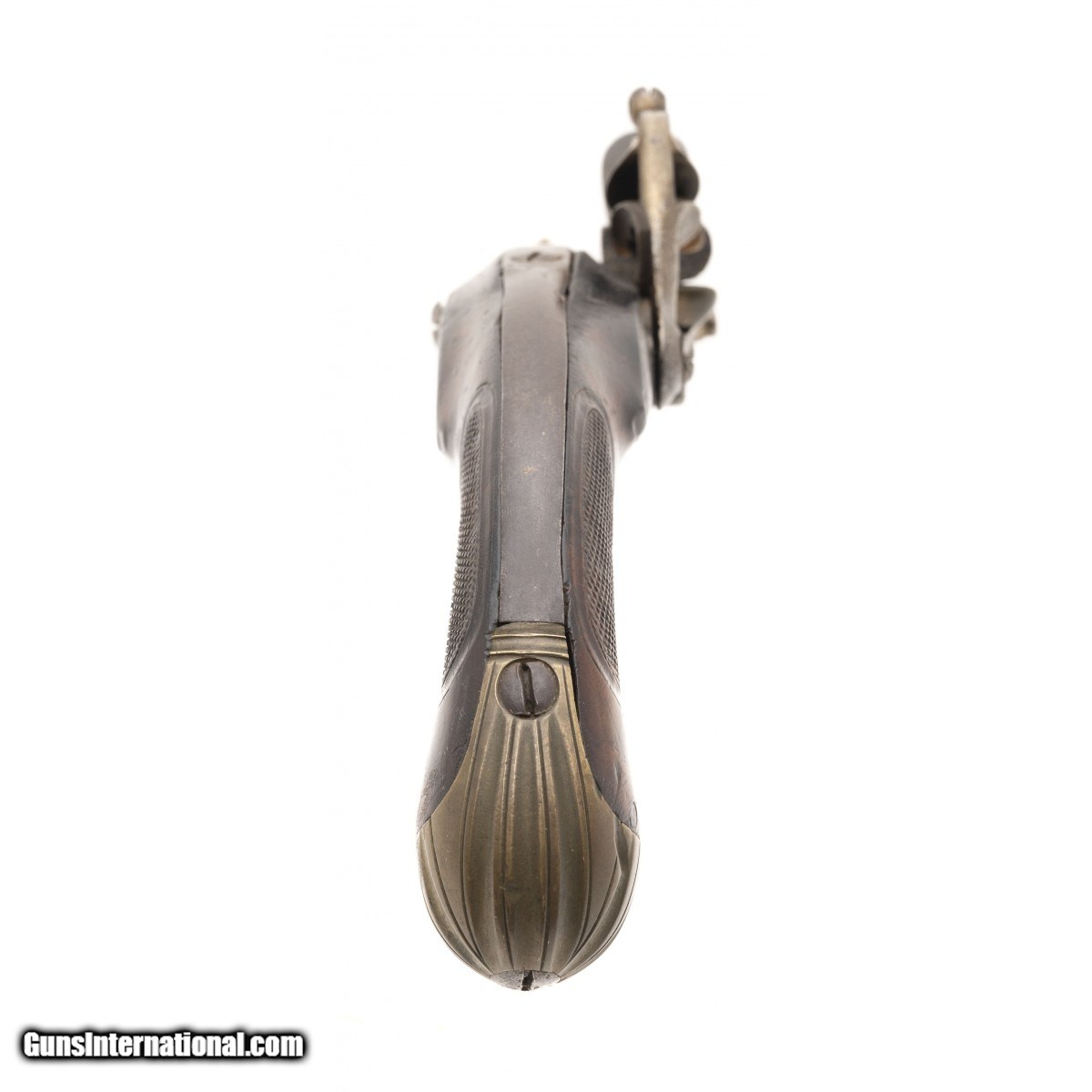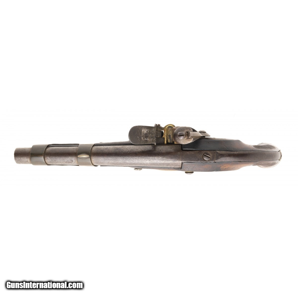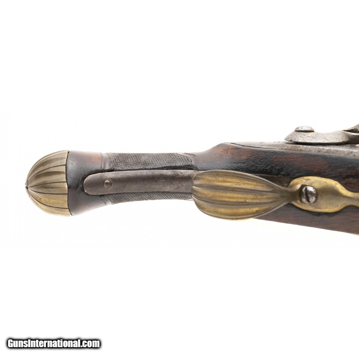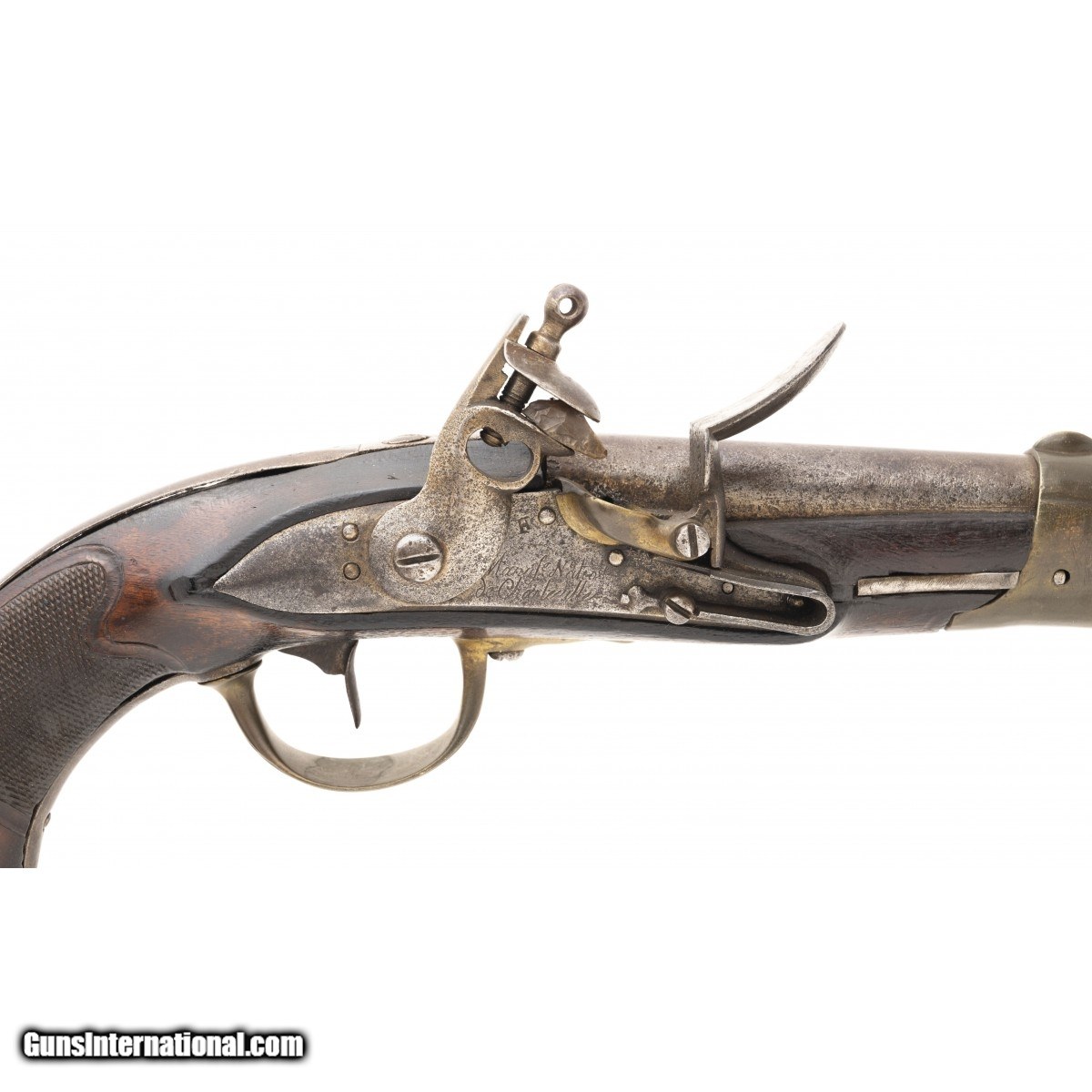 Description: "Similar to a 1763 pistol, but not quite a 1763. This gun looks to be assembled and may be an officer’s pistol. The lock is a military Charlesville lock as is the front barrel band and barrel. The stock has been checkered and the trigger guard and butt cap have been replace. Very attractive French Military gun! SOLD |