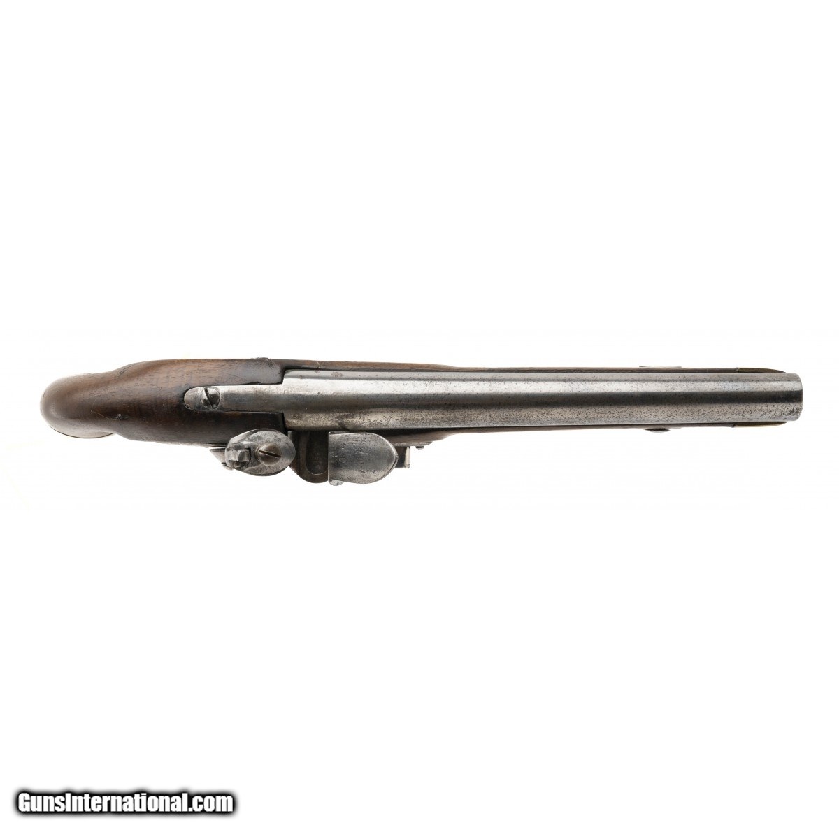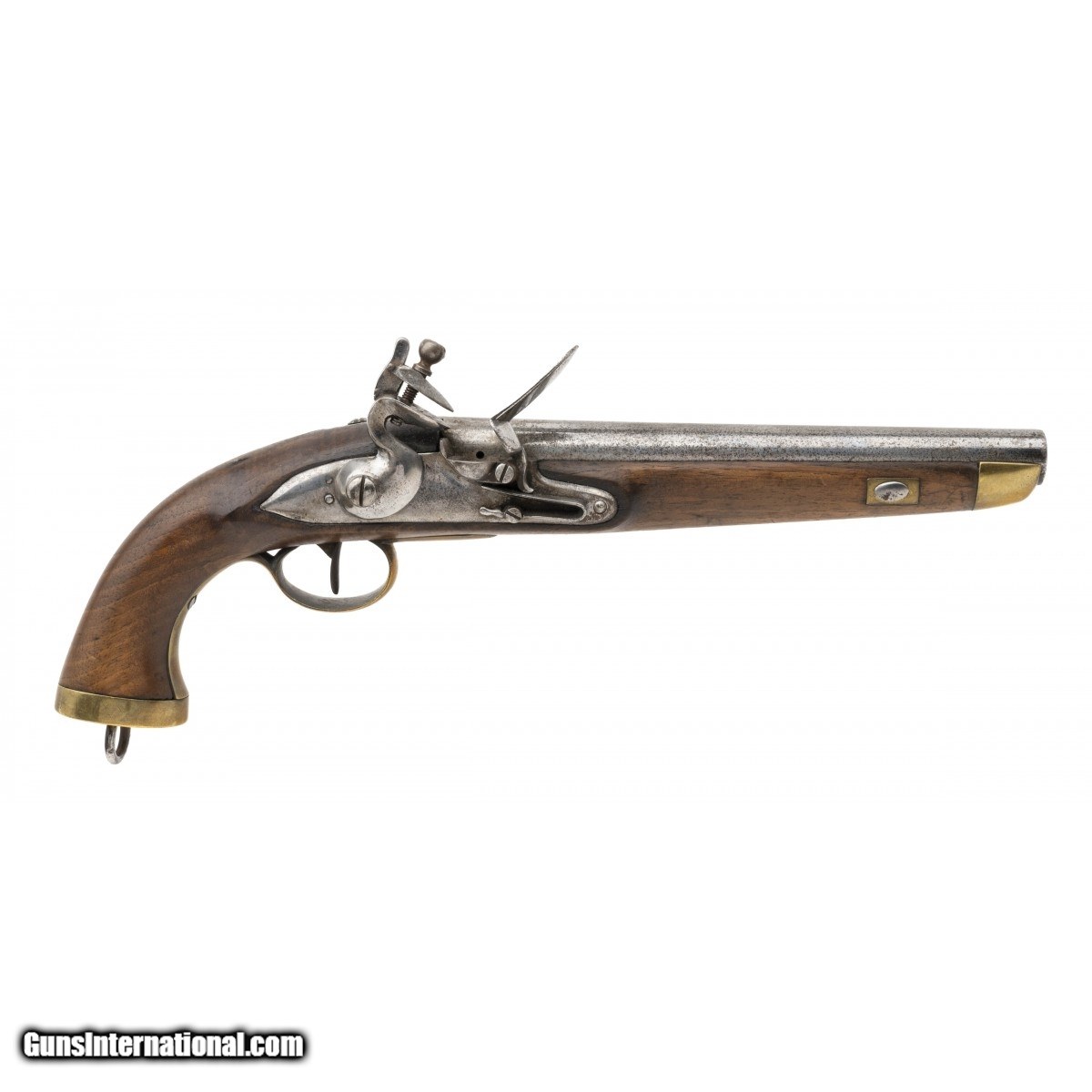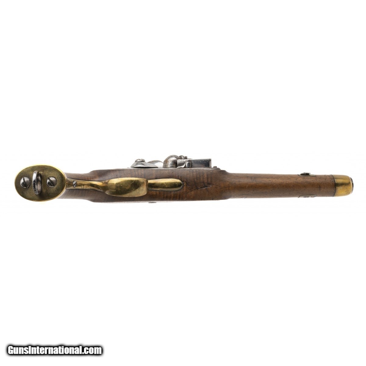 NSN, circa 1820's-1830's, .70 caliber, 9"" round smoothbore barrel. Barrel and other iron parts are in the bright with scattered pin-prick surface oxidation visible. Lock plate has a faint ""DN"", meaning DELFT NEDERLANDS"". Brass furniture has a bright antique finish. Stock has light handling wear with surface crack noted on the left side. Action holds at half and full cock. Consignment.
