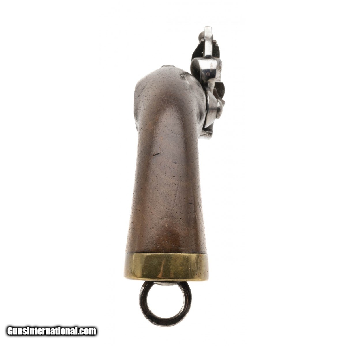 Description: " NSN, circa 1820's-1830's, .70 caliber, 9"" round smoothbore barrel. Barrel and other iron parts are in the bright with scattered pin-prick surface oxidation visible. Lock plate has a faint ""DN"", meaning DELFT NEDERLANDS"". Brass furniture has a bright antique finish. Stock has light handling wear with surface crack noted on the left side. Action holds at half and full cock. Consignment. SOLD |