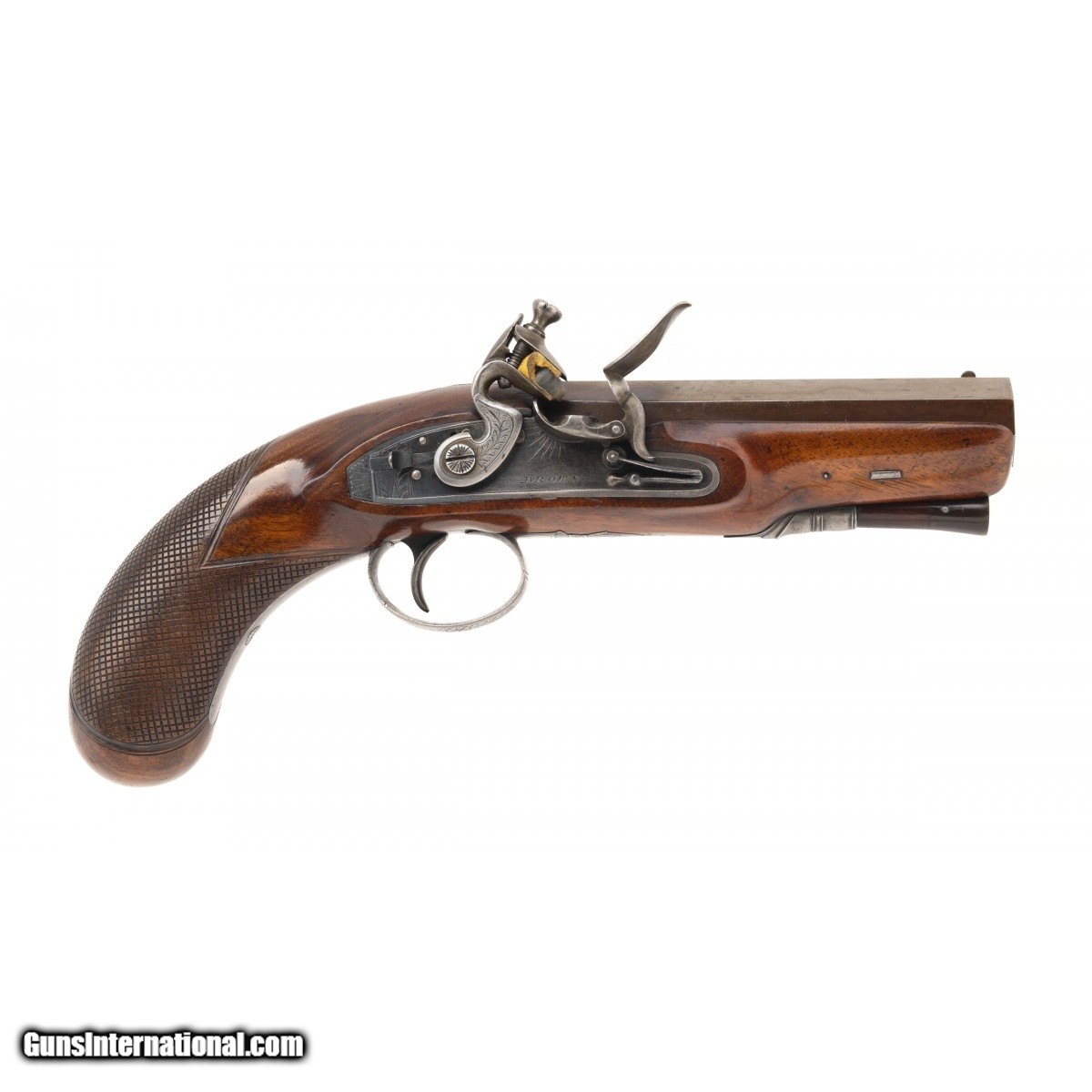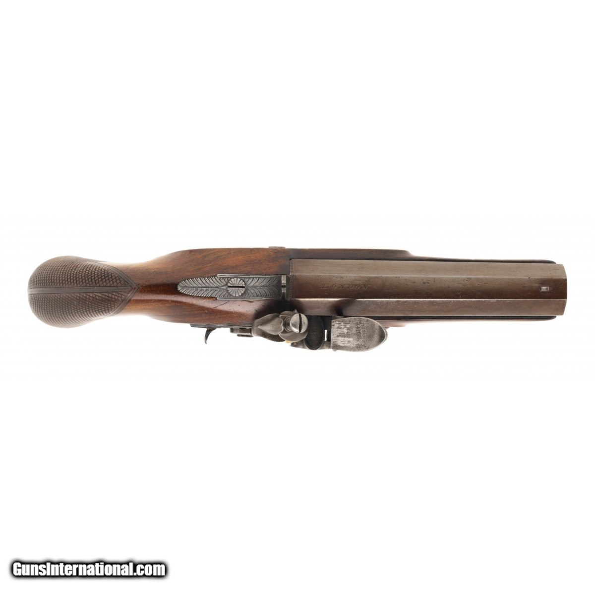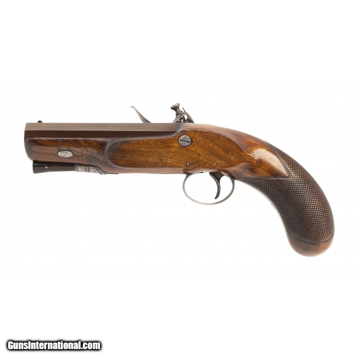 Brown of London flintlock pistol. Pistol has a double bridled pan and has a roller frizzen. Lock has a sliding safety for the cock. Barrel length is 5"" and overall length is 10"". This large bore pistol is sometimes referred to as a great coat pistol. The pistol is in excellent condition. This pistol was manufactured circa 1815-1820. Beautifully made and in top condition!