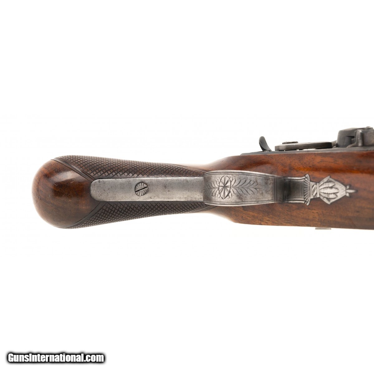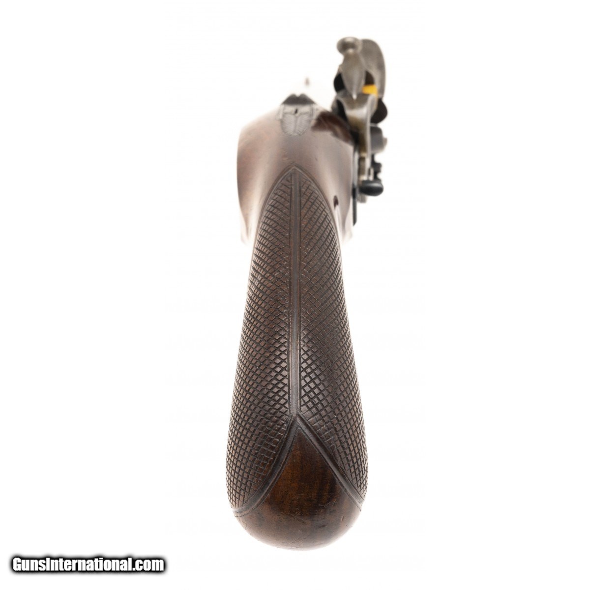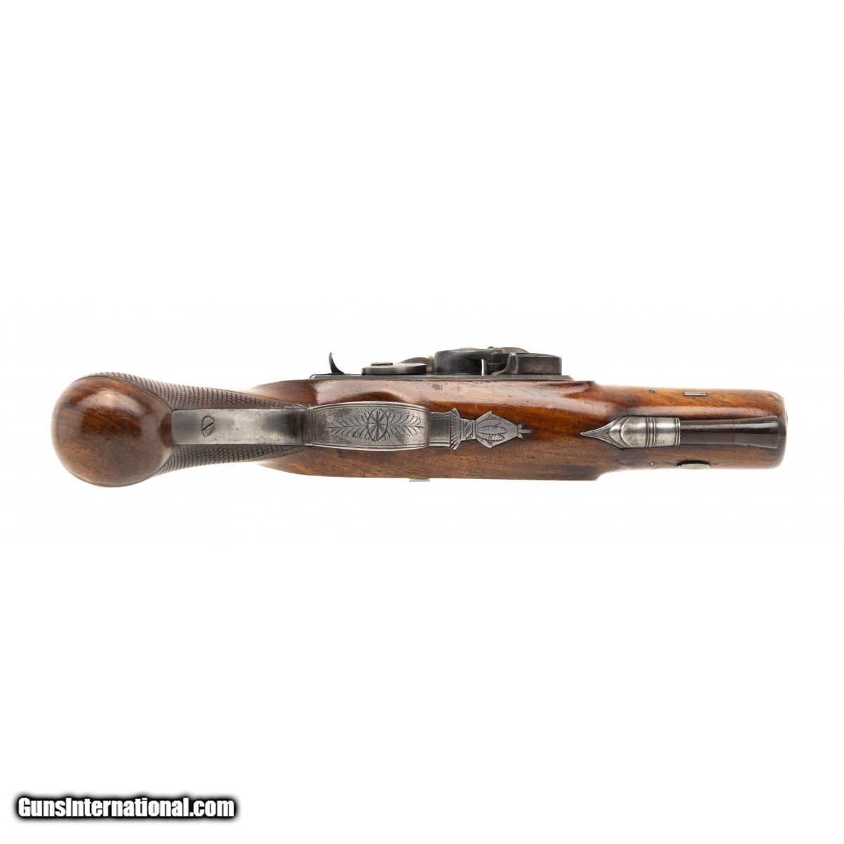 Description: " Brown of London flintlock pistol. Pistol has a double bridled pan and has a roller frizzen. Lock has a sliding safety for the cock. Barrel length is 5"" and overall length is 10"". This large bore pistol is sometimes referred to as a great coat pistol. The pistol is in excellent condition. This pistol was manufactured circa 1815-1820. Beautifully made and in top condition! SOLD Antique: Yes |