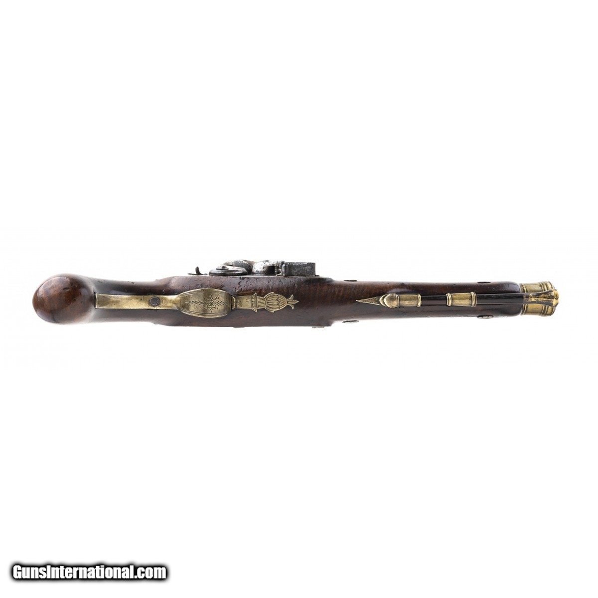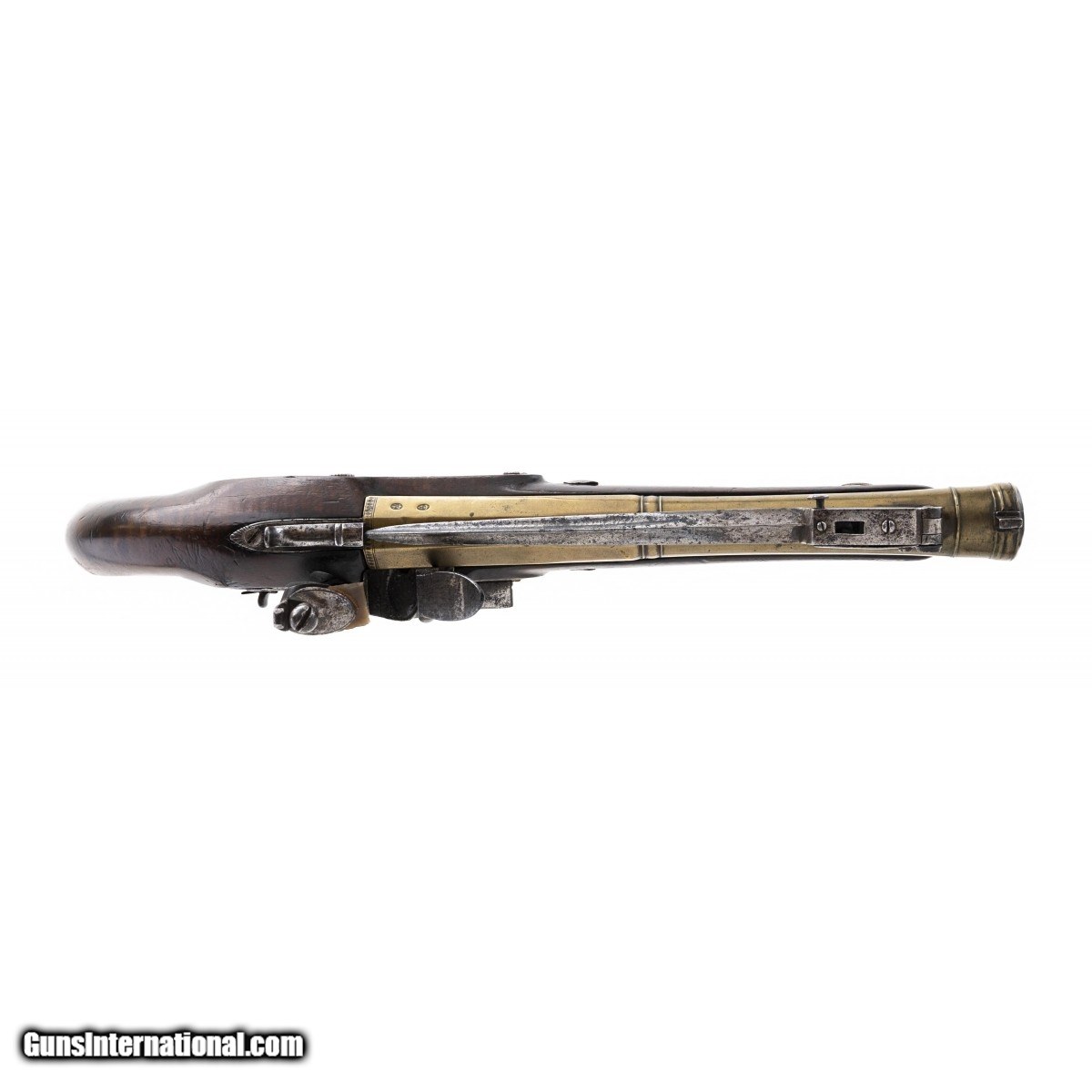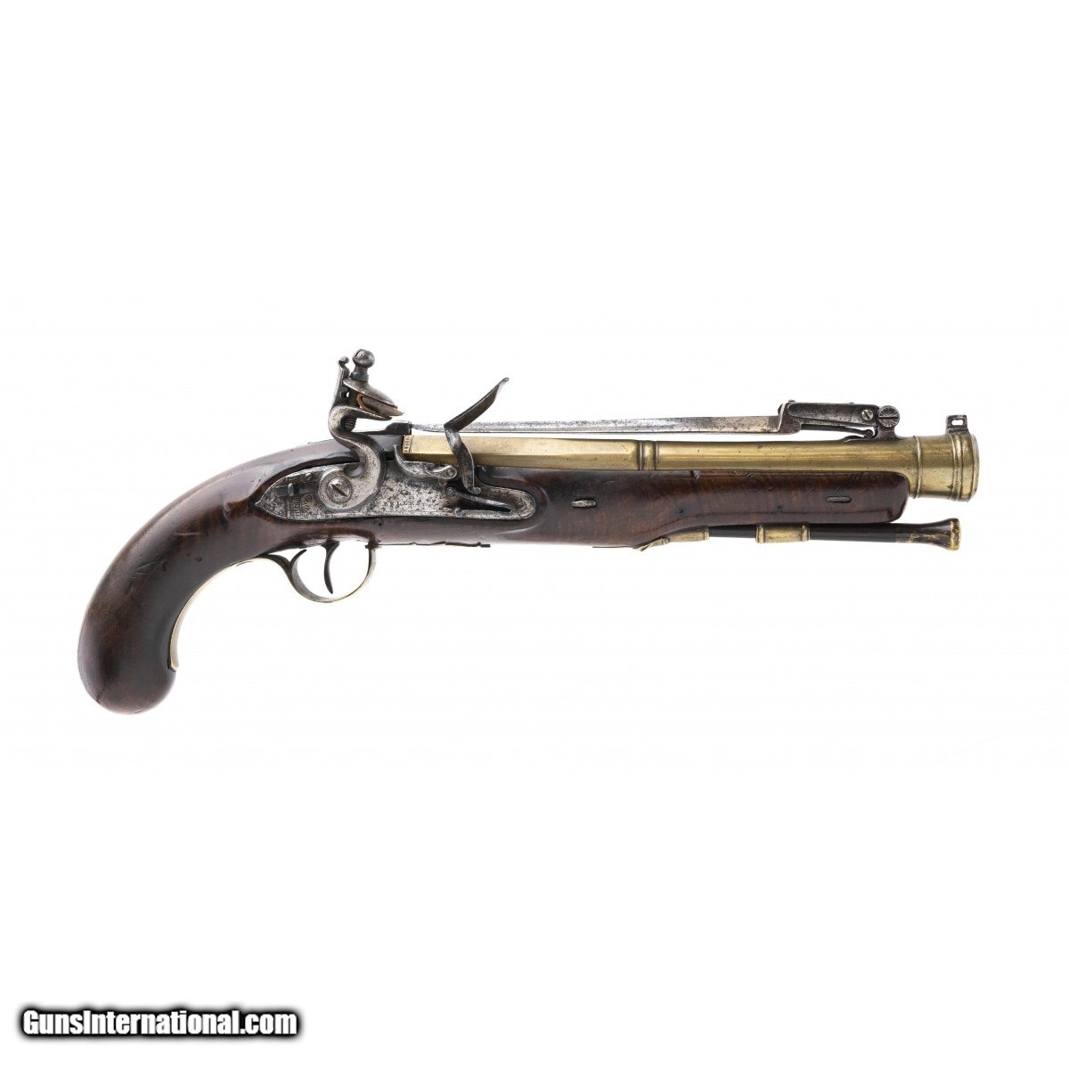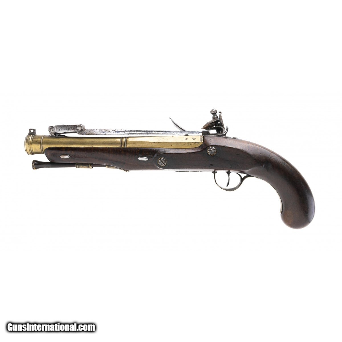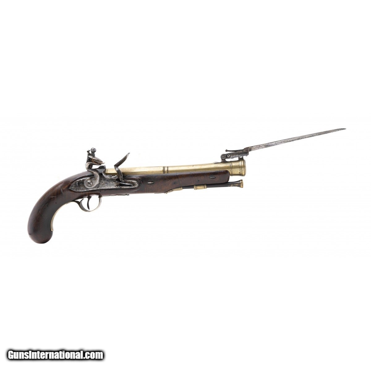 Description: "Circa 1815. Approximately 77 caliber with a 8 ½" barrel. Lock is marked Belles. Barrel is brass with a nice patina. The top of the barrel is marked “LONDON" and there are English proofs on the side. Bayonet has some pitting. Wood is excellent. Action works perfectly. Very rare gun with the flip bayonet! SOLD Antique: Yes |