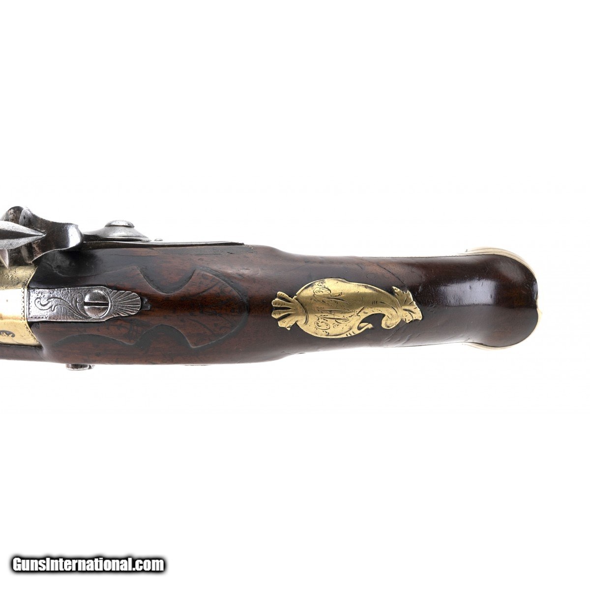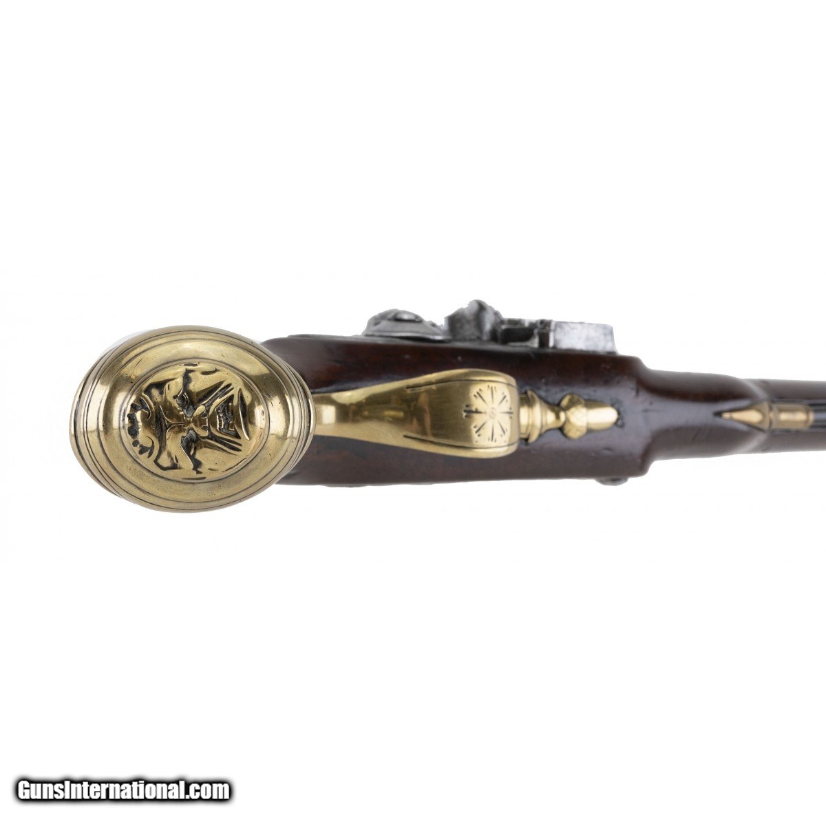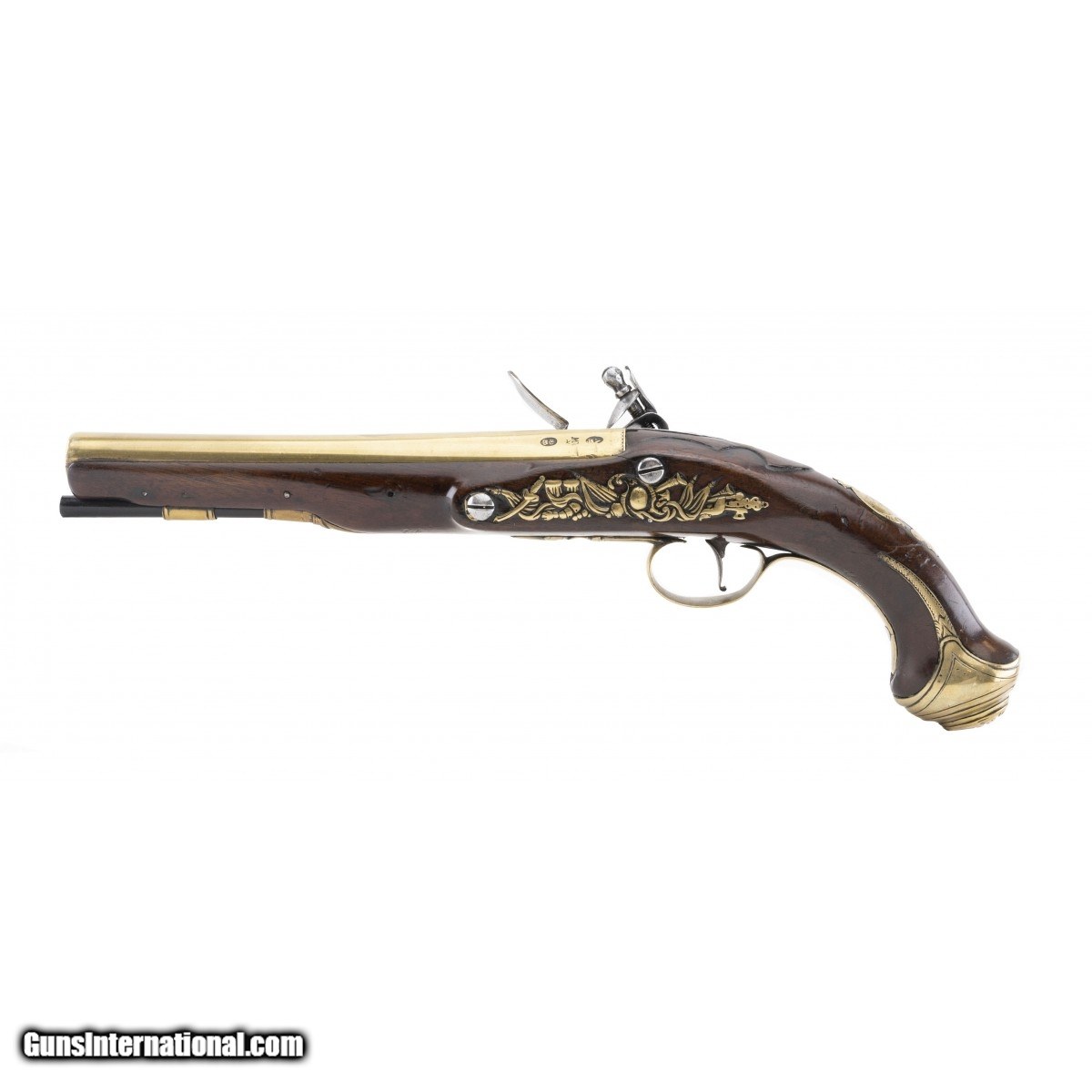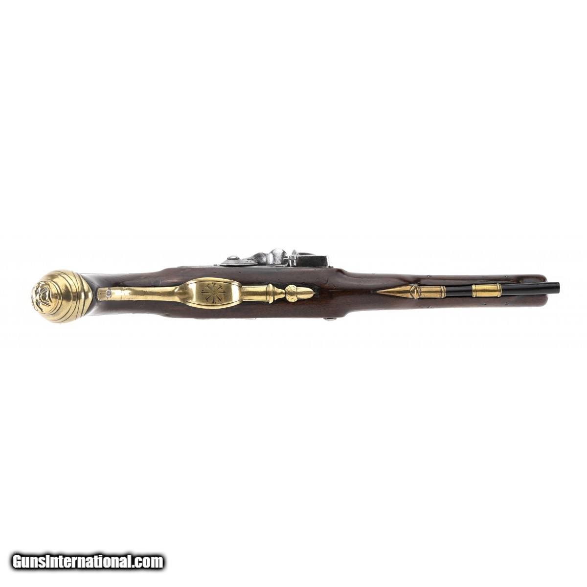 Description: " Lock is marked ""Wilson"". Barrel is marked ""Minories London"". Barrel is 8 1/8"" and overall length is 14"". The side plate is an expansive array of a panoply of arms including, sabre, flags, drums, bugles and axe. The mounts are all of brass. The brass plate inlaid on the stock at the wrist is engraved with the letters ""HP"". The long ear butt cap has a grotesque mask in high relief. The trigger guard bow is engraved and the trigger guard finial is of an acorn as is often seen on pistols of this period. The pistols of this period and form are referred to as ""Georgian Pistols"". Reflecting the rule of King George III 1760-1820. The brass parts all have a matching beautiful untouched patina. The wrist has a very old repair that is not readily noticeable. Overall this is a very attractive Georgian Pistol. SOLD Antique: Yes |