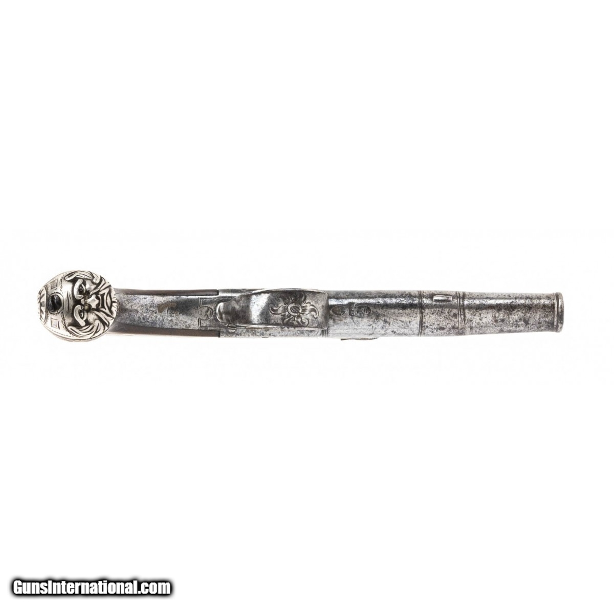 Georgian period (King George III) flintlock pocket pistol. Butt cap is a silver grotesque mask and the stock has fine silver wire inlays. Turn off barrel has London proofs. Action works properly. An elegant pocket pistol!