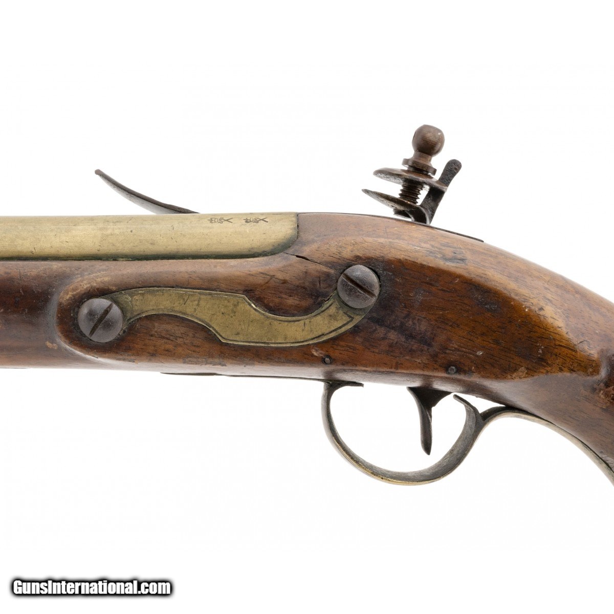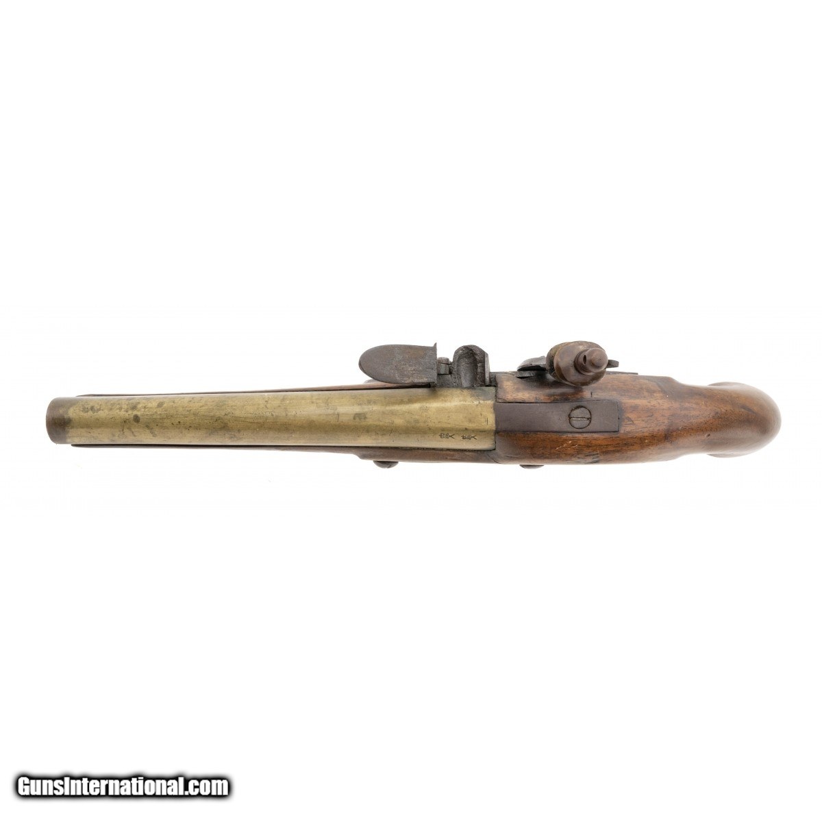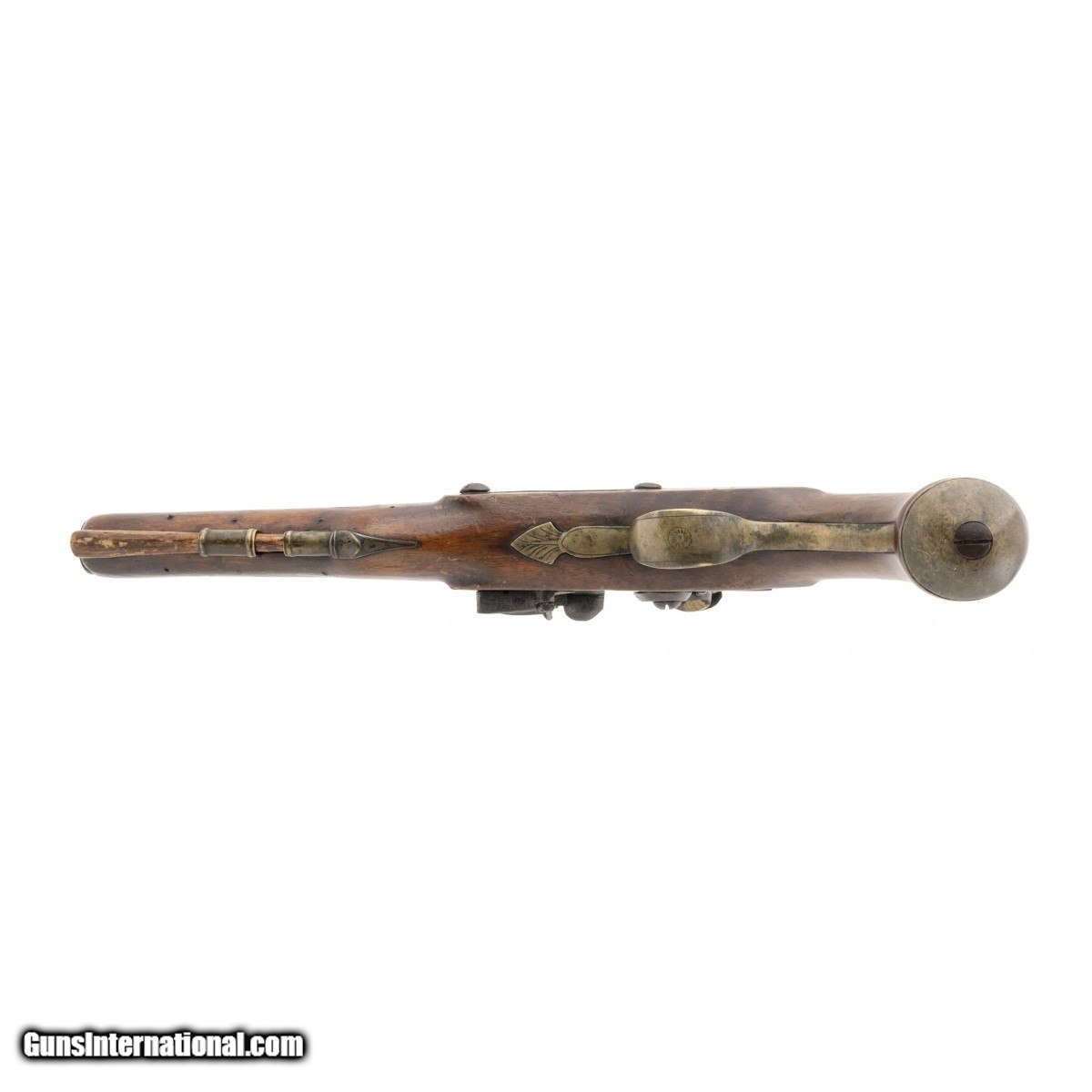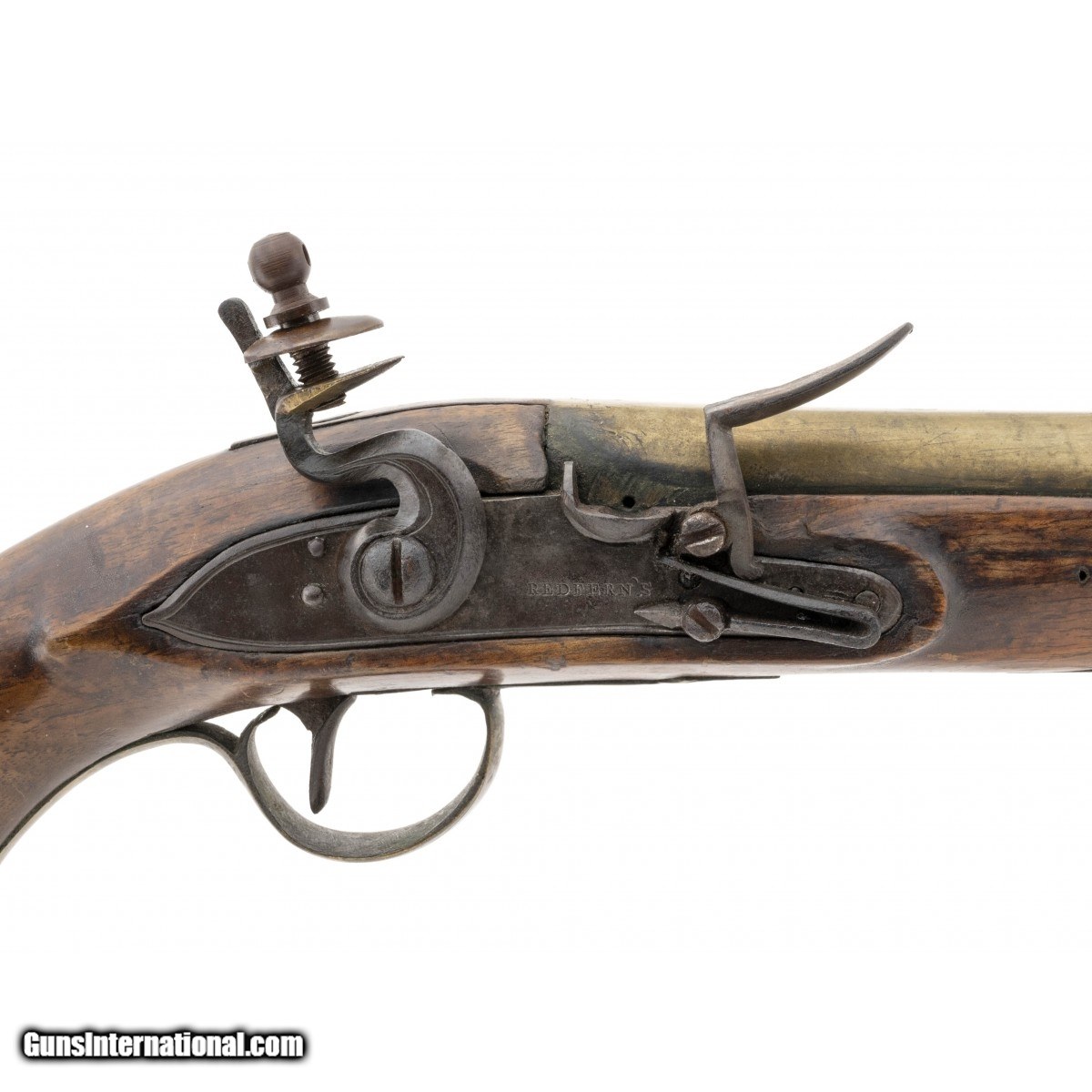 English Made Flintlock Pistol In The Style of a Cavalry or Militia Pistol by Redfern. Birmingham barrel proofs. These are very similar to Ketland Trade pistols associated with the American-Canadian Fur Trade. Very good untouched condition. Barrel length 8" and approximately 14" overall. Bore is approximately .69 caliber. Very nice example of a fur trade pistol.
