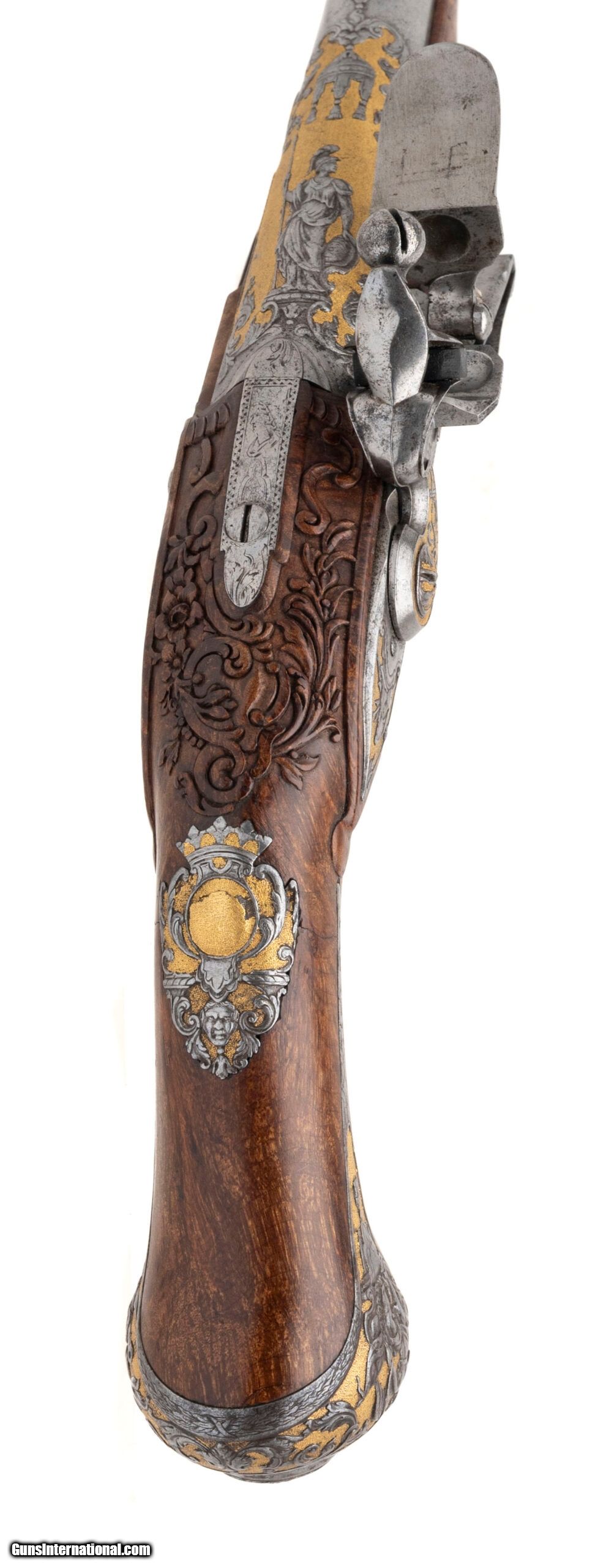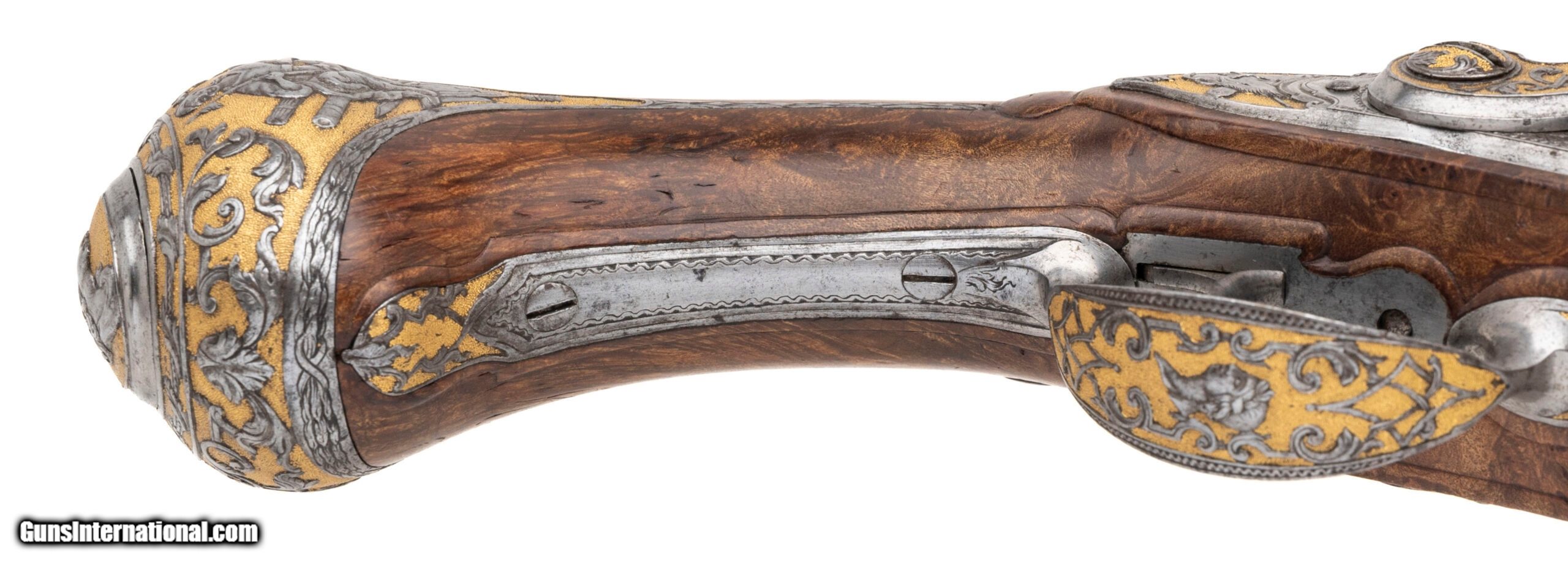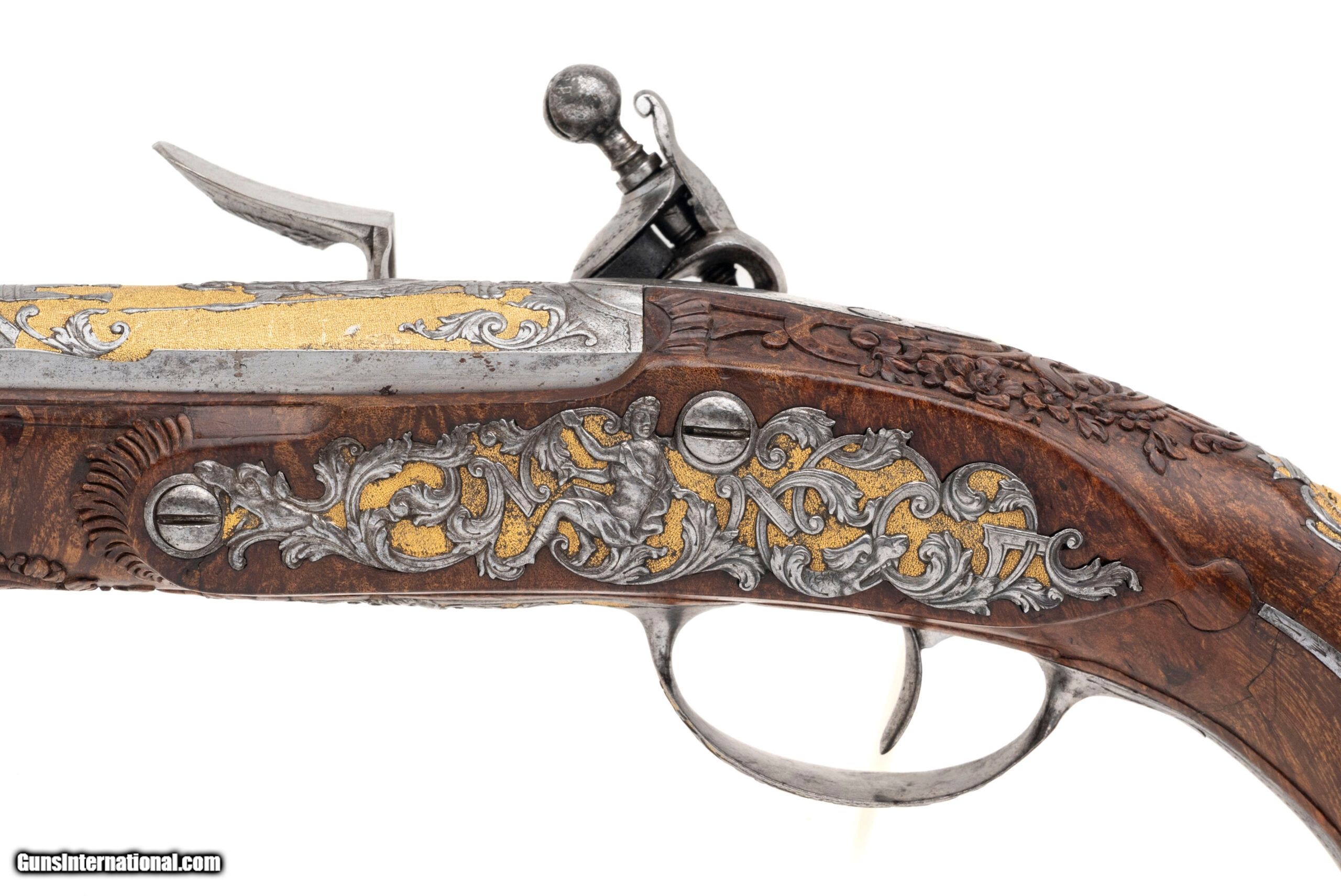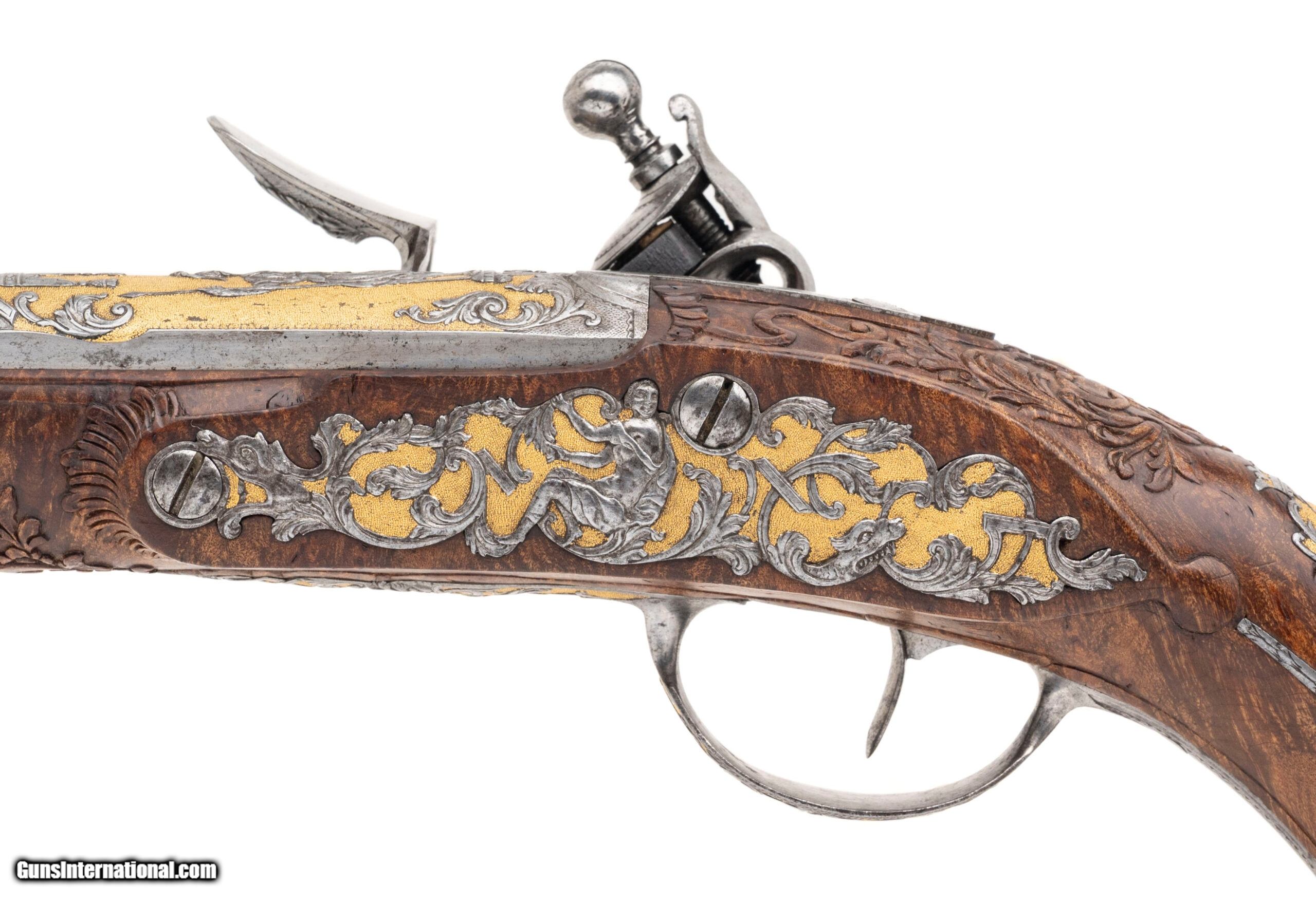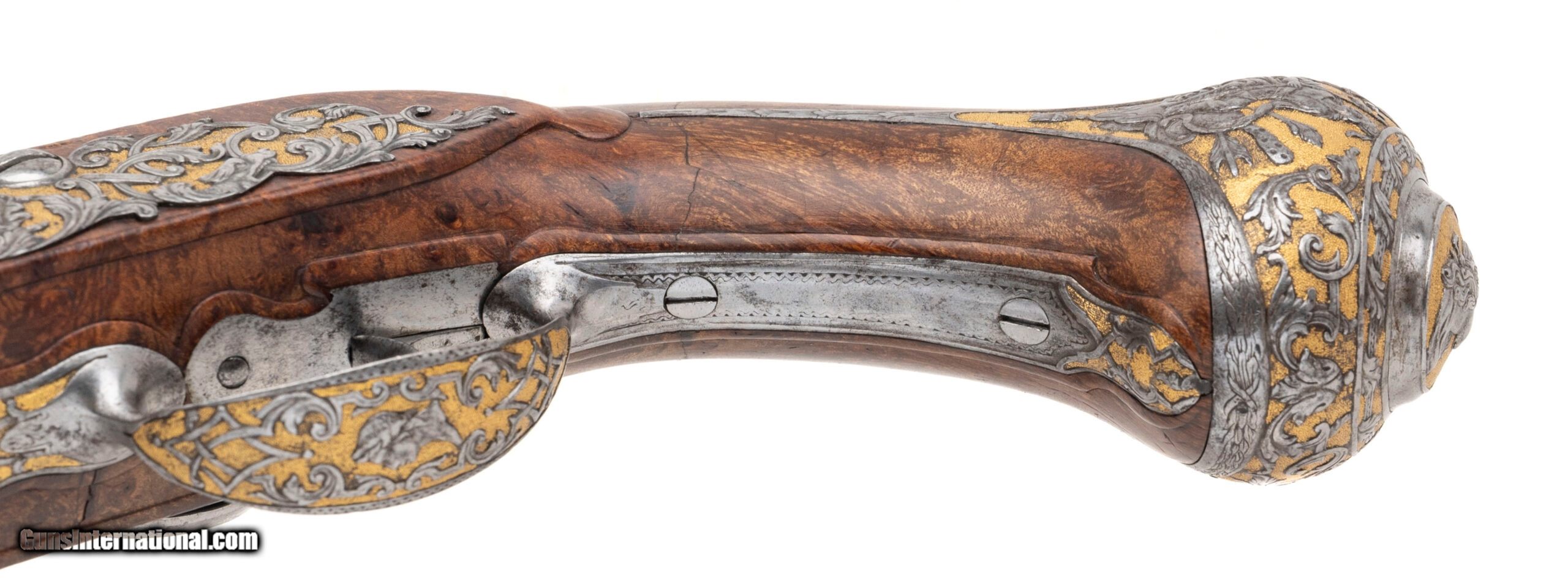 Description: "Maker: Henry, Vesoul (Franche-Comté, France) Date: Circa 1755-1775 (Louis XV period) Type: Pair of deluxe flintlock pistols from a garniture set Description This is an outstanding matched pair of French flintlock pistols of the highest artistic and technical quality, signed on the locks “Henry à Vesoul." The pistols represent elite late-18th-century French court workmanship and were originally part of a multi-piece garniture, traditionally said to have included a matching long gun. Both pistols feature beautifully carved walnut stocks with deep rococo scrollwork and floral relief carving throughout the fore-stocks, grips, and tang areas. The mounts are finely chiseled steel, extensively decorated with gold damascened scrolls and classical motifs. The trigger guards, butt caps, sideplates, and barrel tangs are all richly sculpted and gilt in the finest French taste of the Louis XV era. The oval butt caps are fitted with exquisite gold-ground portrait medallions depicting a classical-profile male figure in 18th-century style, a decorative motif commonly encountered on high-nobility and royal presentation arms of the period. The locks are finely engraved with classical figures and scrolls and retain their original flintlock mechanisms, showing correct late-18th-century French form. Barrels are octagonal at the breech transitioning to round, with gold inlaid panels and engraved borders, and fitted with matching engraved steel sights. The overall quality, decoration, and matched construction indicate production for a very high-ranking client, possibly royal or princely. The maker, Henry of Vesoul, is recorded among the accomplished provincial master gunmakers of eastern France whose work frequently rivaled that of Paris and was often supplied to elite clientele. Traditionally, the pistols are said to be associated with a garniture whose long gun is reportedly held in the Musée de la Chasse et de la Nature in Paris; this attribution is unconfirmed but as the museum has not responded ? Dimensions (approximate) • Overall length: 15.25 inches (38.7 cm) • Barrel length: 9.25 inches (23.5 cm) • Caliber: approx. .50 / 12–13 mm (smoothbore) Condition Very fine antique condition overall. Stocks are solid with only minor age lines and handling marks consistent with period use. Metal surfaces show attractive light patina with strong remaining engraving and gold inlay. Locks function correctly. Gilding remains vivid throughout. An exceptional surviving matched pair. Historical Note Vesoul, in the Franche-Comté region, was a recognized center of high-grade arms production during the 18th century, supplying luxury sporting and presentation firearms to noble and court clients throughout France. Garniture sets of this quality were typically commissioned by aristocracy and royalty and often included matching pistols, a fowling piece, and accessories housed in a fitted case. Antique: Yes Price: $57,500.00 Contact Seller |