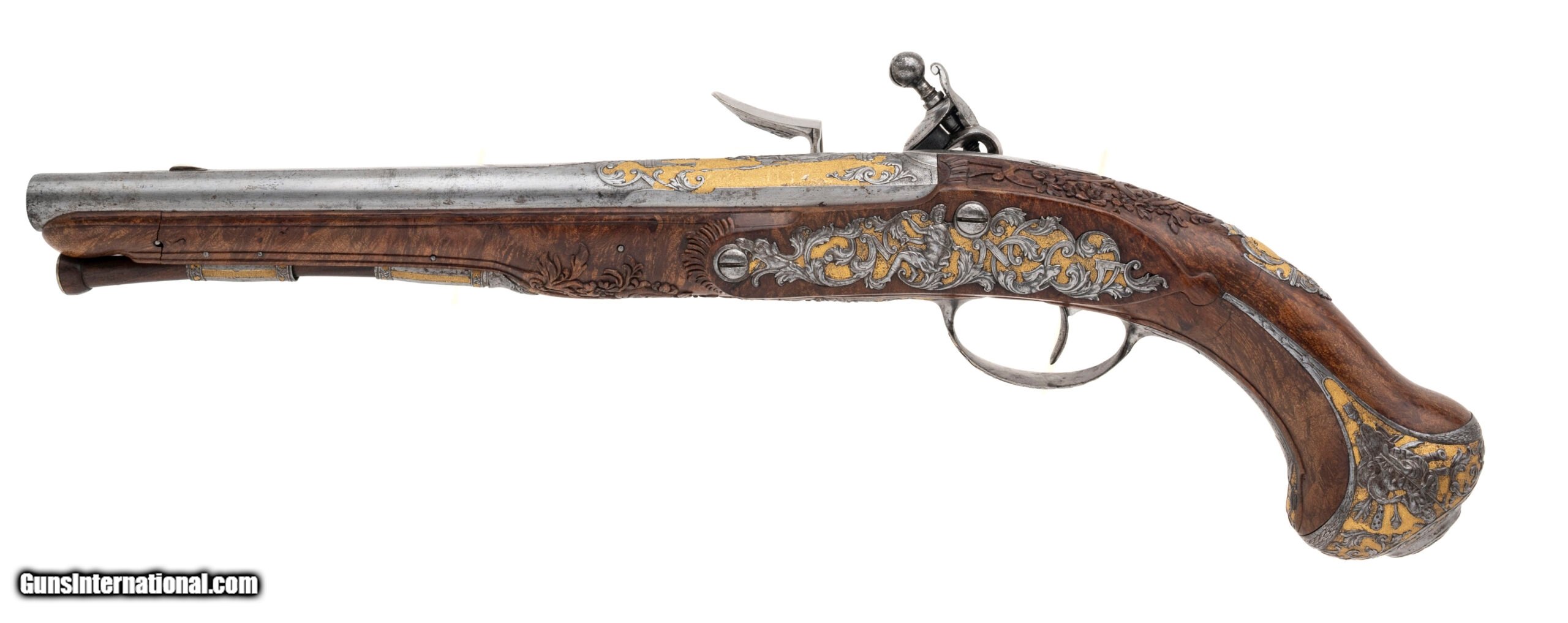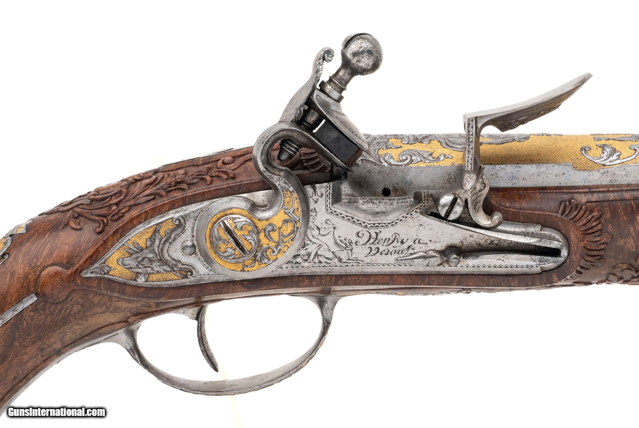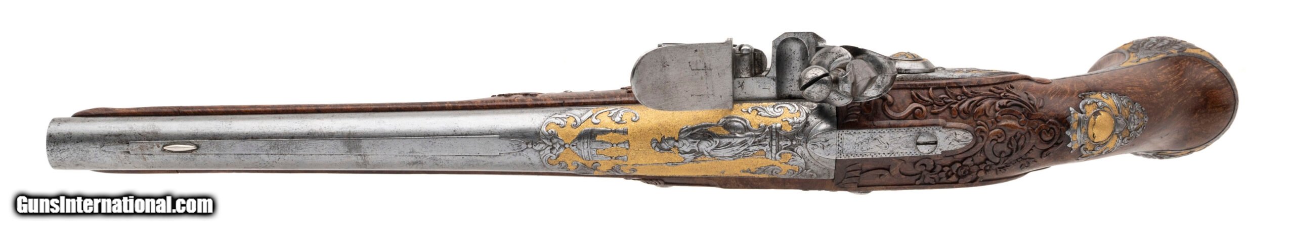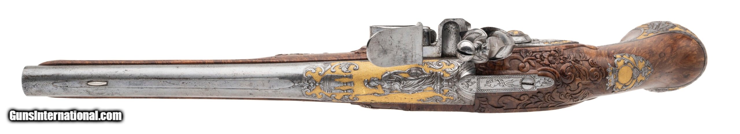 Description: "Maker: Henry, Vesoul (Franche-Comté, France) Date: Circa 1755-1775 (Louis XV period) Type: Pair of deluxe flintlock pistols from a garniture set Description This is an outstanding matched pair of French flintlock pistols of the highest artistic and technical quality, signed on the locks “Henry à Vesoul." The pistols represent elite late-18th-century French court workmanship and were originally part of a multi-piece garniture, traditionally said to have included a matching long gun. Both pistols feature beautifully carved walnut stocks with deep rococo scrollwork and floral relief carving throughout the fore-stocks, grips, and tang areas. The mounts are finely chiseled steel, extensively decorated with gold damascened scrolls and classical motifs. The trigger guards, butt caps, sideplates, and barrel tangs are all richly sculpted and gilt in the finest French taste of the Louis XV era. The oval butt caps are fitted with exquisite gold-ground portrait medallions depicting a classical-profile male figure in 18th-century style, a decorative motif commonly encountered on high-nobility and royal presentation arms of the period. The locks are finely engraved with classical figures and scrolls and retain their original flintlock mechanisms, showing correct late-18th-century French form. Barrels are octagonal at the breech transitioning to round, with gold inlaid panels and engraved borders, and fitted with matching engraved steel sights. The overall quality, decoration, and matched construction indicate production for a very high-ranking client, possibly royal or princely. The maker, Henry of Vesoul, is recorded among the accomplished provincial master gunmakers of eastern France whose work frequently rivaled that of Paris and was often supplied to elite clientele. Traditionally, the pistols are said to be associated with a garniture whose long gun is reportedly held in the Musée de la Chasse et de la Nature in Paris; this attribution is unconfirmed but as the museum has not responded ? Dimensions (approximate) • Overall length: 15.25 inches (38.7 cm) • Barrel length: 9.25 inches (23.5 cm) • Caliber: approx. .50 / 12–13 mm (smoothbore) Condition Very fine antique condition overall. Stocks are solid with only minor age lines and handling marks consistent with period use. Metal surfaces show attractive light patina with strong remaining engraving and gold inlay. Locks function correctly. Gilding remains vivid throughout. An exceptional surviving matched pair. Historical Note Vesoul, in the Franche-Comté region, was a recognized center of high-grade arms production during the 18th century, supplying luxury sporting and presentation firearms to noble and court clients throughout France. Garniture sets of this quality were typically commissioned by aristocracy and royalty and often included matching pistols, a fowling piece, and accessories housed in a fitted case. Antique: Yes Price: $57,500.00 Contact Seller |