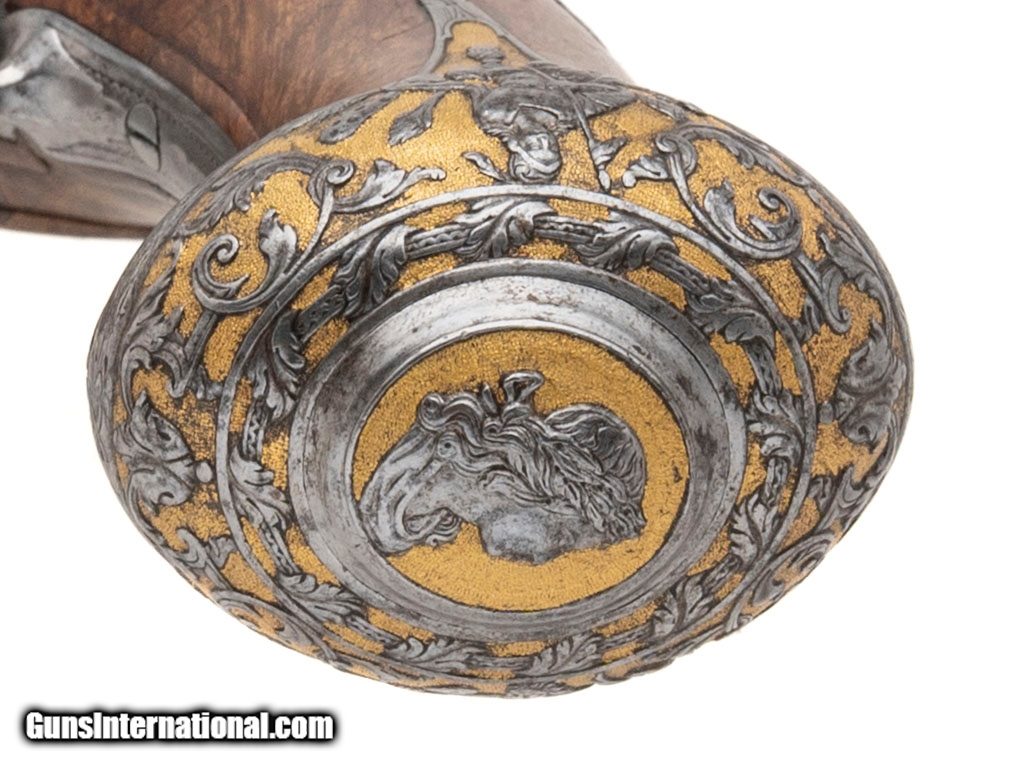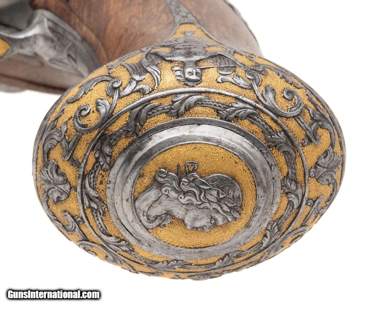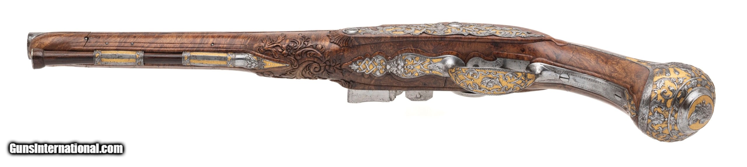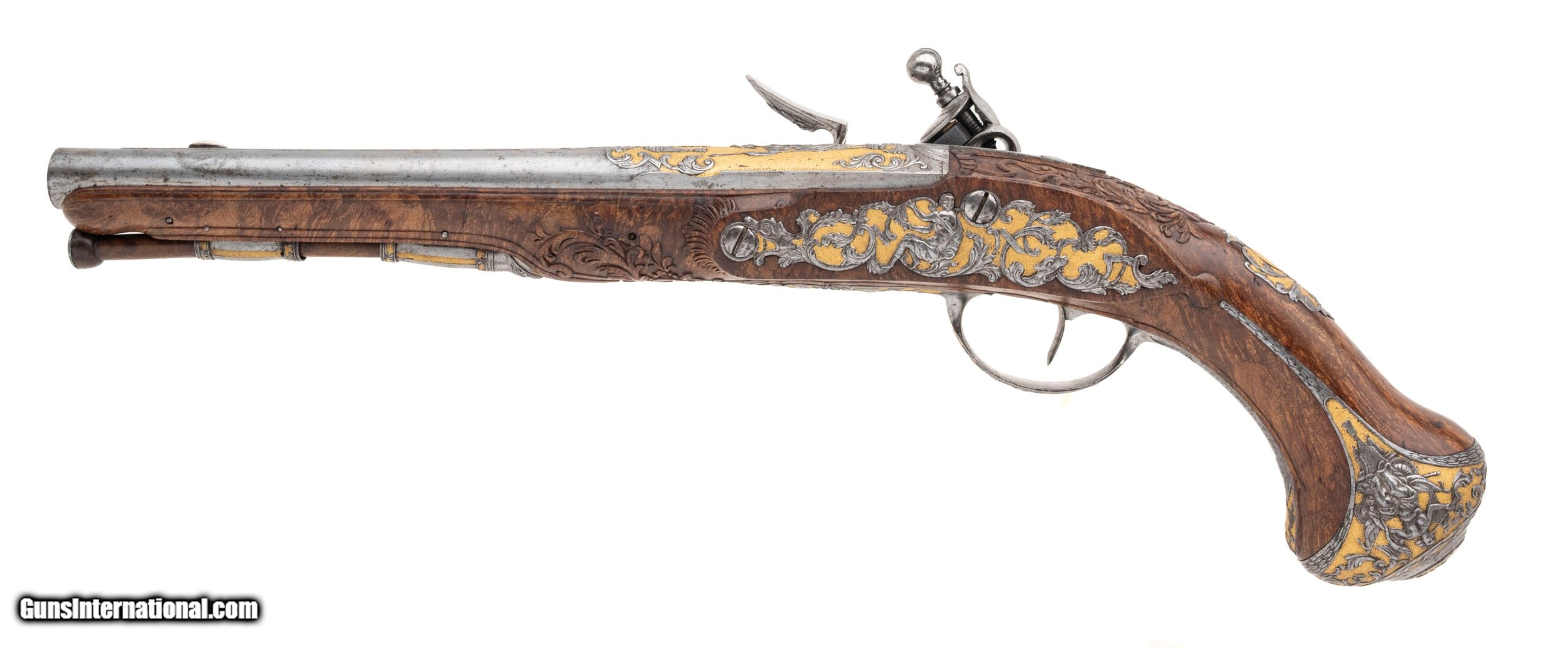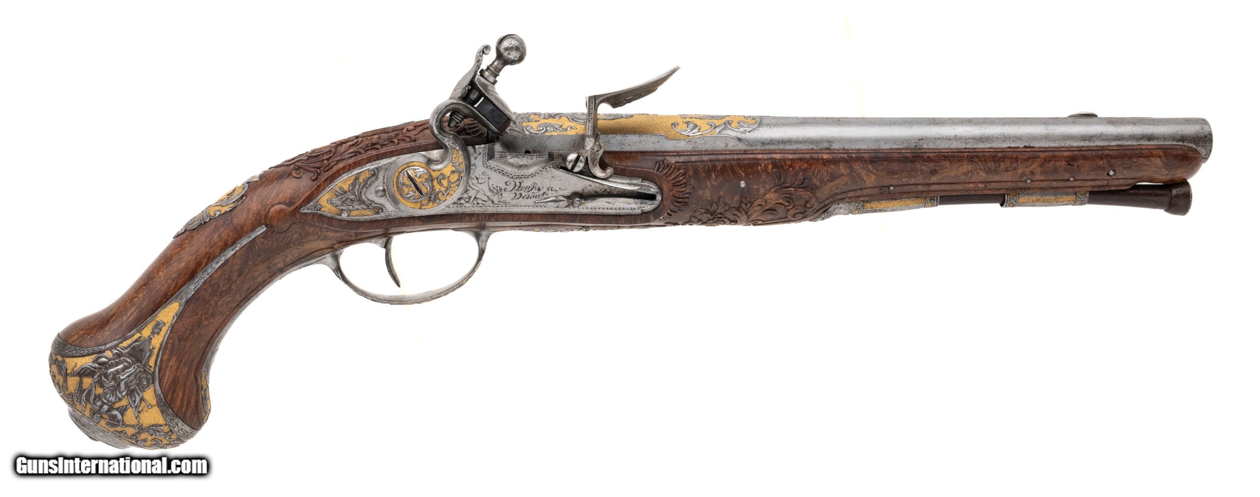 Description: "Maker: Henry, Vesoul (Franche-Comté, France) Date: Circa 1755-1775 (Louis XV period) Type: Pair of deluxe flintlock pistols from a garniture set Description This is an outstanding matched pair of French flintlock pistols of the highest artistic and technical quality, signed on the locks “Henry à Vesoul." The pistols represent elite late-18th-century French court workmanship and were originally part of a multi-piece garniture, traditionally said to have included a matching long gun. Both pistols feature beautifully carved walnut stocks with deep rococo scrollwork and floral relief carving throughout the fore-stocks, grips, and tang areas. The mounts are finely chiseled steel, extensively decorated with gold damascened scrolls and classical motifs. The trigger guards, butt caps, sideplates, and barrel tangs are all richly sculpted and gilt in the finest French taste of the Louis XV era. The oval butt caps are fitted with exquisite gold-ground portrait medallions depicting a classical-profile male figure in 18th-century style, a decorative motif commonly encountered on high-nobility and royal presentation arms of the period. The locks are finely engraved with classical figures and scrolls and retain their original flintlock mechanisms, showing correct late-18th-century French form. Barrels are octagonal at the breech transitioning to round, with gold inlaid panels and engraved borders, and fitted with matching engraved steel sights. The overall quality, decoration, and matched construction indicate production for a very high-ranking client, possibly royal or princely. The maker, Henry of Vesoul, is recorded among the accomplished provincial master gunmakers of eastern France whose work frequently rivaled that of Paris and was often supplied to elite clientele. Traditionally, the pistols are said to be associated with a garniture whose long gun is reportedly held in the Musée de la Chasse et de la Nature in Paris; this attribution is unconfirmed but as the museum has not responded ? Dimensions (approximate) • Overall length: 15.25 inches (38.7 cm) • Barrel length: 9.25 inches (23.5 cm) • Caliber: approx. .50 / 12–13 mm (smoothbore) Condition Very fine antique condition overall. Stocks are solid with only minor age lines and handling marks consistent with period use. Metal surfaces show attractive light patina with strong remaining engraving and gold inlay. Locks function correctly. Gilding remains vivid throughout. An exceptional surviving matched pair. Historical Note Vesoul, in the Franche-Comté region, was a recognized center of high-grade arms production during the 18th century, supplying luxury sporting and presentation firearms to noble and court clients throughout France. Garniture sets of this quality were typically commissioned by aristocracy and royalty and often included matching pistols, a fowling piece, and accessories housed in a fitted case. Antique: Yes Price: $57,500.00 Contact Seller |
