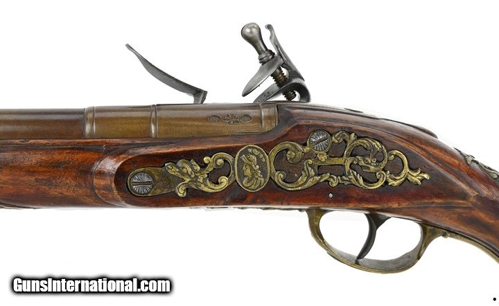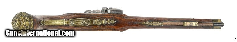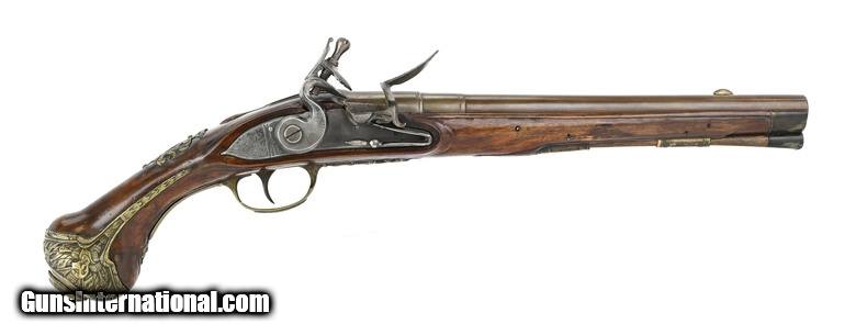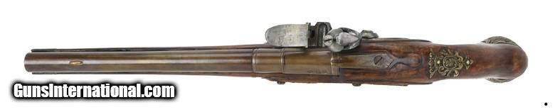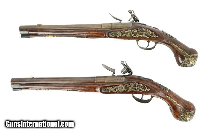Description: "Fine Pair of English Flintlock Pistols. Made approximately 1700-1720. Bore is .65 caliber. Barrel length 12â€? and overall length 19 ¾â€?. Barrel proof is for London with Crown CP and Crown V for final inspection proof. Barrels are three stage. Tail of lock is engraved with a panoply of arms. The name Pasual is also on the tail of the lock. No other makers marks are present. This is a robust pair of pistols. The engraved and chiseled brass mounts with a panoply of arms in high relief consisting of drums, canons, lances, banners and armor. The butt cap is that of a man with oak leaf wreath about his head much like a Roman emperor. The stock is inlaid with royal device with crown and cameo of a figure with plumed helmet. The trigger guard is in chiseled in relief. The side plate is very well done with figures of fanciful figures in Rococo scrolls and a cameo of the same helmeted figure as mentioned before. The overall condition of both pistols is excellent. We can only guess that the lack of a maker’s name might be at the request of the owner. Very impressive pair of fine flintlock pistols. SOLD Antique: Yes |