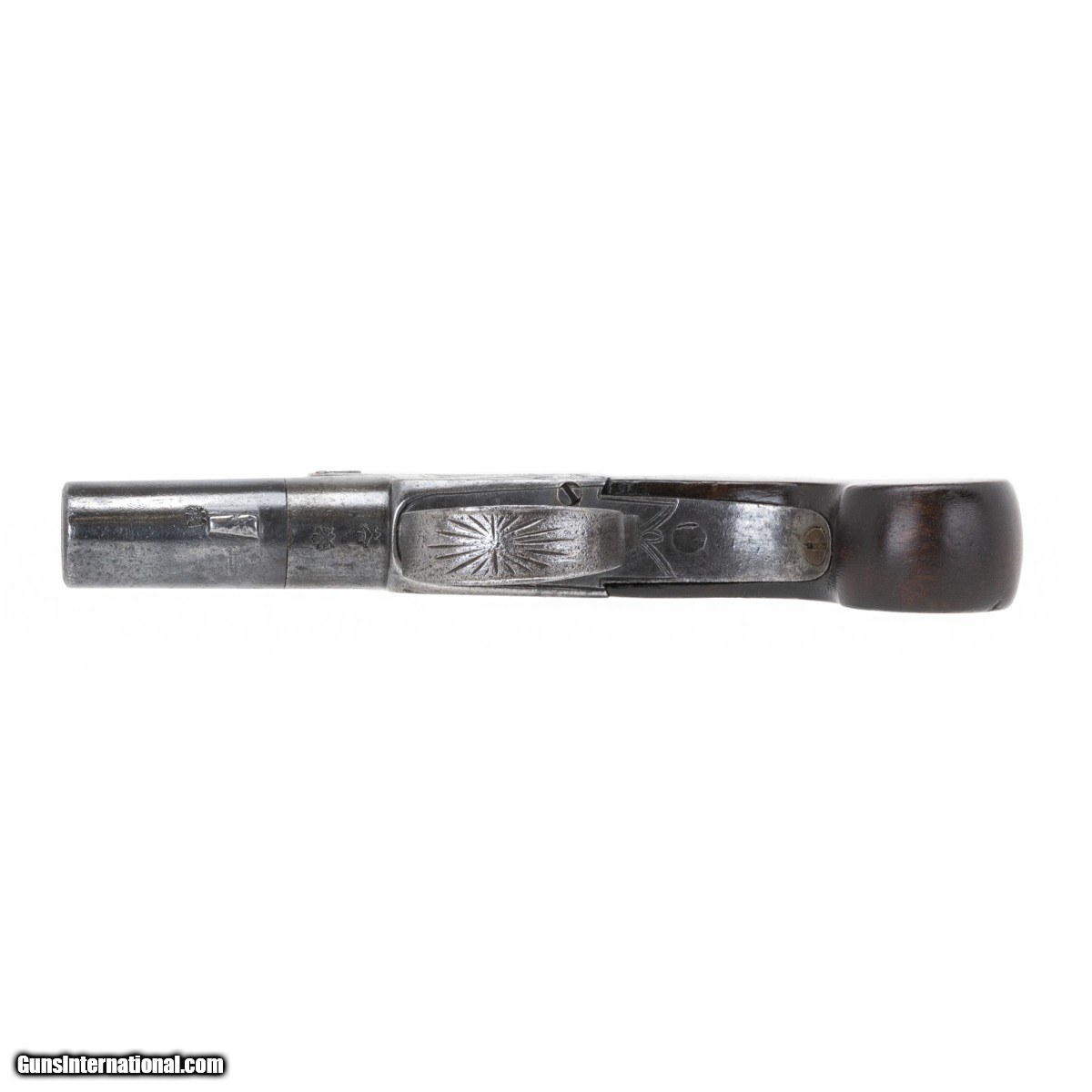 Description: "Made circa 1800. 46 caliber with a 1 3/8" barrel. Metal has gray metal patina. Metal has been cleaned and has spots of light pitting. Grips are very good. SOLD Antique: Yes |