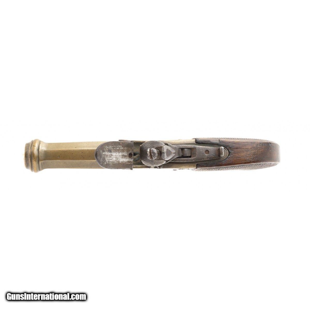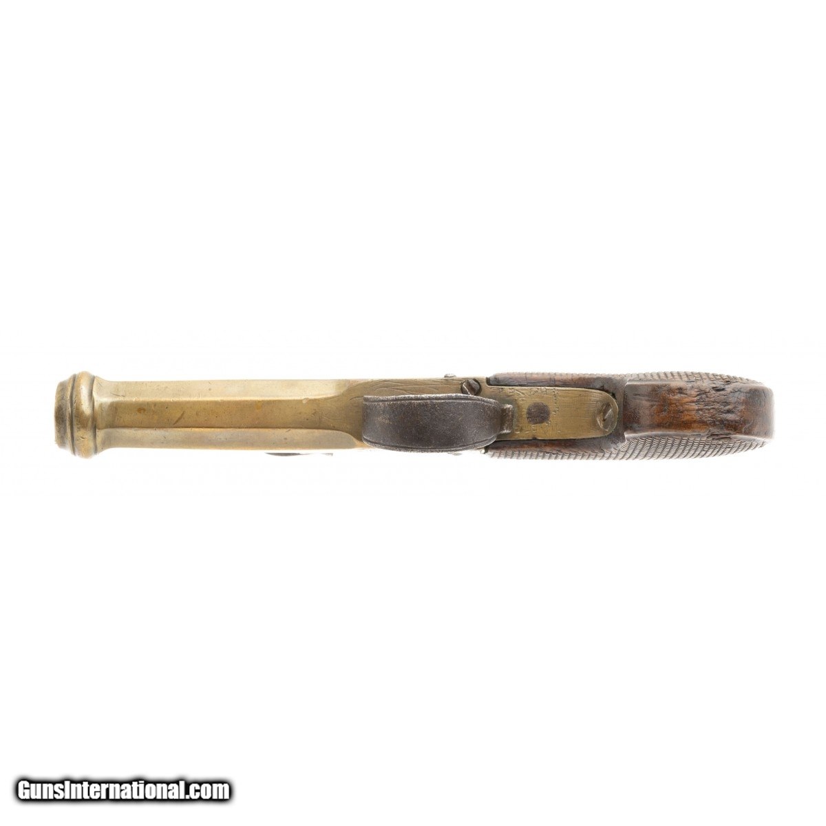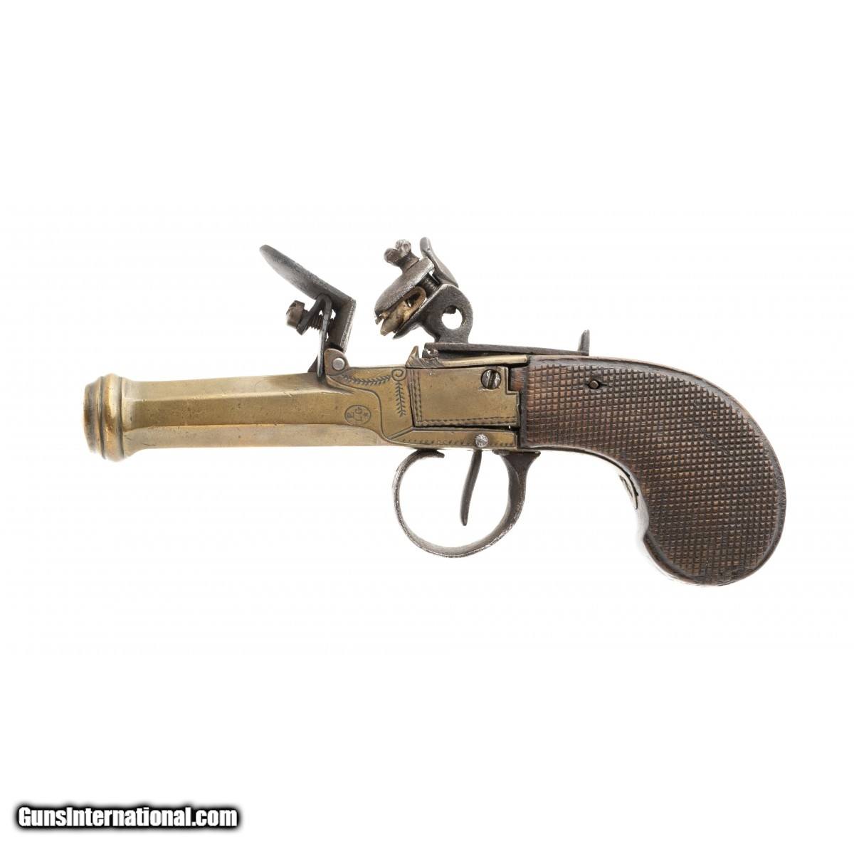 This brass barrel and action flintlock muff pistol was made in the early 19th century in Belgium. The overall length is 6.5"". The 2.75"" octagon 45 caliber barrel has a good smooth bore with light wear. It features a cannon muzzle. The left side of the barrel has the standard oval Belgian ELG proof mark. The right side of the frame has what appears to be JWL in script. The brass is very good with a pleasing age patina. The checkered grips are good with bruising at the bottom and a dent at the upper right edge. The left side plate has a gap at the lower rear. The action operates but is in need of adjustment. This is a very reasonably priced flintlock muff pistol.