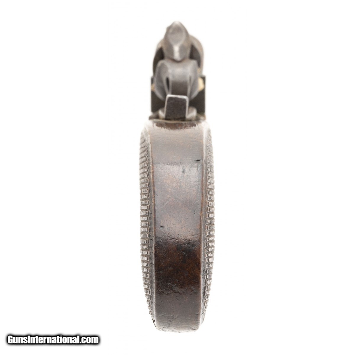 Description: " This brass barrel and action flintlock muff pistol was made in the early 19th century in Belgium. The overall length is 6.5"". The 2.75"" octagon 45 caliber barrel has a good smooth bore with light wear. It features a cannon muzzle. The left side of the barrel has the standard oval Belgian ELG proof mark. The right side of the frame has what appears to be JWL in script. The brass is very good with a pleasing age patina. The checkered grips are good with bruising at the bottom and a dent at the upper right edge. The left side plate has a gap at the lower rear. The action operates but is in need of adjustment. This is a very reasonably priced flintlock muff pistol. SOLD Antique: Yes |