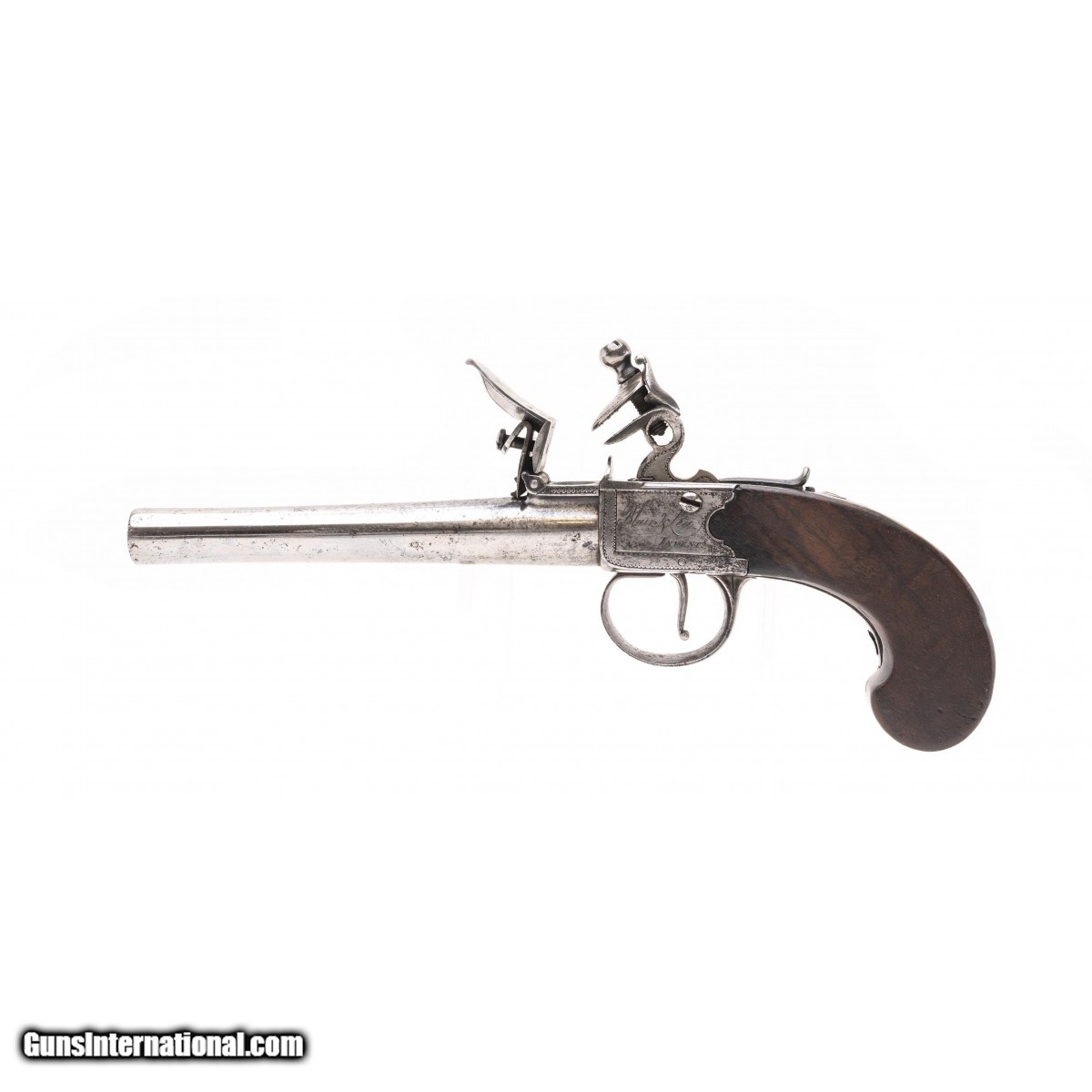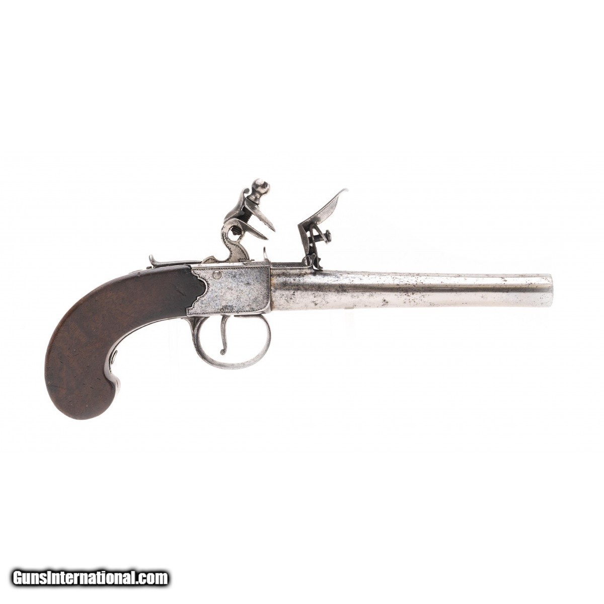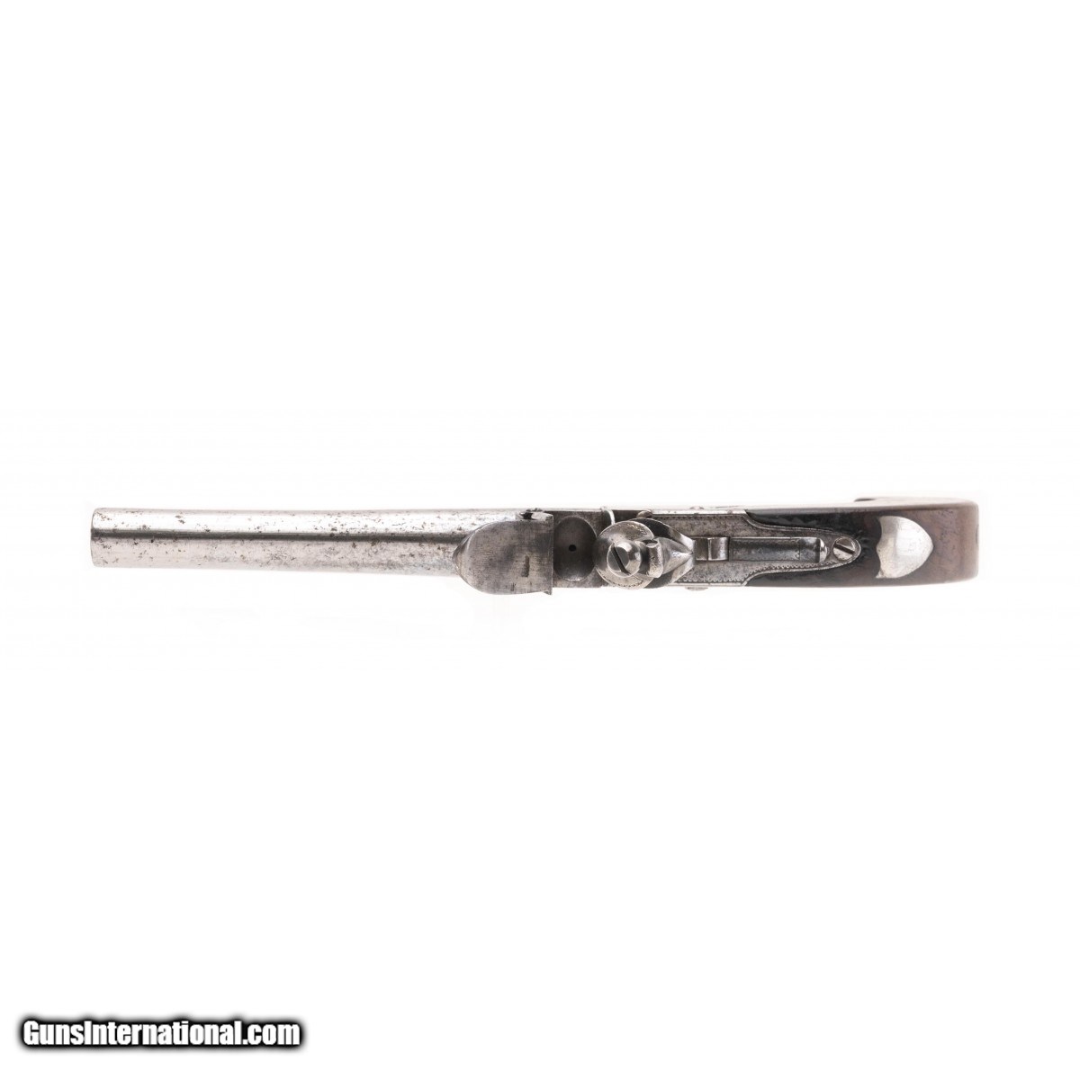 Left side of the box lock frame is marked in script ""Blair & Lea"". This very well made pistol is .45 caliber smoothbore. Barrel length is 6"" and overall length is 9.25"". Barrel has the London black powder proof and view mark. Cock has a sliding safety. The stock is very good with no chips or cracks and has a silver shield on the back for initials or crest. This pistol has eye appeal and is in very fine condition.