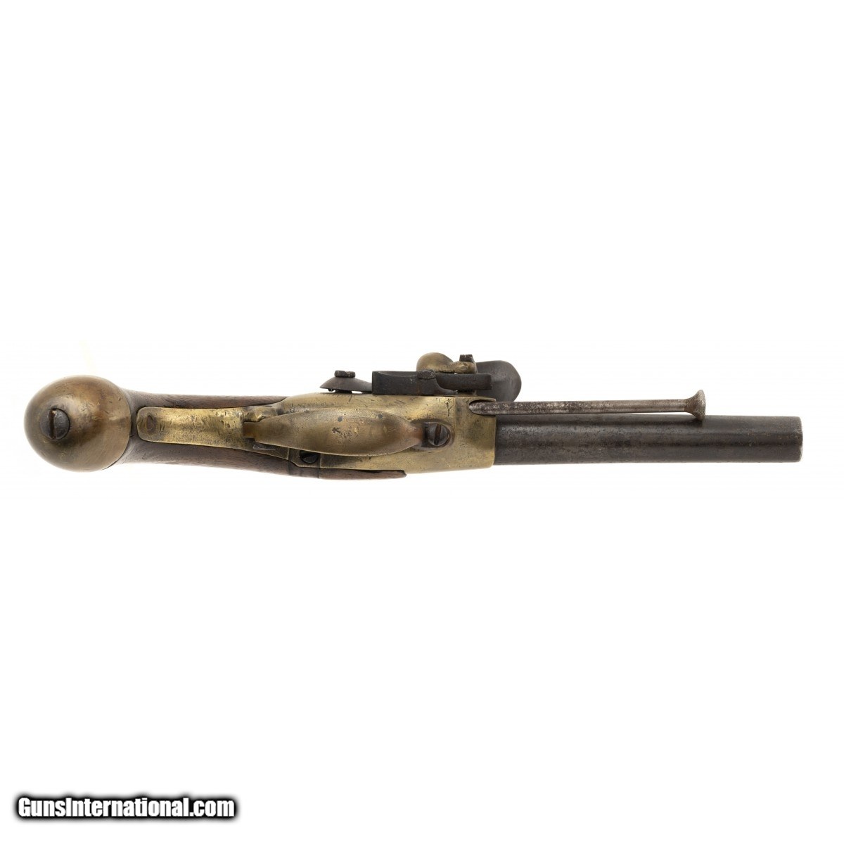Description: "Made circa 1780. 69 caliber with a 7" barrel. Barrel has a dark brown patina with pitting. Frame is marked Maubeuge. Belt hook is missing which is very common on this model. Stock is very good. There is a faint cartouche on the right hand side of the grip that appears to be roman numbers. Action works well. SOLD Antique: Yes |