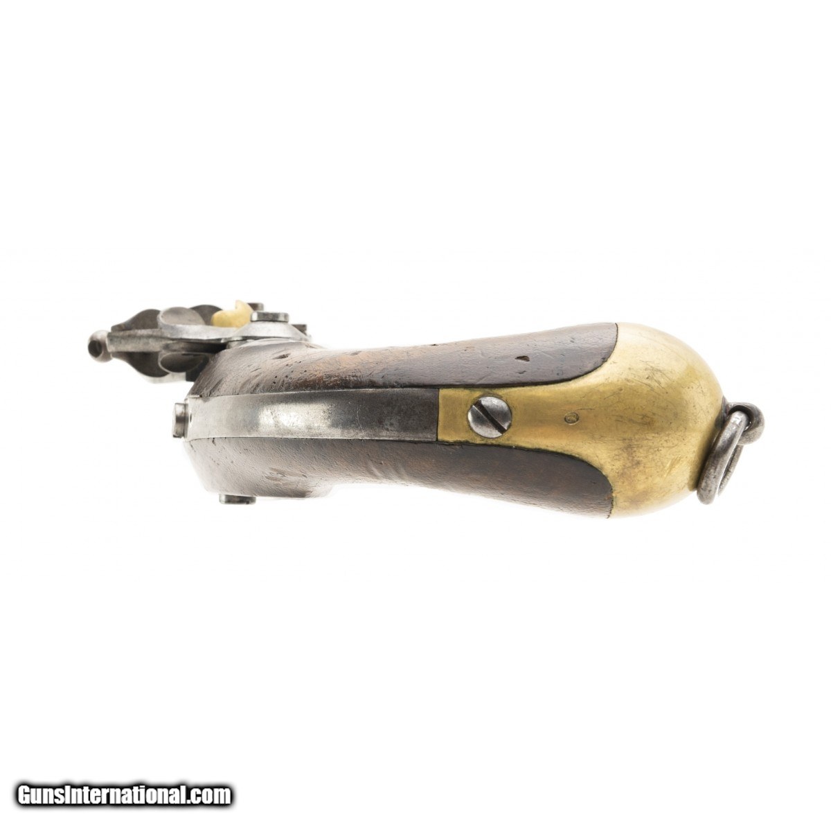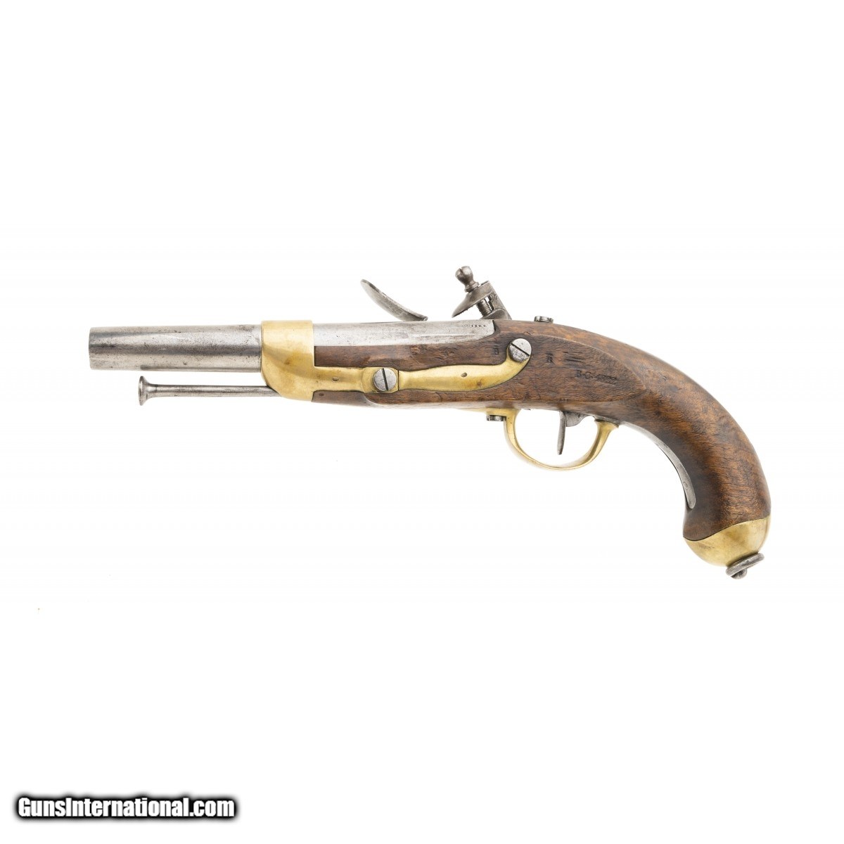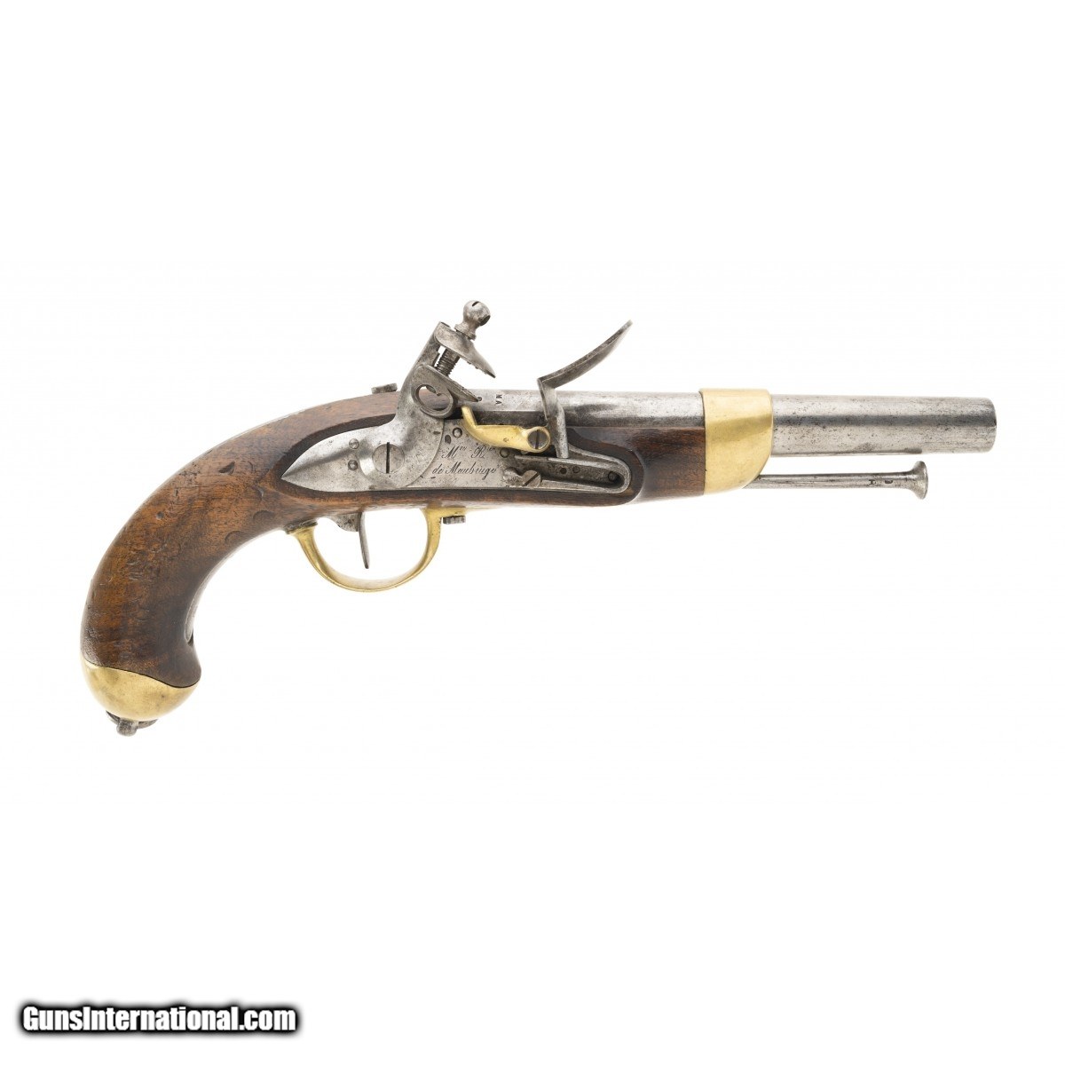 Description: " This French Model 1816 flintlock pistol was manufactured by the Maubeuge Arsenal in 1822. The overall length is approx. 14.5"". The approx. 7.75"" round 67 caliber barrel has an excellent, bright smooth bore. The barrel is marked MA with a proof to the rear on the right oblique flat and c.1822 (date of manufacture) on the left oblique flat. The barrel tang is marked Mle 1816. The barrel and lock are bright with areas of very light staining. The lock is marked Mre Rle over de Maubeuge. The brass furniture are fine with a nice aged patina. The stock is fine with use dents and dings concentrated on the right grip, sharp edges, and no cracks or chips. The left flat has two inspection B's and B.C. 1822 at the rear. The ramrod and butt swivel are present. The action functions correctly. This much better than average Model 1816 flintlock pistol is fit for the finest collection. SOLD Antique: Yes |