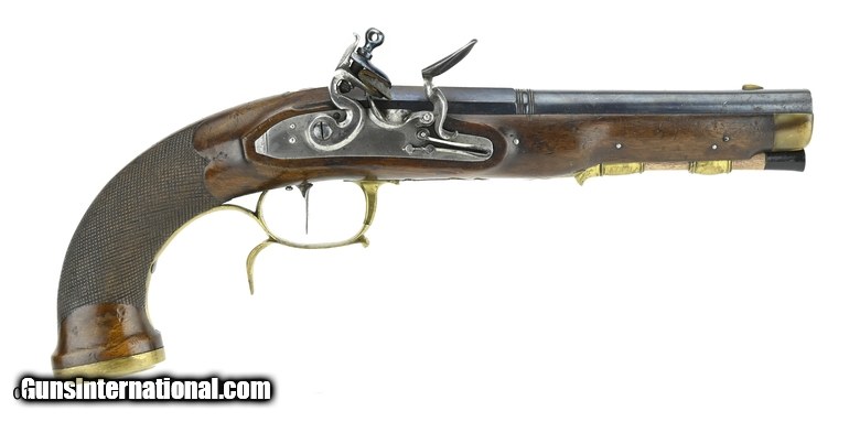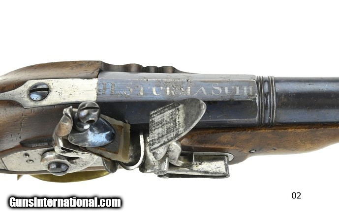 Description: " German Pair of Officer Flintlock Pistols by Heinrich Sturm of Suhl. Very fine set of Flintlock officers’ pistols by Heinrich Sturm of Suhl, Germany who was active in Suhl from 1815-1850. These gun were made probably between 1815-1825. Stocks are empire form as seen on French pistols of the Empire period. These guns are in excellent condition with 80% of the original blue on the barrel. Both barrels are marked “ HSturm A SUHL". The locks are polished metal and have rolling frizzens. Grips are checkered and show normal handling wear. Action work perfect. Very nice set of German Flintlock pistols. SOLD Antique: Yes |