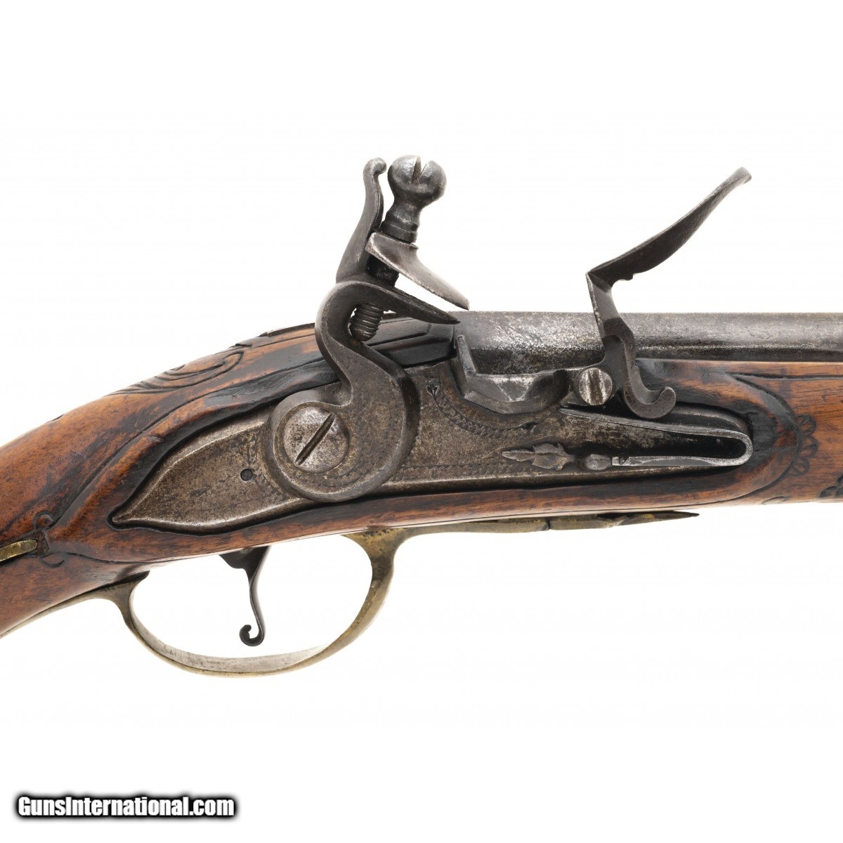 Description: "Made circa 1750 -1770. 62 caliber with 12 ¾" barrel. This gun has a dark brown to gray patina. Wood is very good. Lock is a banana style. There are worn maker sincs on the top of the barrel that unfortunately cannot be made out. Wood has been refinished at some point. Overall, the wood is very good with some decorative carvings. Very Similar guns are pictured in George Neuman’s books on the Revolutionary war guns. SOLD Antique: Yes |