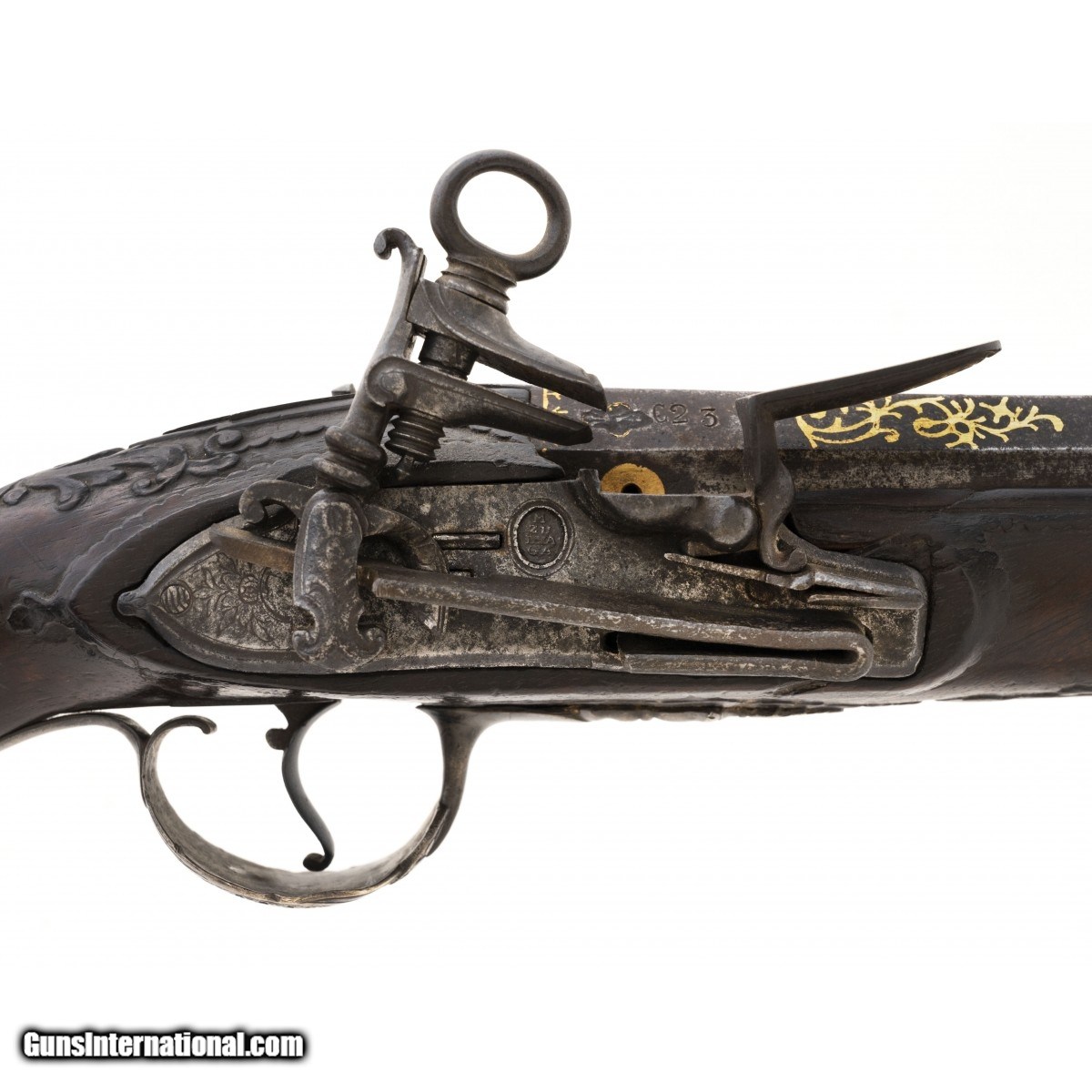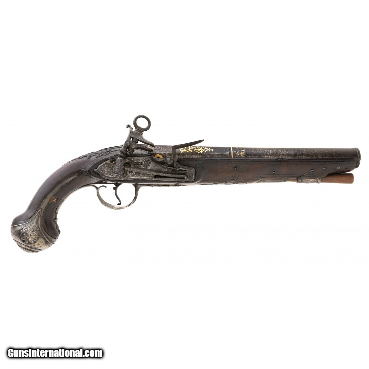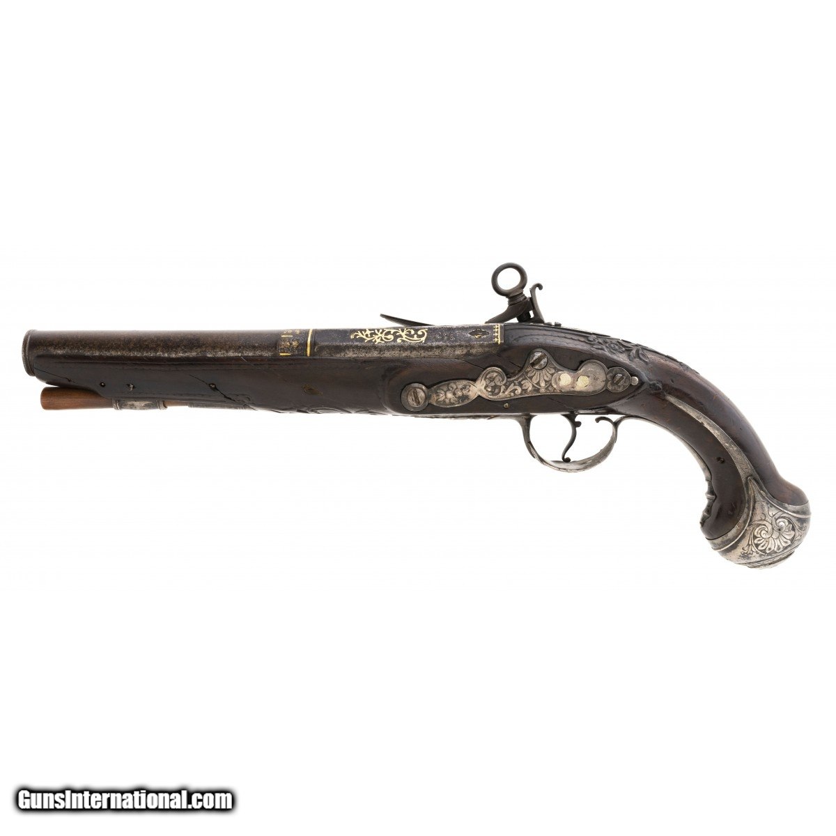 Description: "Made circa 1750. 75 caliber with a 8 1/3" barrel. Very fine gun with gold inlay on the barrel. Butt cap has tarnished silver remaining. Stocks are nicely carved and do have several spots that have small cracks. . Action works properly with a light main spring. SOLD Antique: Yes |