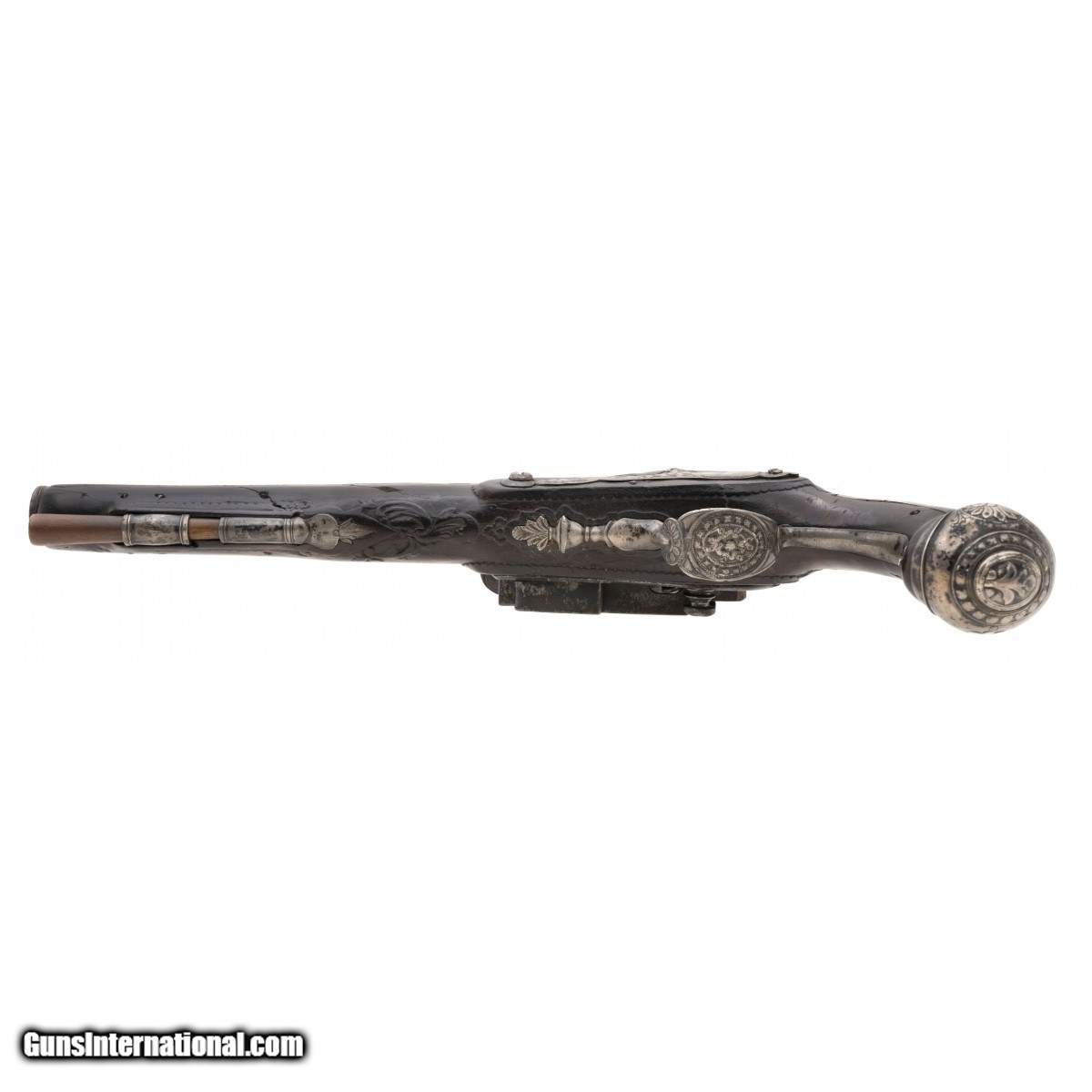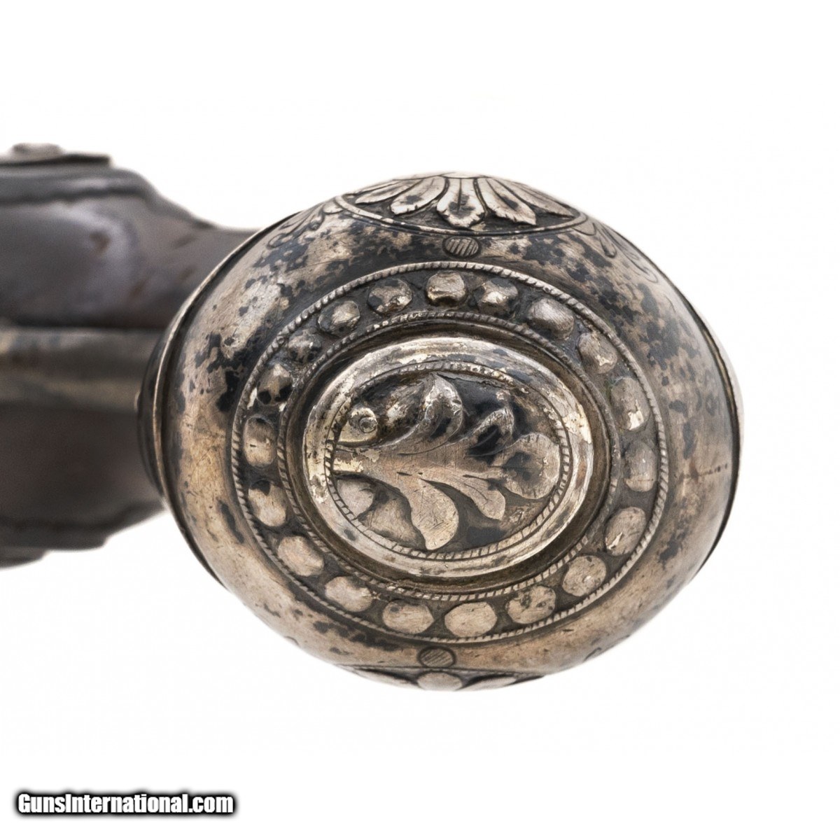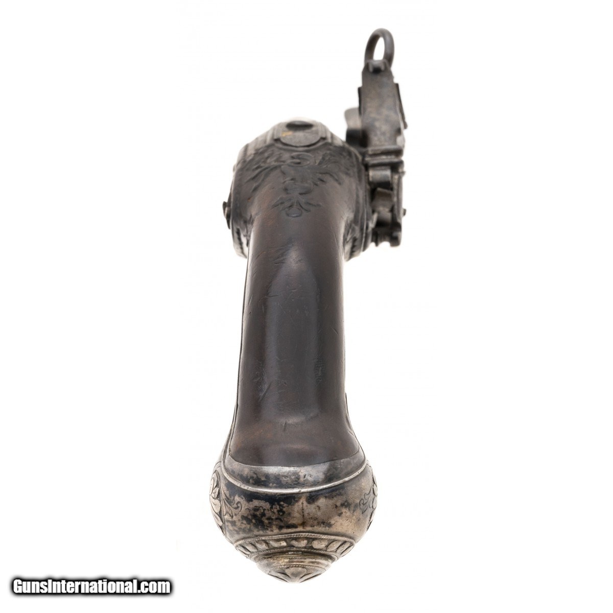 Description: "Made circa 1750. 75 caliber with a 8 1/3" barrel. Very fine gun with gold inlay on the barrel. Butt cap has tarnished silver remaining. Stocks are nicely carved and do have several spots that have small cracks. . Action works properly with a light main spring. SOLD Antique: Yes |
