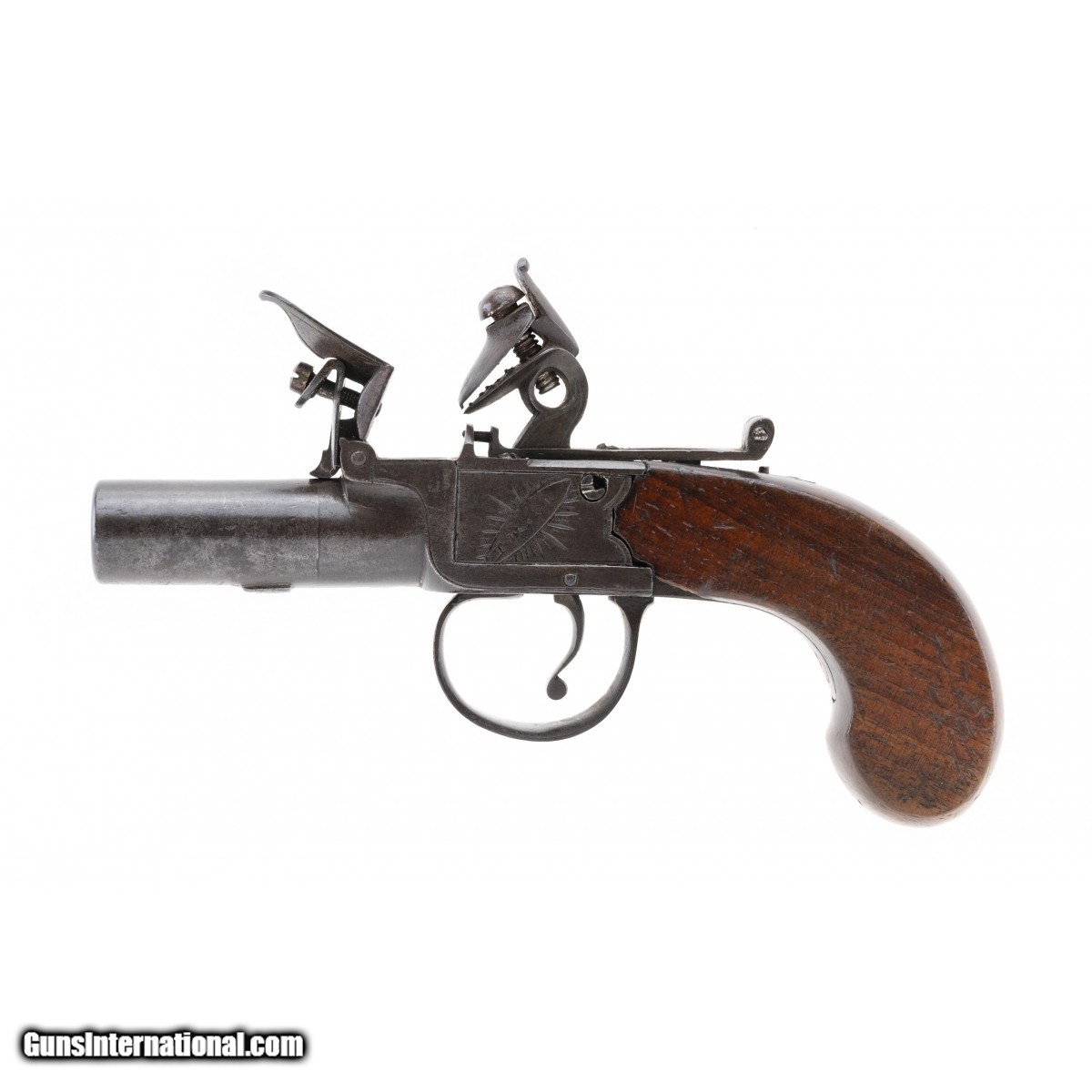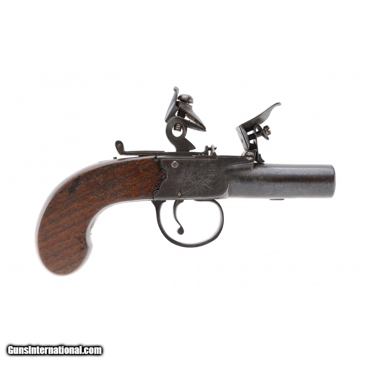This flintlock muff pistol is marked London but was made in Birmingham. The overall length is approx. 6"". The 2"" round 46 caliber smooth bore turn off barrel has a good bore with light wear. All the metal has a smooth brown patina. The barrel has Birmingham proof marks. The left side of the frame is marked TWIGG and the right is marked LONDON. Both have decorative markings around them. The grips are good with a small chip on the left at the junction with the frame at the trigger guard. The Top jaw screw is a replacement. This pistol features a sliding frizzen safety pin. The action functions but the mainspring is weak. Reasonably priced at $495.