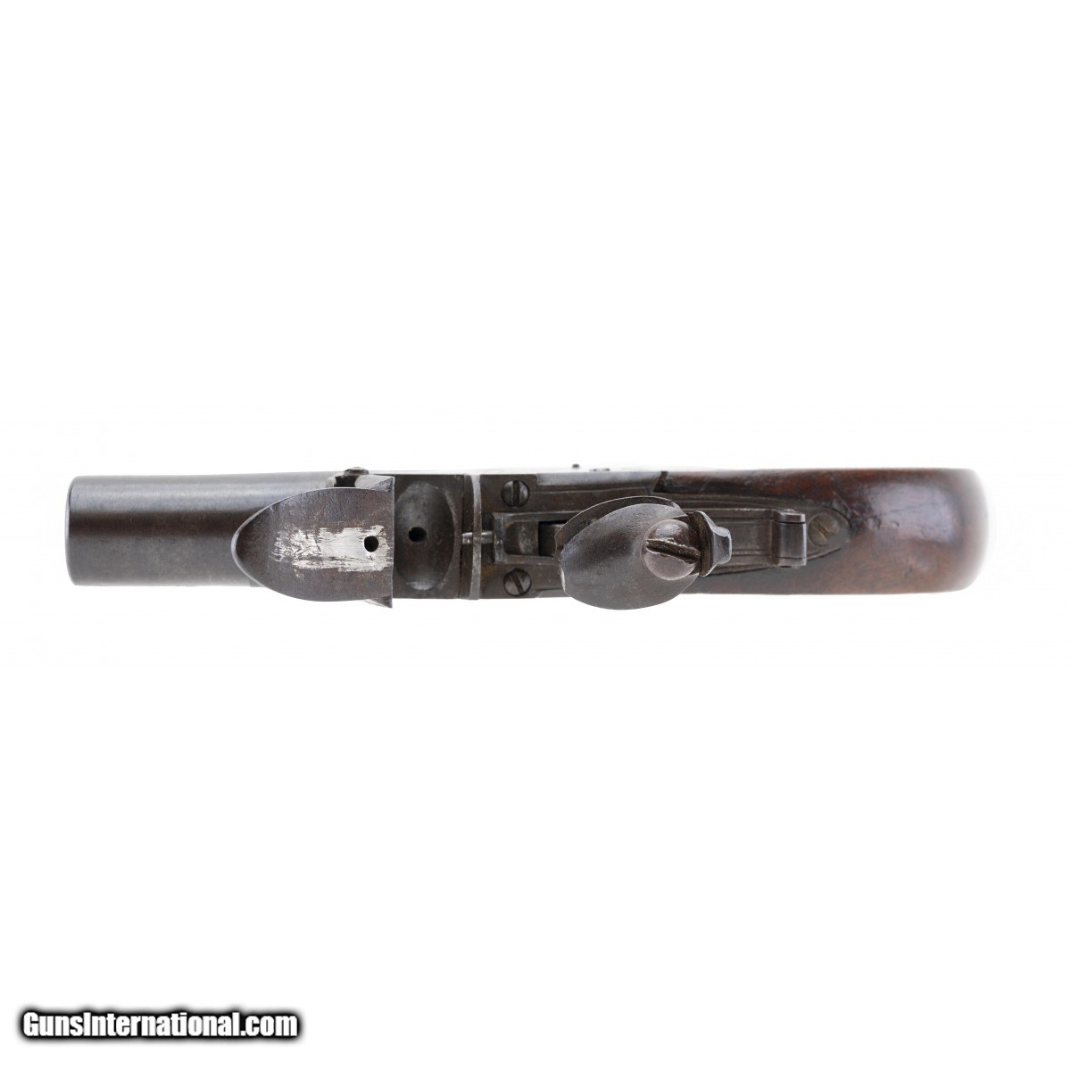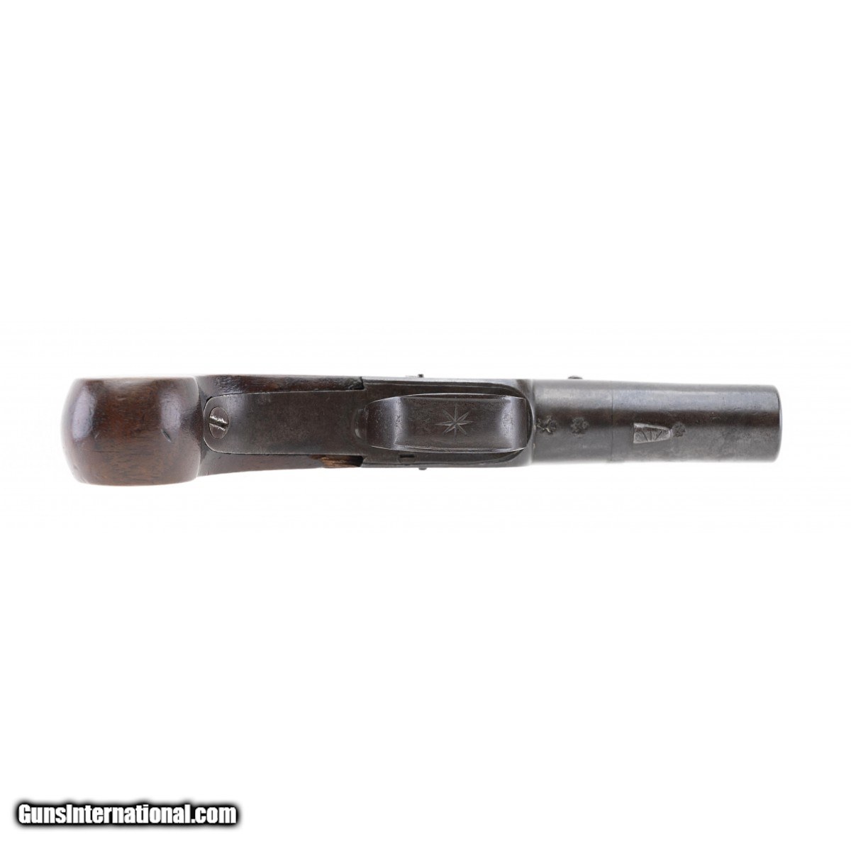Description: " This flintlock muff pistol is marked London but was made in Birmingham. The overall length is approx. 6"". The 2"" round 46 caliber smooth bore turn off barrel has a good bore with light wear. All the metal has a smooth brown patina. The barrel has Birmingham proof marks. The left side of the frame is marked TWIGG and the right is marked LONDON. Both have decorative markings around them. The grips are good with a small chip on the left at the junction with the frame at the trigger guard. The Top jaw screw is a replacement. This pistol features a sliding frizzen safety pin. The action functions but the mainspring is weak. Reasonably priced at $495. SOLD Antique: Yes |