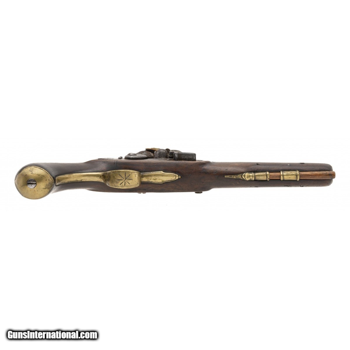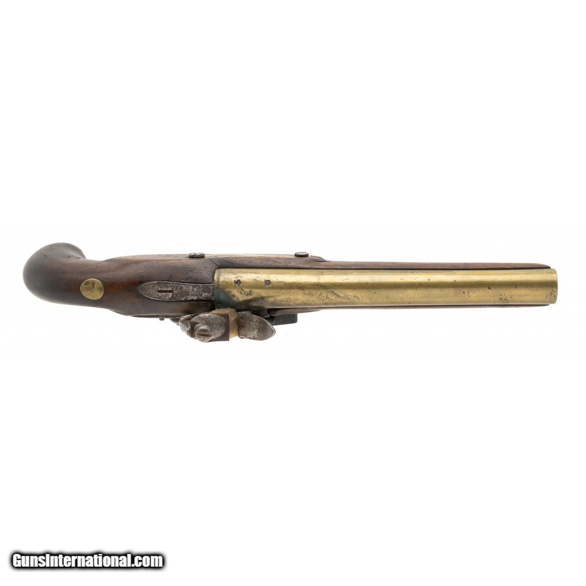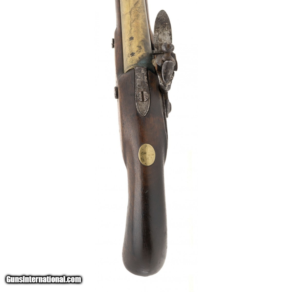 NSN, circa early 1800's, .60 caliber, 8"" round brass barrel with English proof marks. Pistol is a ""KETLAND & Co. style, lock plate is not marked with a ""Five feather"" motif visible at the rear. Wood has been lightly cleaned with a crack visible at the upper side plate screw. Minimal wood loss visible upper lock plate. Action is loose but still holds at half and full cock. Consignment