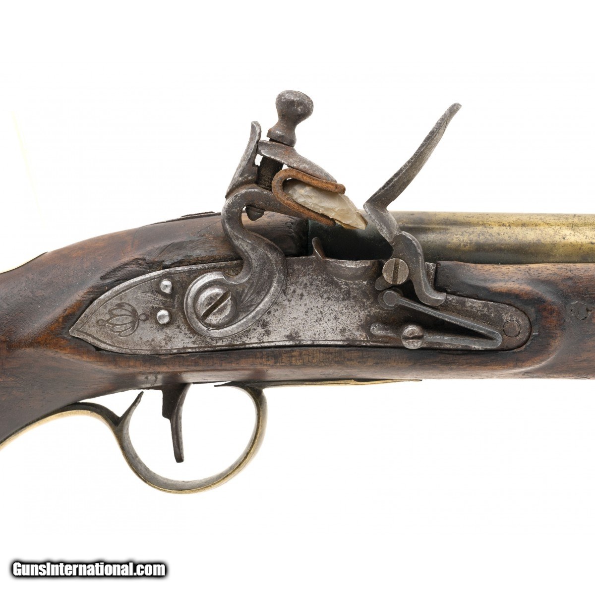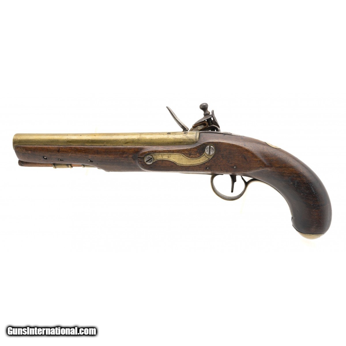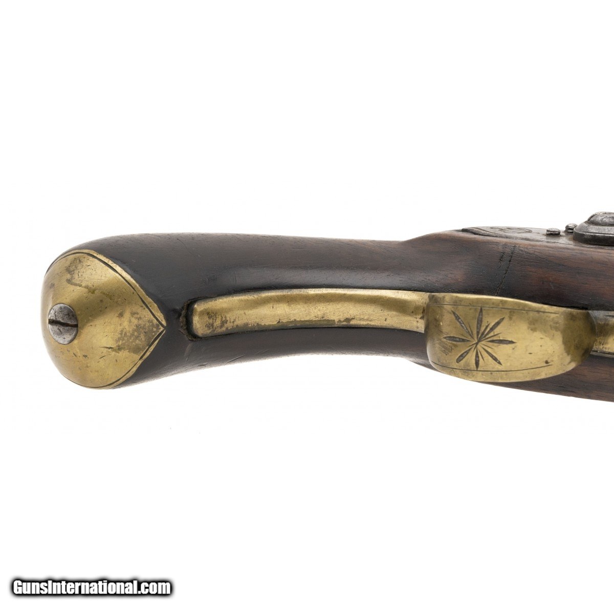 Description: " NSN, circa early 1800's, .60 caliber, 8"" round brass barrel with English proof marks. Pistol is a ""KETLAND & Co. style, lock plate is not marked with a ""Five feather"" motif visible at the rear. Wood has been lightly cleaned with a crack visible at the upper side plate screw. Minimal wood loss visible upper lock plate. Action is loose but still holds at half and full cock. Consignment SOLD Antique: Yes |