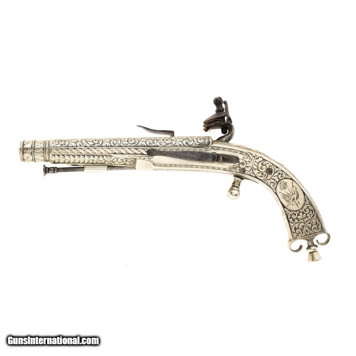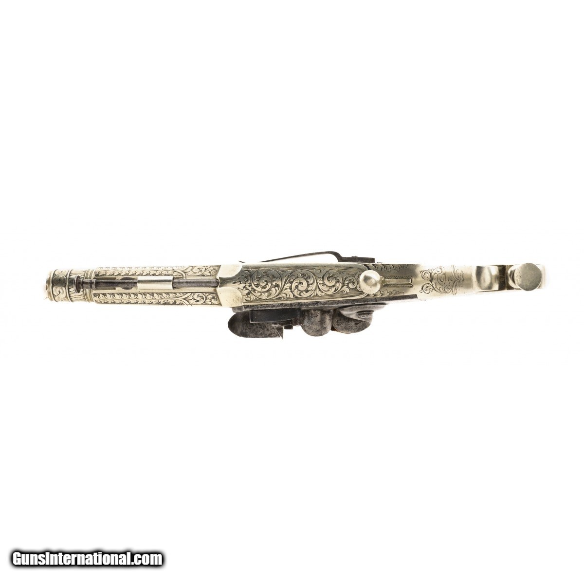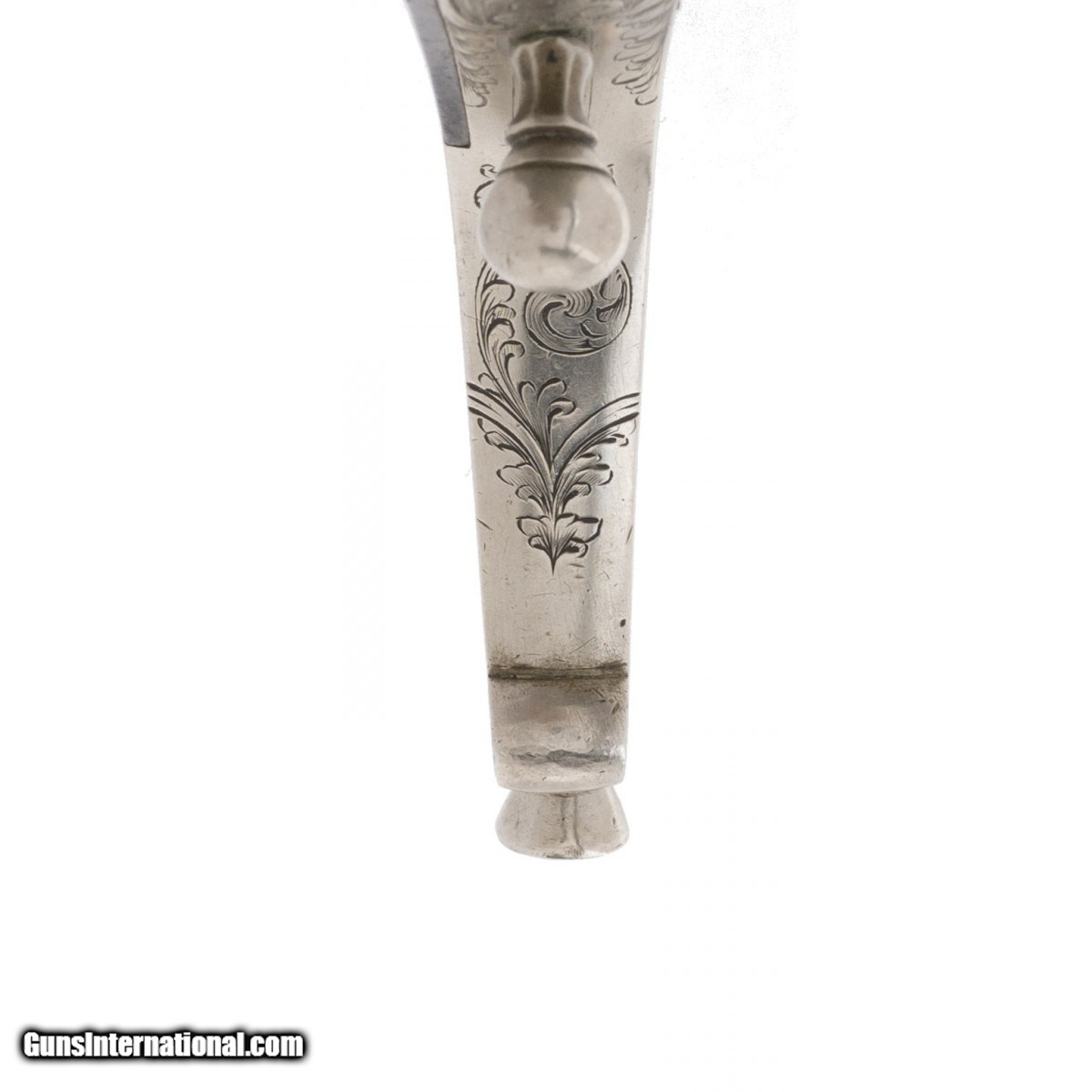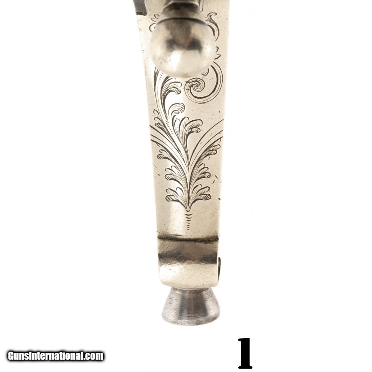 Description: "Made circa 1850. 48 caliber with 5 ½" barrels. Very pretty pair that has full coverage engraving. Every part of the barrel has engraving and 98% of the frame has engraving. Condition with all the finish on the framer and barrel. Both locks are sharp and have a dark gray patina. This pair has the rams head style butts. Beautiful pair of Scottish highland dress pistols! SOLD Antique: Yes |