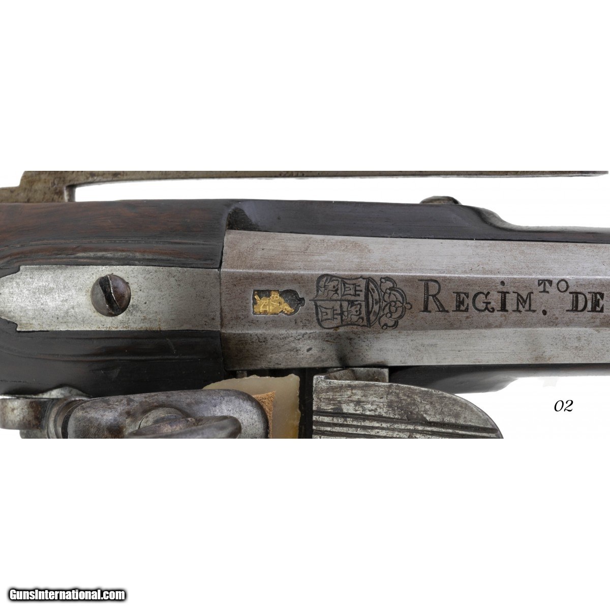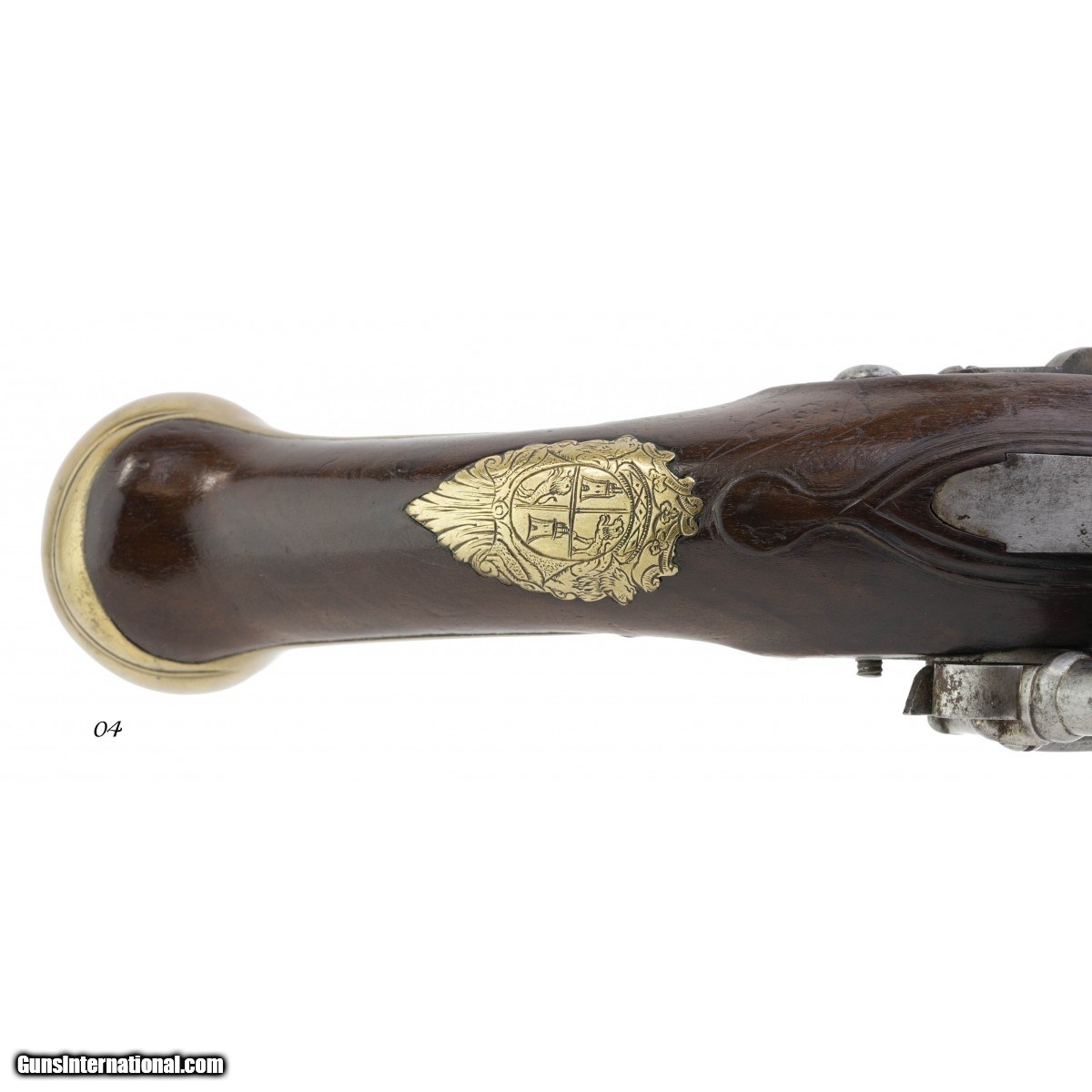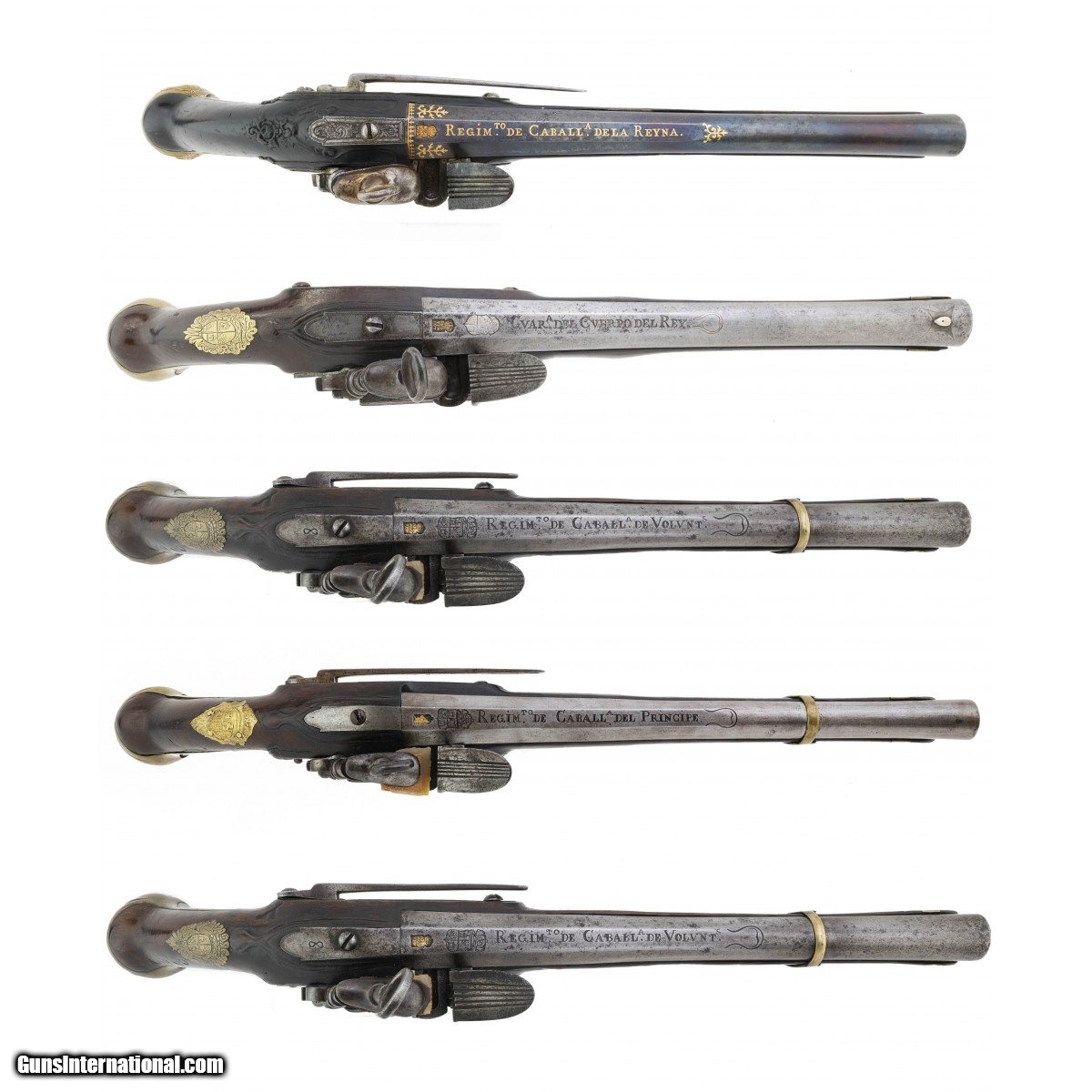 Description: "Rare five pistol ensemble of Royal Spanish Miguelet lock horsemans size pistols. Each one is similar yet different due to Royal inscription on barrels. Pistol No. 1 is inscribed on barrel ""Cavar A del Cuerpo Del Rey"" (Cavalry Body Guards of the King.), and has a silver inlay of the seal of the King (Seal of Aragon and Castiles). Below seal is makers gold sink (Bustindui); a very well remarked gunsmith. The stock has a brass inlay on the back with the Royal seal of Aragon and Castiles. Pistol No. 2 is inscribed on barrel ""Regim to De Caball A Del Principe"" (Regiment of Cavalry of the Prince). Royal Seal of Aragon and Castiles on barrel and brass inlay on back of grip. Left side of stock has been fitted with a strong belt hook. Pistol No. 3 is inscribed on barrel ""Regim to De Caball A De Volunt"" (Cavalry Regiment of Volunteers). Dated 1793 under the lock. Pistol is the model of 1789. Fitted with strong belt hook. Back of grip has Royal seal of Aragon and Castiles. Pistol No. 4 is inscribed on barrel ""Regim to De Caball A De Santiago"" (Cavalry Regiment of Santiago). Royal seal of Aragon and Castiles on barrel and back of grip. Pistol is a model of 1789. Pistol No. 5 is a Spanish officer's pistol marked ""Regim to De Caball A Dela Reyna"" (Regiment of Cavalry to the Queen). Makers sink in gold is Bustindui. Barrel is blued with gold lettering and gold flourishes. The buttcap is very elaborate with raised in relief figures of helmeted soldiers and bands of flowering leaf and vine motif. The trigger guard bow is a fanciful figure of a lion. The stock has relief carved floral spray behind the breech plug tang. The ramrod pipe has a relief carved figure of a grotesque mask with a ring pierced through the lower lip. This pistol also has a belt hook. A very fine pistol embellished fit for the Queen! This is a rare opportunity to have a collection that can never be duplicated. SOLD Antique: Yes |