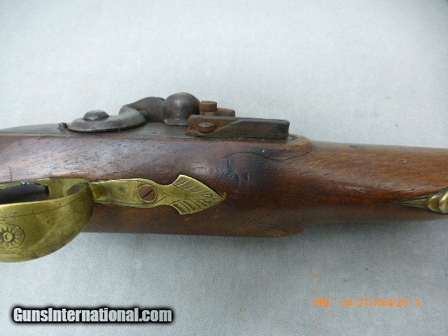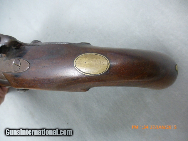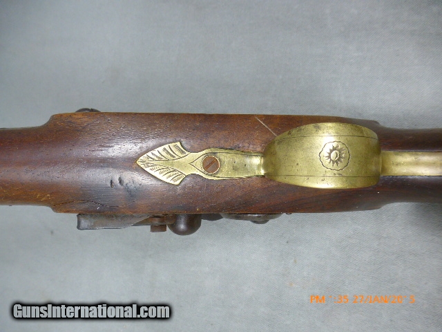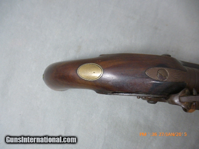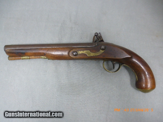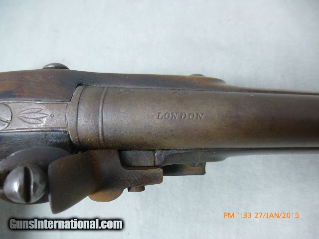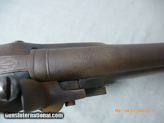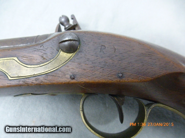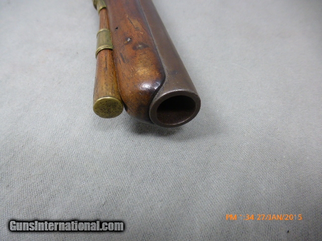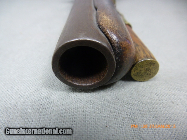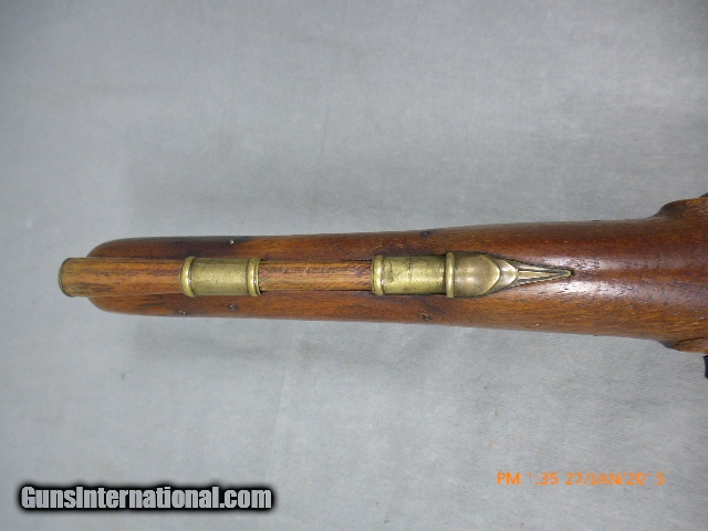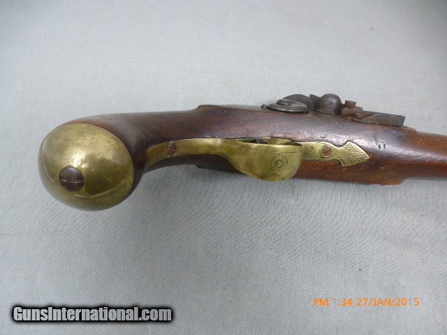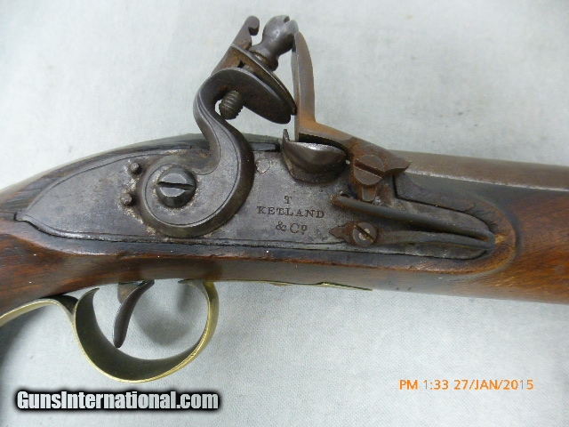 Description: 14-175 FINE BRITISH FLINTLOCK TRADE PISTOL Fine British Flintlock trade Pistol, c. 1770’s 9”, .67 cal. round steel barrel w/ (2) English proofs marked “London” with some light engraving at rear of bbl. Usual Brass furniture, including decorative brass escutcheon on wrist of stock, round buttcap, sideplate and trigger guard. Metal is very clean with dark patina. Lock is marked “T KETLAND & CO.” 15” overall length. In good working order, locks up well. Stock has chip behind lock. A very nice example probably made for trade, but that could have seen service during the American Revolutionary War. (14-175) $1,400.00 I take Visa/MasterCard, add 3%. Allow two weeks for all checks, whether bank, personal or certified to clear. It is also possible to wire funds to my account for instant credit for a $20.00 wire charge. 3 day- no questions asked return period for refund of price paid for gun (does not include shipping and credit card costs). Call or email with any questions or for more pictures. Guns are antique and should not be fired without examination by gunsmith. $50 shipping for long guns, $30 for hand guns to lower 48 states, about $50-$75 to most European countries and $70-$80 to Australia for antique handguns, carbines $75-$125. We can generally get insurance if you want through shipper but coverage is limited. Notify me if you want it. You can send 20% down- balance in 90 days for installment payment plan. No refunds on installment plans. I have shipped to Norway (long gun w/fragile stock) see feedback, England (Winchester1876, Rem. Dbl. Derr.), Northern Ireland, France, Australia and Sweden. Email if you are not U.S. for estimated shipping costs, payment methods, etc. I am always buying and trading for antique and collectible guns, Indian items, rare ammo, etc. Email what you have got for sale or trade. SOLD Antique: Yes |