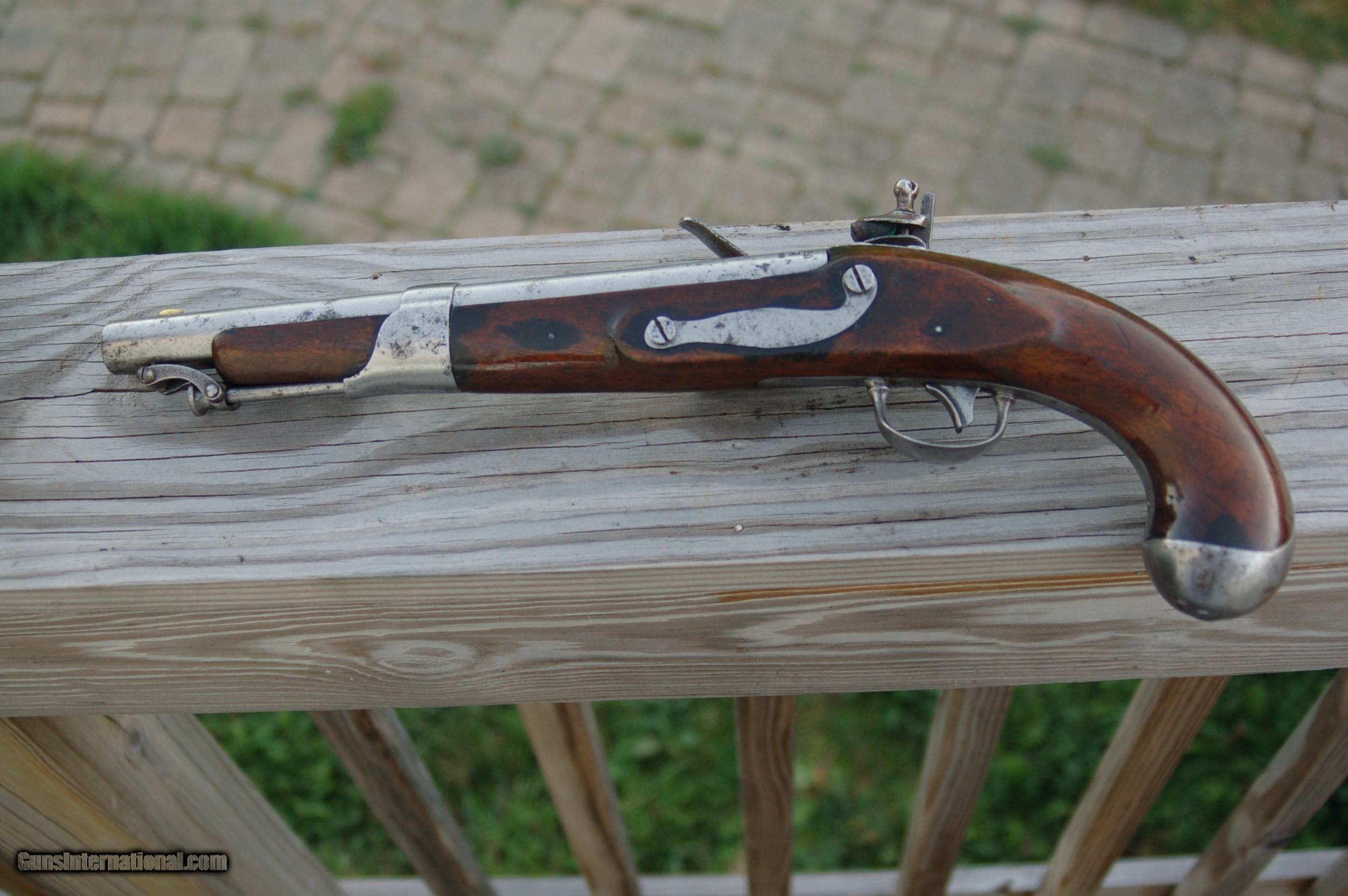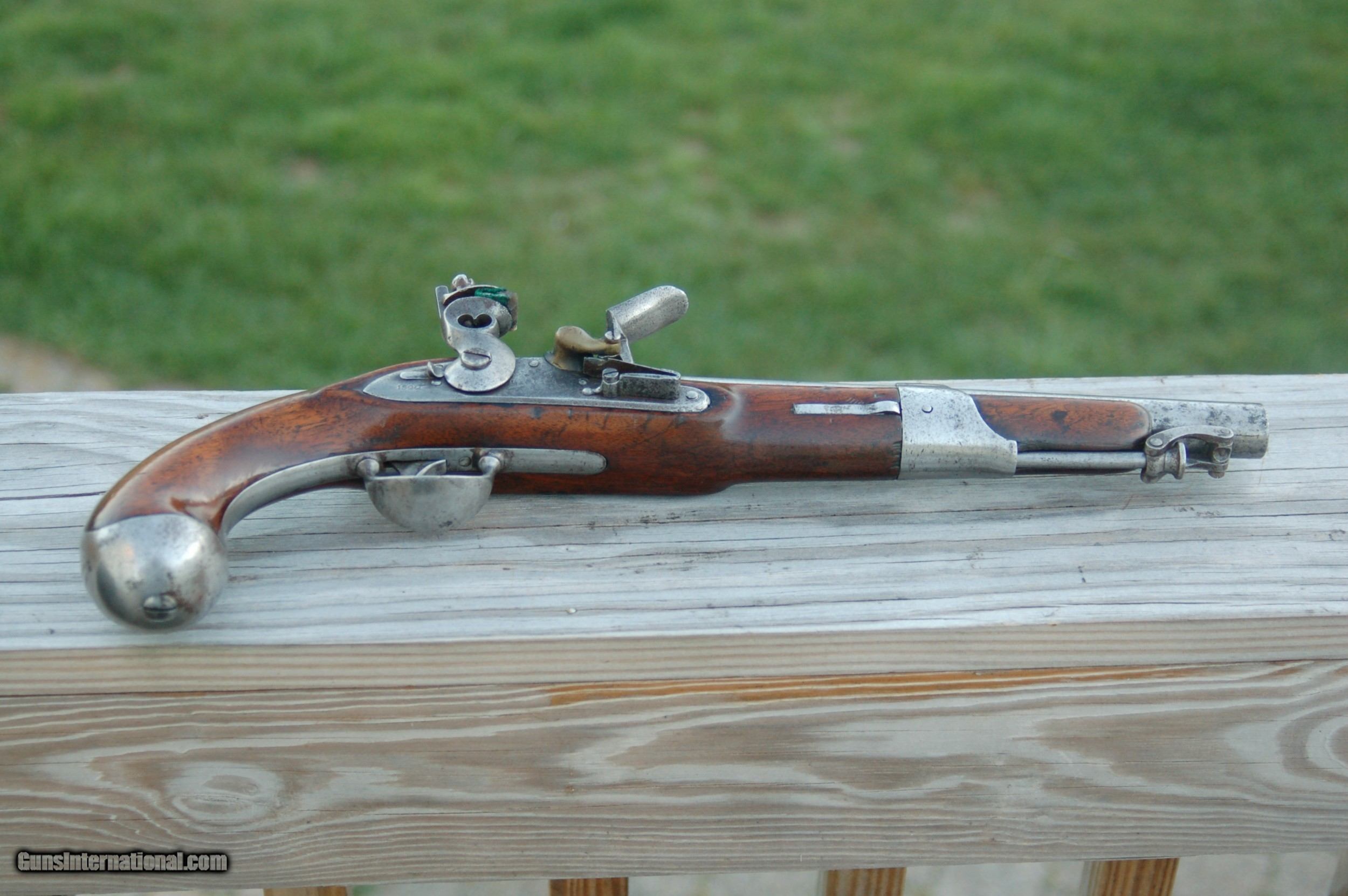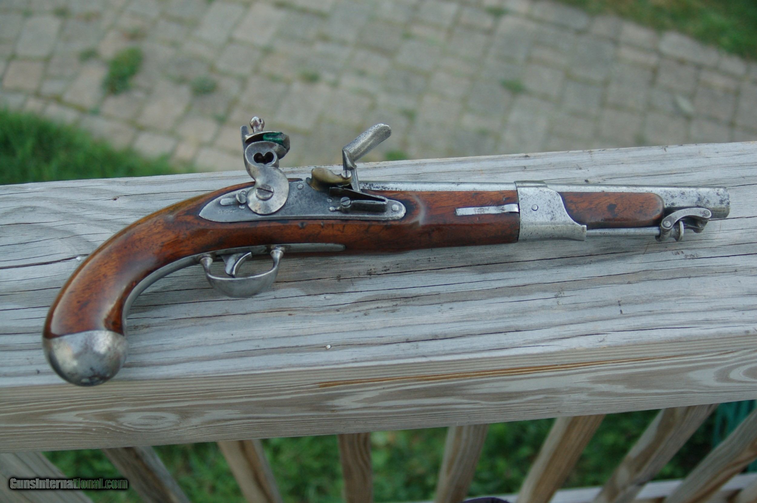 Description: Least expensive 1819 Simeon North flintlock pistol for sale on line, in the best condition, with a solid stock, no reconditioning, etc. Just a fine example of an American-made flintlock pistol. For a 200-year-old pistol it's being sold as is. Let the photographs and the price be your guide. A piece of history in your hand. Shipping and insurance will be at cost. SOLD Antique: Yes Handgun Caliber: .54 Manufacturer: Simeon North Model: 1822 Serial Number: N/A Condition: Good Metal Condition: Good Wood Condition: Good Bore Condition: Good |