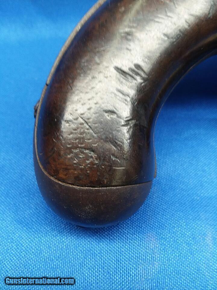 Description: 1826 North. This is a scarce Simeon North Model 1826 Pistol Made for the United States Navy. It's .54 Caliber with an 8 5/8" barrel, basically a smaller version of the Model 1819 North Contract Pistols to the Army. Only 1,500 pairs of these Pistols were made from 1826-1828 and delivered to the Brooklyn Naval Yard. The metal has never been cleaned. Lock is marked "U.S./ S. NORTH" and "1828" behind the hammer. Like almost all of surviving examples, it was converted to percussion probably sometime around the 1850's using the Belgian Cone Method. It has its original ramrod and belt hook. The mainspring is a little weak but functional. The wood is solid with no splits or cracks, just the expected minor dings and bumps from nearly 200 years of service. The breech of the barrel has a faint “P” in an oval cartouche. This is very good representative example of a rare US pistol that won’t break the bank. LEGAL: No FFL or C&R license is required! I will require a photo copy of your state ID or driver’s license with payment to verify your age. I am a collector – not a dealer, so it is your responsibility to know your local laws regarding the transfer of antique guns before . It is my intent to follow ALL national, state and local laws. If the item cannot legally be sent to you, I will charge a 20% restocking fee. All firearms are being sold as antiques and I make NO warranties or guarantees, whatsoever, as to a firearm’s safety. All firearms should be inspected by a qualified gunsmith before firing. SHIPPING: No local pick up. No international shipments. Shipping within the continental United States will be $45 for pistols. Shipments to Alaska and Hawaii will incur additional charges (I’ll only charge the incremental difference in shipping costs). I’ll do my best to ship as quickly as possible, but please keep in mind that I’m an individual and don’t have a shipping department (unless you count my wife). GENERAL: I’m new to GunsInternational but have been a long time participate on both and Ebay. Please check out my ratings: Username in is “intocw” and in Ebay is “n2cw”. SOLD Antique: Yes Manufacturer: North Model: 1826 Serial Number: NSN |