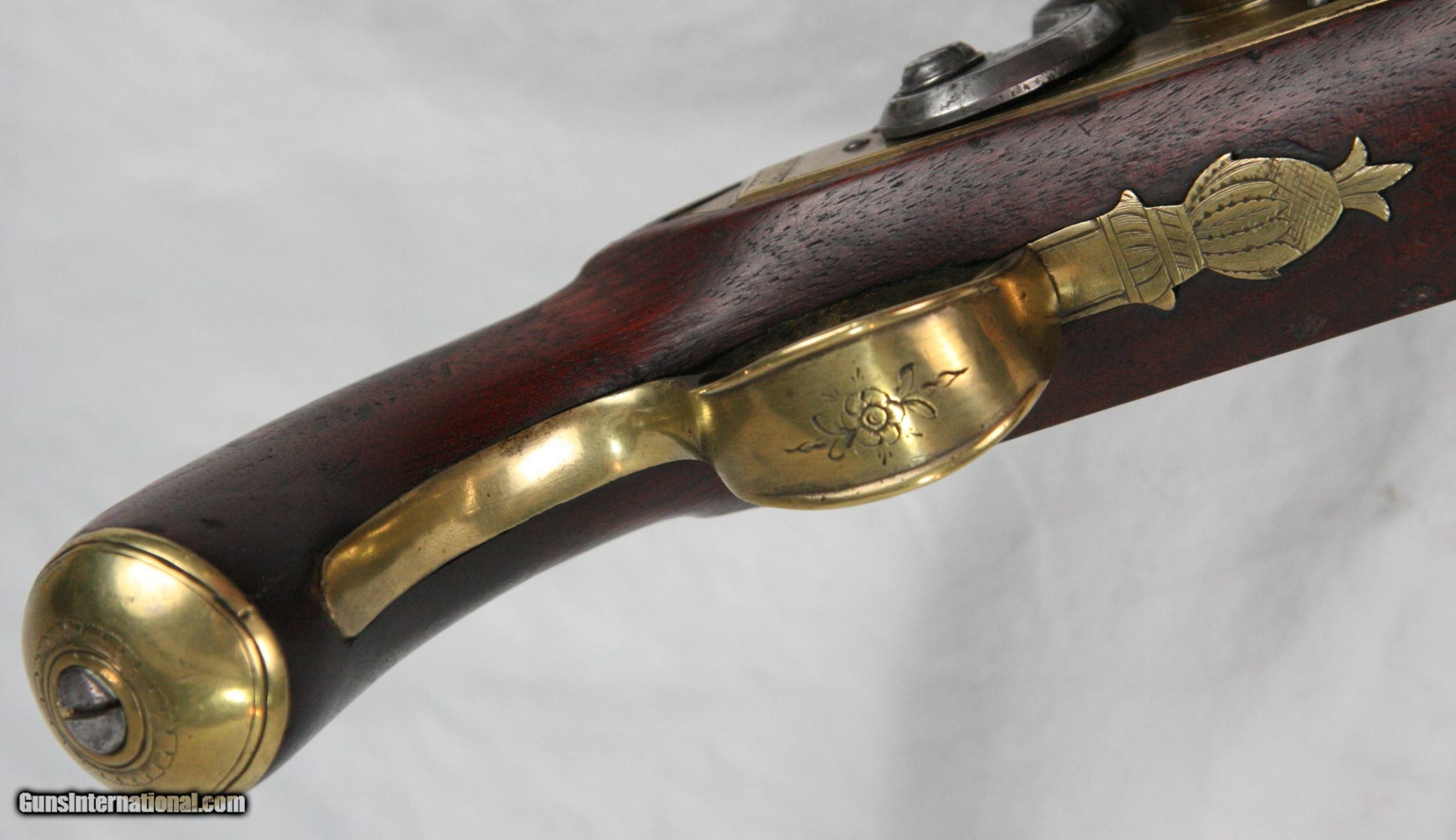 Description: This early Flint Lock pistol exhibits the finest London craftsmanship by the Firm of Ryan & Watson. The Barrel, Lock Plate and all fittings are Brass embellished with fine period engraving. London proofs are marked on the barrel; however, it is not advisable to consider shooting this piece unless you have vast experience with similar weapons. The lock and trigger mechanism work fine even after the better part of 200 years. The Ram Rod is made of Ebony wood with an Ivory sleeve on the end that appears original to the pistol. There is a “with grain” split in left side of the Walnut stock, easily repaired as there is no wood loss. The Brass barrel is approx. .52 Cal and is 8” long. REVISION: Someone was kind enough to help me with more accurate dating of this Pistol. The proof marks are post 1813 and the firm, Ryan & Watson worked until 1820. That more accuratly dates it to between 1813 - 1820. Antique firearms, pre 1899 do not require a Federal License. For purchase, a copy of a Government Issued Identification (Drivers License, Etc), showing date of birth and current address will be required. Beaver Creek Arms TERMS & CONDITIONS Objective: As a collector of 35 years and Licensed Firearms Dealer since 1989 I have a clear definition of a satisfactory transaction. I will be paid as we agreed to, and you will be satisfied with your purchase. My goal is to establish a client list of satisfied repeat customers who will recommend me to other collectors. It’s just that simple. Exiled Saudi princes with secret funds needing change from an over paid purchase need not apply. Notice: ALL Federal, State, & Local firearms laws will be followed. I will take NO shortcuts in the process of a legal sale or transfer, so please don’t ask. SHIPPING: Normally shipments are made via U.S.P.S. Priority Mail, Insured, with a return receipt. Typical Packing, Shipping and Insurance cost for a handgun is $35.00, and for a Long Gun is $45.00. Checks are to be made out to: Steve Clark Mailed to: 380 Beaver Creek Rd, Dillsburg PA 17019 Availability: All items are in stock and available for immediate shipment. Please call or email and an Item will be held up to a week with your Name, Address, & Phone Number. Items marked Reserved are being held for awaiting payment or on layaway. If you are interested in a reserved item, please call or E-Mail to be placed on a backup list. FIREARMS: Antique firearms, pre 1899 do not require a Federal License. For purchase, a copy of a Government Issued Identification (Drivers License, Etc), showing date of birth and current address will be required. GUARANTEE: Your complete satisfaction is assured, see objective above. If you are not satisfied, please contact me within 3 days of receipt. Please don’t fire the weapon, safety, function and accuracy are NOT Guaranteed. Any weapon offered by Beaver Creek Arms is never test fired nor is there any representation the gun is functional and safe to fire. These guns are sold for collectors and only represented as used firearms that must be checked by a competent person, observe all the necessary safety precautions prior to attempting to load and fire one of these weapons RETURNS: Returns must be made within 3 days of receipt. They must be received in exactly the same condition with no parts exchanged. If it has been altered, damaged, or fired, a refund will not be made. Packing, shipping and insurance cost will not be refunded. All layaway purchases are returnable for merchandise credit only. Sales: All sales are made with the buyer’s full acceptance of the stated terms of sale. All sales are made in strict compliance with all Federal Firearms Laws. No items contained in thissite are offered for sale where prohibited by any Federal, State or Local laws. By ordering, the buyer certifies that their purchase will be in full compliance with all Federal, State and Local laws. All transactions shall be deemed to occur in Pennsylvania regardless whether by telephone, mail, internet or the physical location of the buyer. All transactions will be subject only to Federal and Pennsylvania State law. Any disputes will be resolved in a Pennsylvania Court. PAYMENT: Bank check, Personal check, and Money Orders are preferred. Visa and MasterCard are accepted with a 3% processing fee. For Visa and MasterCard orders please provide the account number, code number, expiration date, name on card, phone number and card billing address. This information can be phoned in, or E-Mailed. All orders must be paid in advance, C.O.D. orders are not accepted. Checks, both Bank and Personal must clear before the order will be shipped, usually a 2 week delay. LAYAWAYS: A 20% deposit is required. Balance is due in 60 days. Deposits are non-refundable and are forfeited after 60 days. Layaway sales are returnable for merchandise credit only. SALES TAX: Pennsylvania state sales tax is 6% for in state purchases. The payment of other states sales tax, if applicable, for shipped items is the buyers responsibility. DISCREET: Client information will remain Confidential. Your privacy is protected. SOLD Antique: Yes |