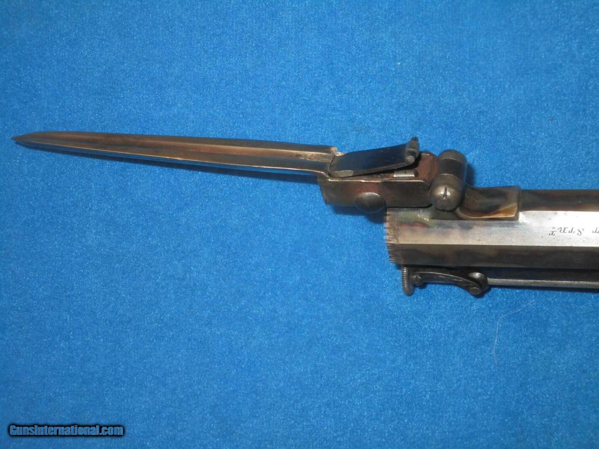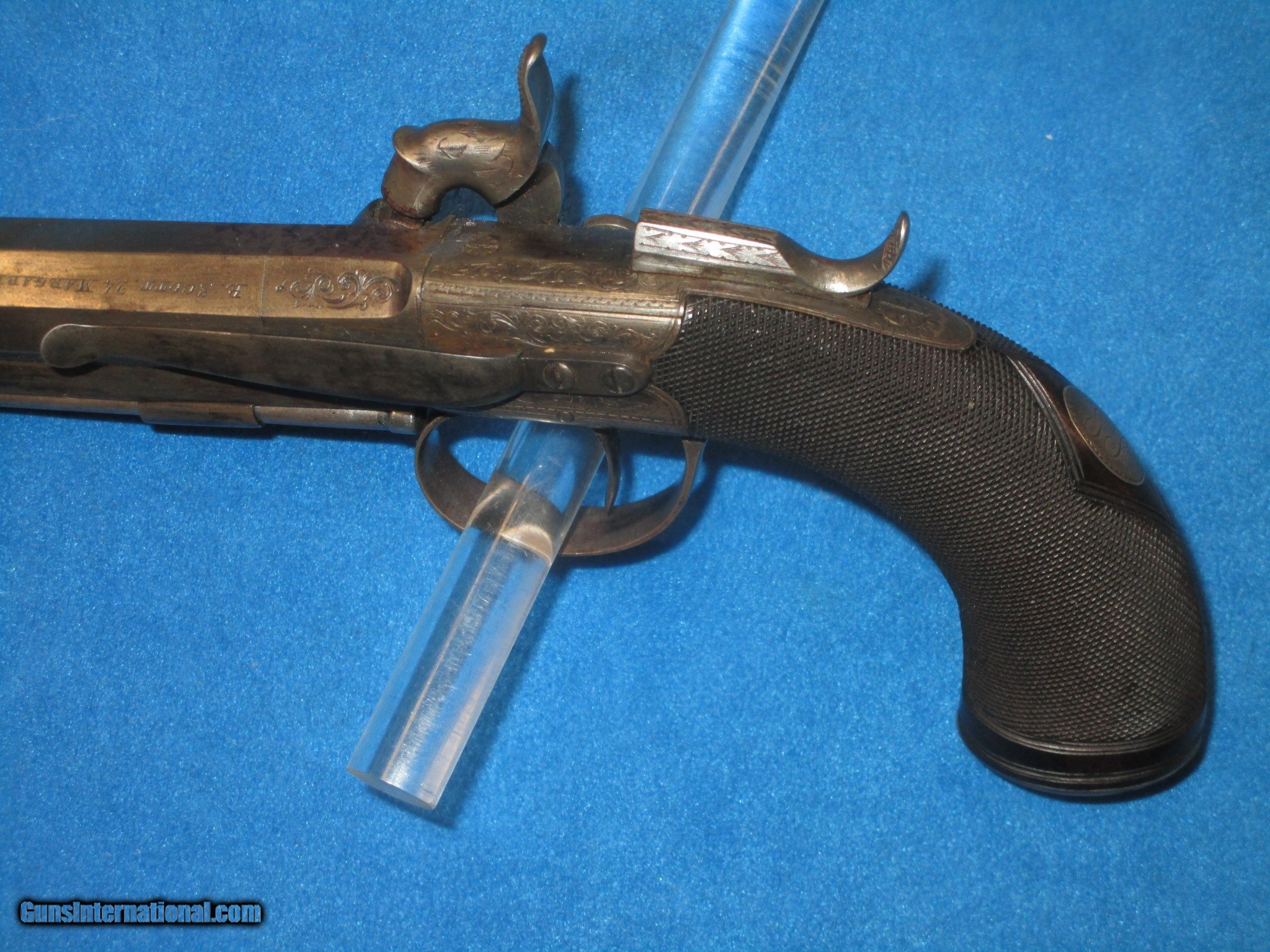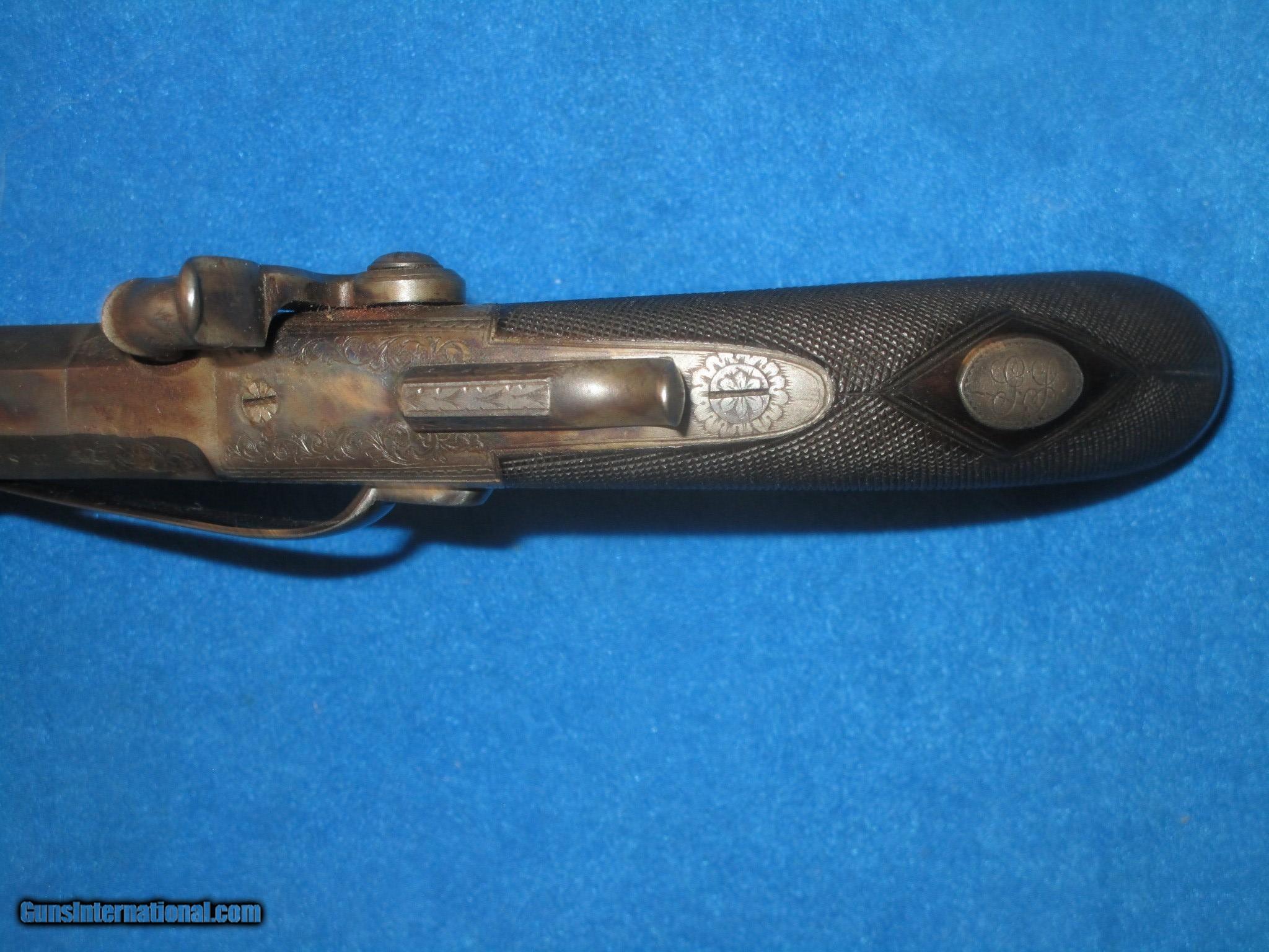 Description: A VERY SCARCE PAIR OF MID 1800'S CASED "R. SCOTT, LONDON" FLIP BAYONET PERCUSSION BELT PISTOLS WITH BELT HOOKS IN VERY NICE CONDITION, & IN THEIR ORIGINAL CASE WITH ACCESSORIES. ALL ORIGINAL & COMPLETE. BOTH PISTOLS HAVE FINE METAL AND MARKINGS. THEY ALSO HAVE FINE ENGRAVING ON THE FRAME, HAMMER, TANGS, BARRELS, TRIGGER GUARDS, & BUTTS. THEY EACH ARE MARKED ON BOTH SIDES OF THE BARREL. ONE FLAT IS MARKED "R. SCOTT, 24 MARGARET STR'T" AND THE OTHER FLAT IS MARKED "CAVENDISH SQ'RE LONDON". THEY BOTH HAVE THEIR ORIGINAL FINE BELT HOOKS. ONE OF THE PISTOLS RETAINS MOST OF ITS ORIGINAL CASE COLORS THROUGHOUT AND THE OTHER HAS A NICE EVEN NATURAL PATINA WITH HINTS OF COLOR IN SPOTS. THIS IS NOT UNUSUAL AS THEY USUALLY USED ONE OF THE PISTOLS IN A CASED SET & NOT THE OTHER. BOTH OF THEM HAVE FLIP OUT LOCKING BAYONETS & CAP HOLDERS IN THE BUTTS. THE GRIPS ON BOTH PISTOL ARE FINELY CHECKERED THROUGHOUT. THEY HAVE FINE ACTIONS & NICE BORES. THEY MEASURE 8 1/4 INCHES CLOSED & 13 INCHES WITH THE BAYONETS OPEN. THE ORIGINAL BRASS BOUND CASE IS FINE THROUGHOUT WITH NICE ACCESSORIES. THESE ARE A VERY SCARCE PAIR OF CASED FLIP BAYONET PERCUSSION PISTOLS WITH A FINE UNTOUCHED LOOK TO THEM! SOLD Antique: Yes Manufacturer: R. SCOTT Model: PAIR OF FLIP BAYONET FLINTLOCK PISTOLS IN ORIGINAL CASE |