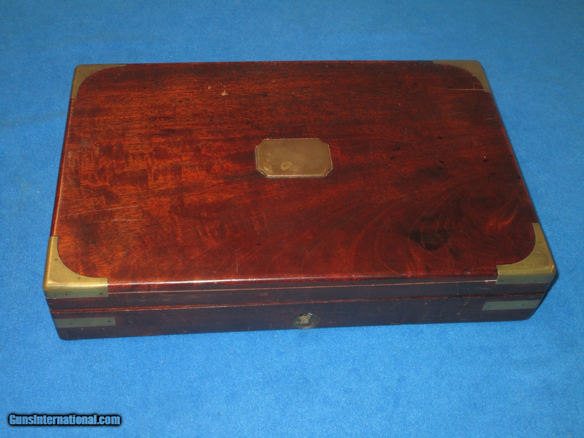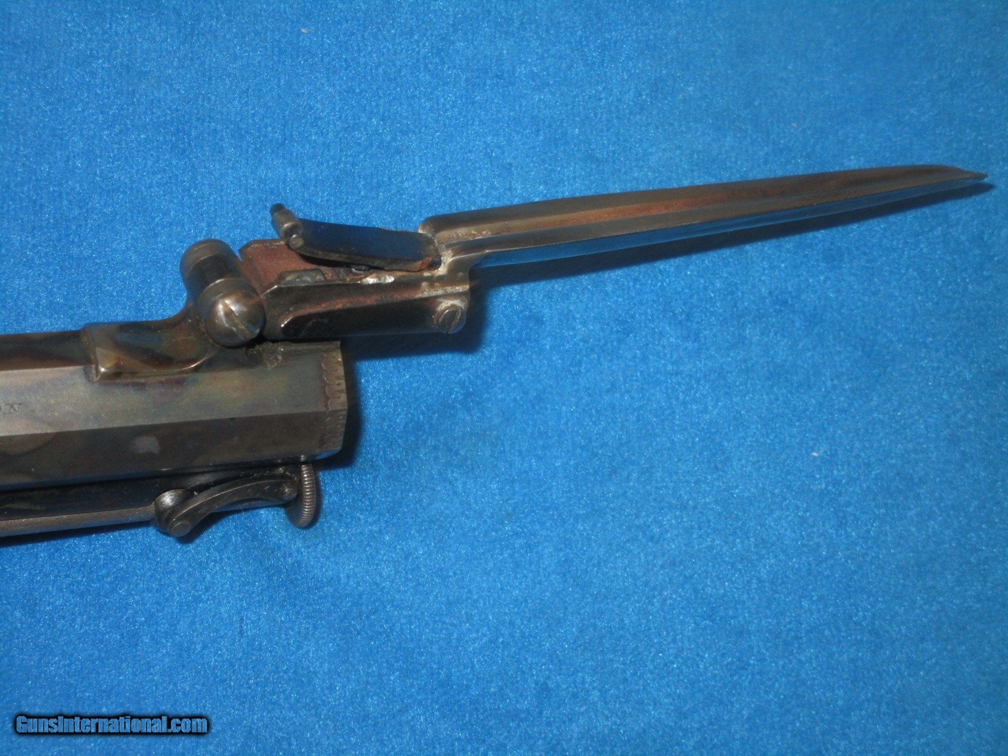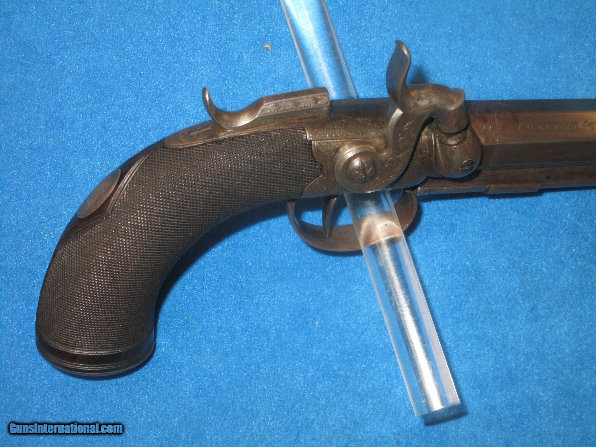 Description: A VERY SCARCE PAIR OF MID 1800'S CASED "R. SCOTT, LONDON" FLIP BAYONET PERCUSSION BELT PISTOLS WITH BELT HOOKS IN VERY NICE CONDITION, & IN THEIR ORIGINAL CASE WITH ACCESSORIES. ALL ORIGINAL & COMPLETE. BOTH PISTOLS HAVE FINE METAL AND MARKINGS. THEY ALSO HAVE FINE ENGRAVING ON THE FRAME, HAMMER, TANGS, BARRELS, TRIGGER GUARDS, & BUTTS. THEY EACH ARE MARKED ON BOTH SIDES OF THE BARREL. ONE FLAT IS MARKED "R. SCOTT, 24 MARGARET STR'T" AND THE OTHER FLAT IS MARKED "CAVENDISH SQ'RE LONDON". THEY BOTH HAVE THEIR ORIGINAL FINE BELT HOOKS. ONE OF THE PISTOLS RETAINS MOST OF ITS ORIGINAL CASE COLORS THROUGHOUT AND THE OTHER HAS A NICE EVEN NATURAL PATINA WITH HINTS OF COLOR IN SPOTS. THIS IS NOT UNUSUAL AS THEY USUALLY USED ONE OF THE PISTOLS IN A CASED SET & NOT THE OTHER. BOTH OF THEM HAVE FLIP OUT LOCKING BAYONETS & CAP HOLDERS IN THE BUTTS. THE GRIPS ON BOTH PISTOL ARE FINELY CHECKERED THROUGHOUT. THEY HAVE FINE ACTIONS & NICE BORES. THEY MEASURE 8 1/4 INCHES CLOSED & 13 INCHES WITH THE BAYONETS OPEN. THE ORIGINAL BRASS BOUND CASE IS FINE THROUGHOUT WITH NICE ACCESSORIES. THESE ARE A VERY SCARCE PAIR OF CASED FLIP BAYONET PERCUSSION PISTOLS WITH A FINE UNTOUCHED LOOK TO THEM! SOLD Antique: Yes Manufacturer: R. SCOTT Model: PAIR OF FLIP BAYONET FLINTLOCK PISTOLS IN ORIGINAL CASE |