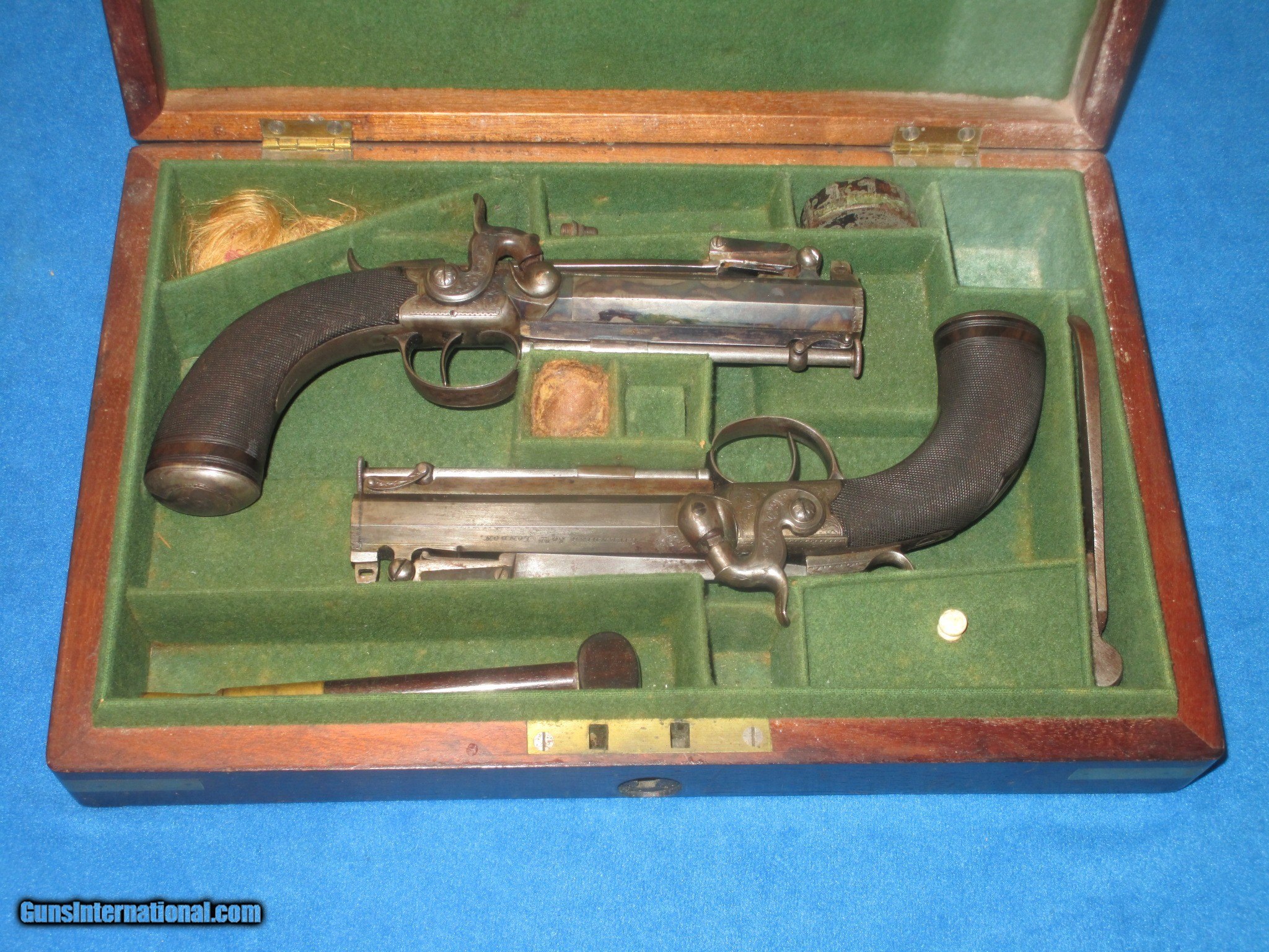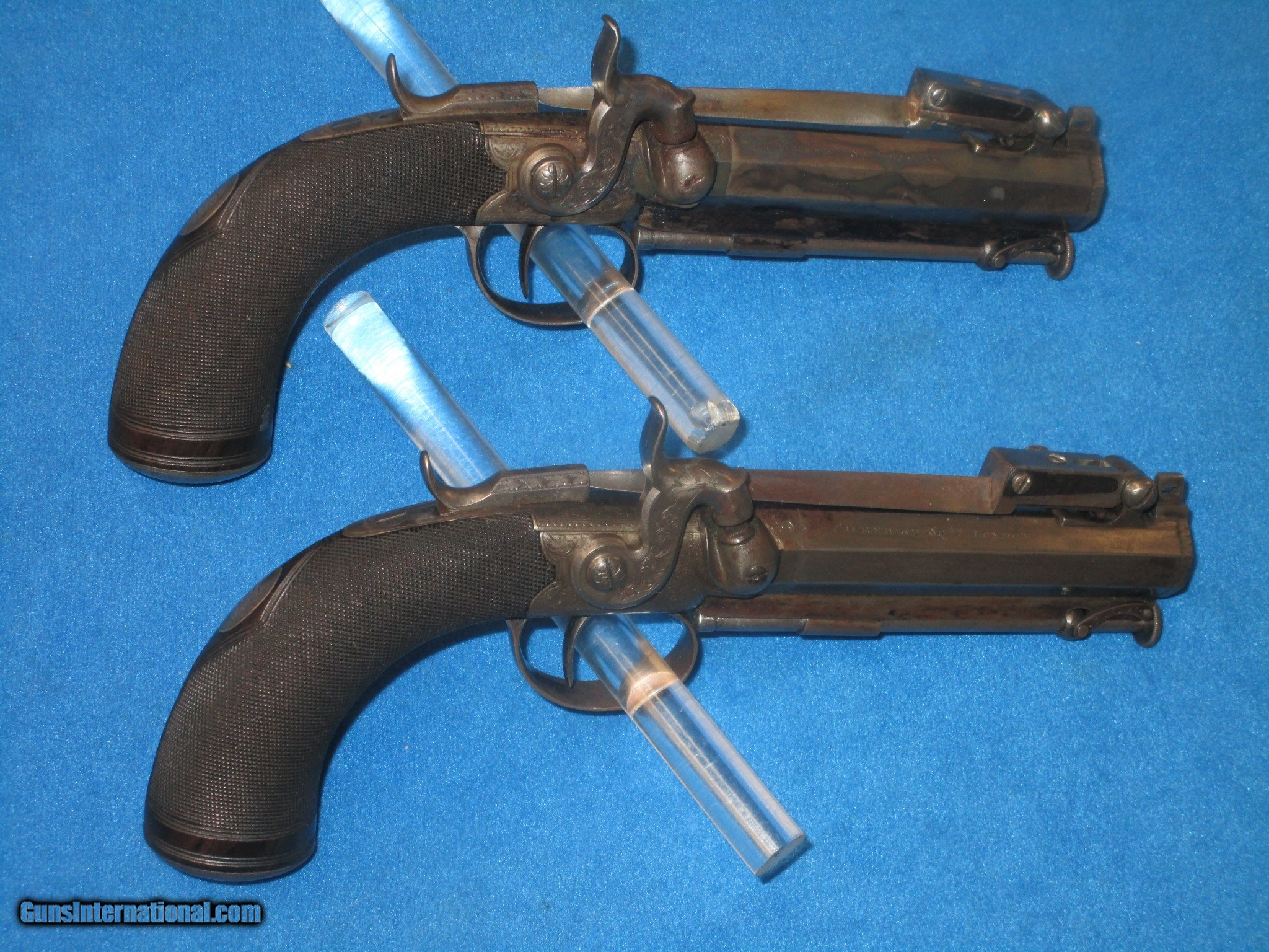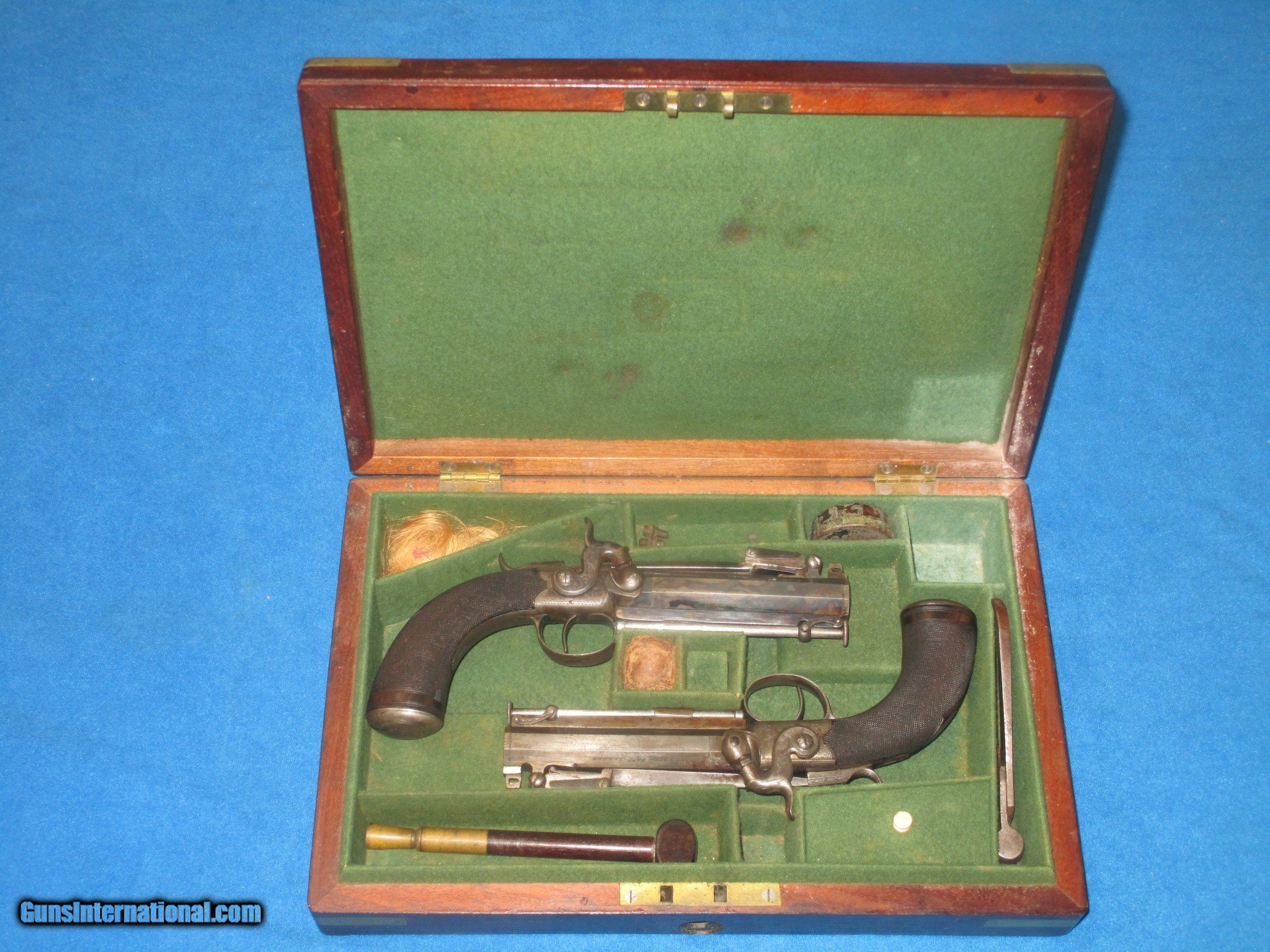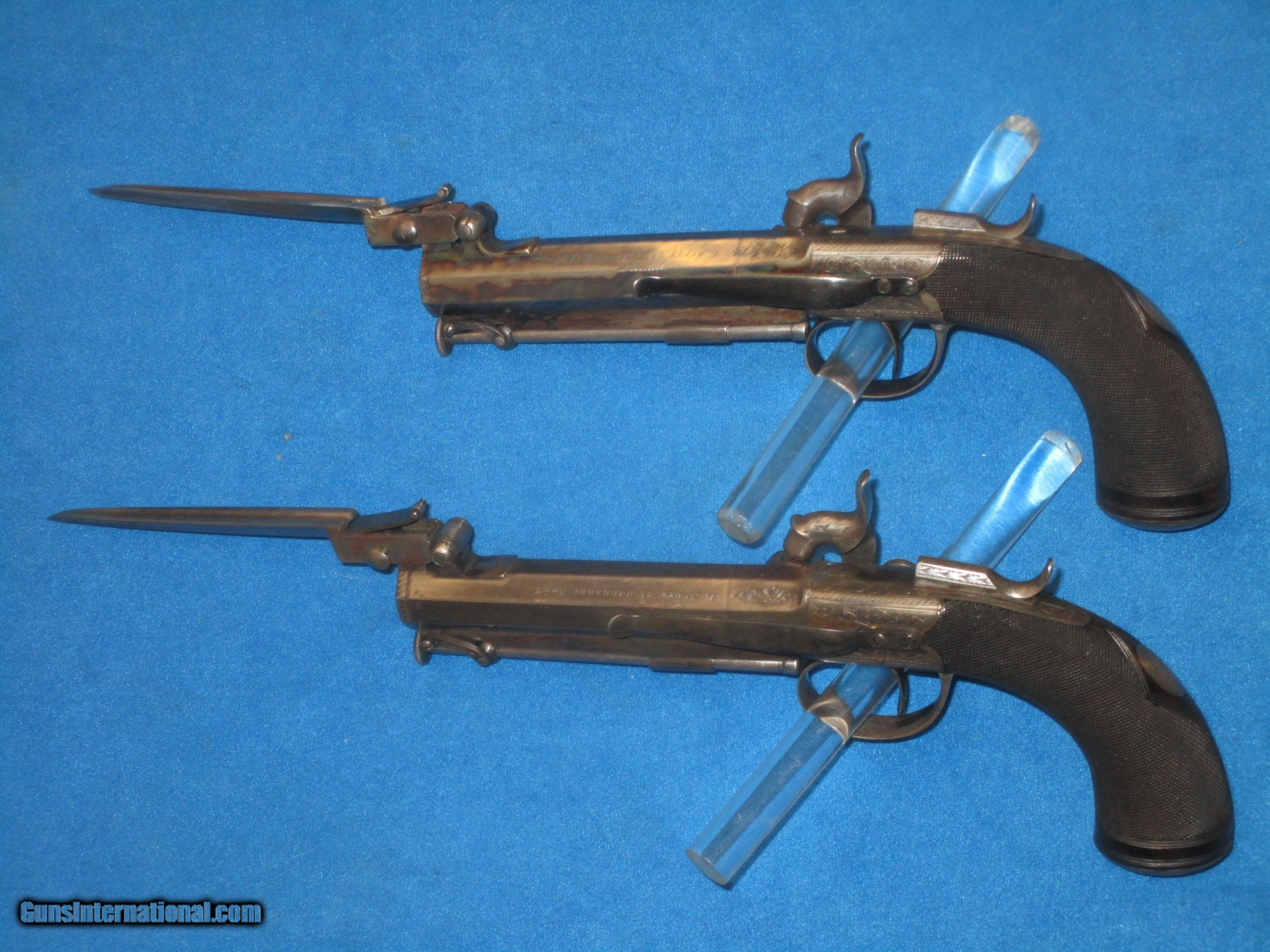 A VERY SCARCE PAIR OF MID 1800'S CASED "R. SCOTT, LONDON" FLIP BAYONET PERCUSSION BELT PISTOLS WITH BELT HOOKS IN VERY NICE CONDITION!
