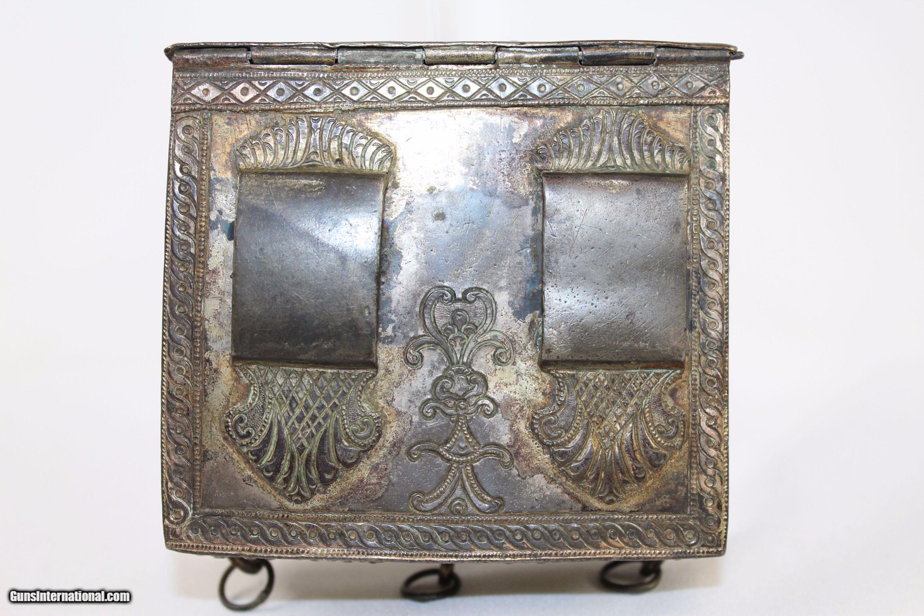 Description: Absolutely GORGEOUS European Ottoman ANTIQUITIES Highly Ornate Pistol, Dagger & Ammunition Box Here we present an antique European Flintlock Officer’s Pistol, made circa the early 18th Century. This gun was then captured in Ottoman territory, used, embellished and repaired as the new owner needed. The Ottoman Empire was constantly at war with European nations. The pommel has been embellished with four flower-shaped medallions with a cylindrical cap in the center. The grip is completely wrapped with two separate sheets which are finely beaded and bejeweled, giving the grip a lot of texture. The barrel has also been engraved with interesting and unique designs some of which repeat. The muzzle end of the barrel has been wrapped with a thin piece of metal that has been hammered with designs. The stock was repaired during the period of use under the lock with a sheet of metal that is tacked in place. The trigger guard finial was kept and also tacked on. This fascinating and beautiful pistol is accompanied by a fantastic dagger with an engraved brass covered wood scabbard. The handle of the dagger is skeletonized, giving the tang of the knife a caged appearance. The blade is shaped like a spear point and is very sharp. There is also a very ornate box with a hinged lid that would have been worn on the belt. This likely contained ammunition for the pistol or other firearm. The level of craftsmanship that went into all three of these pieces is amazing. All of these would have been hand-made and built rugged. These are works of art as well as functional kit for a soldier. The overall condition is very good. The metal surfaces are dark with age. Engraving is clear. The bore is smooth and untouched. The action is stiff and should not be considered functional. Here is a one of a kind set of weapons that were made with both beauty and warfare in mind. Imagine putting this on display in your collection! Own the original! This is a legitimate antique and not a reproduction. Barrel is 12 inches. Caliber: .60 Overall condition as seen in photos. Very Fast. Very Safe. FREE SHIPPING WORLDWIDE. Delivered directly to your door by express mail! Guaranteed AUTHENTIC & Includes CERTIFICATE OF AUTHENTICITY. ancestryguns $3500 #5236 SOLD Antique: Yes |