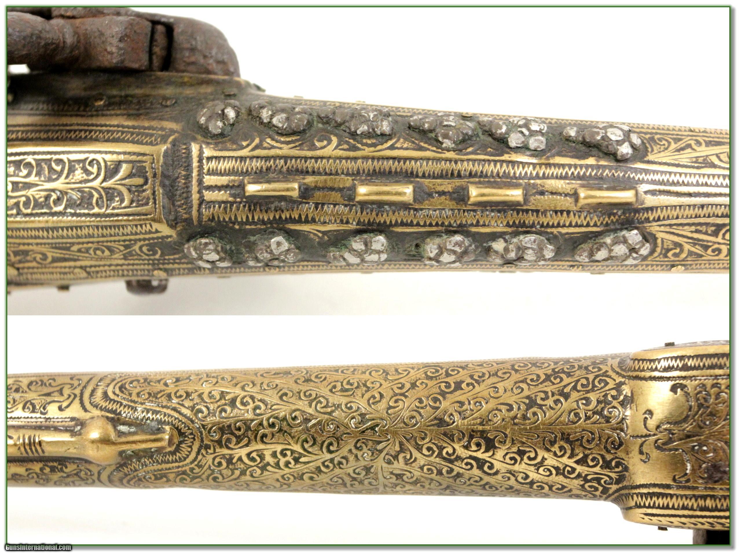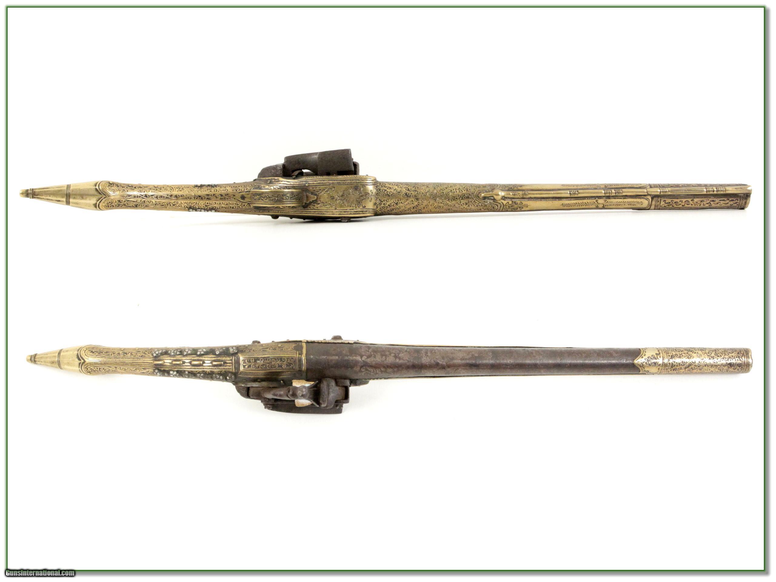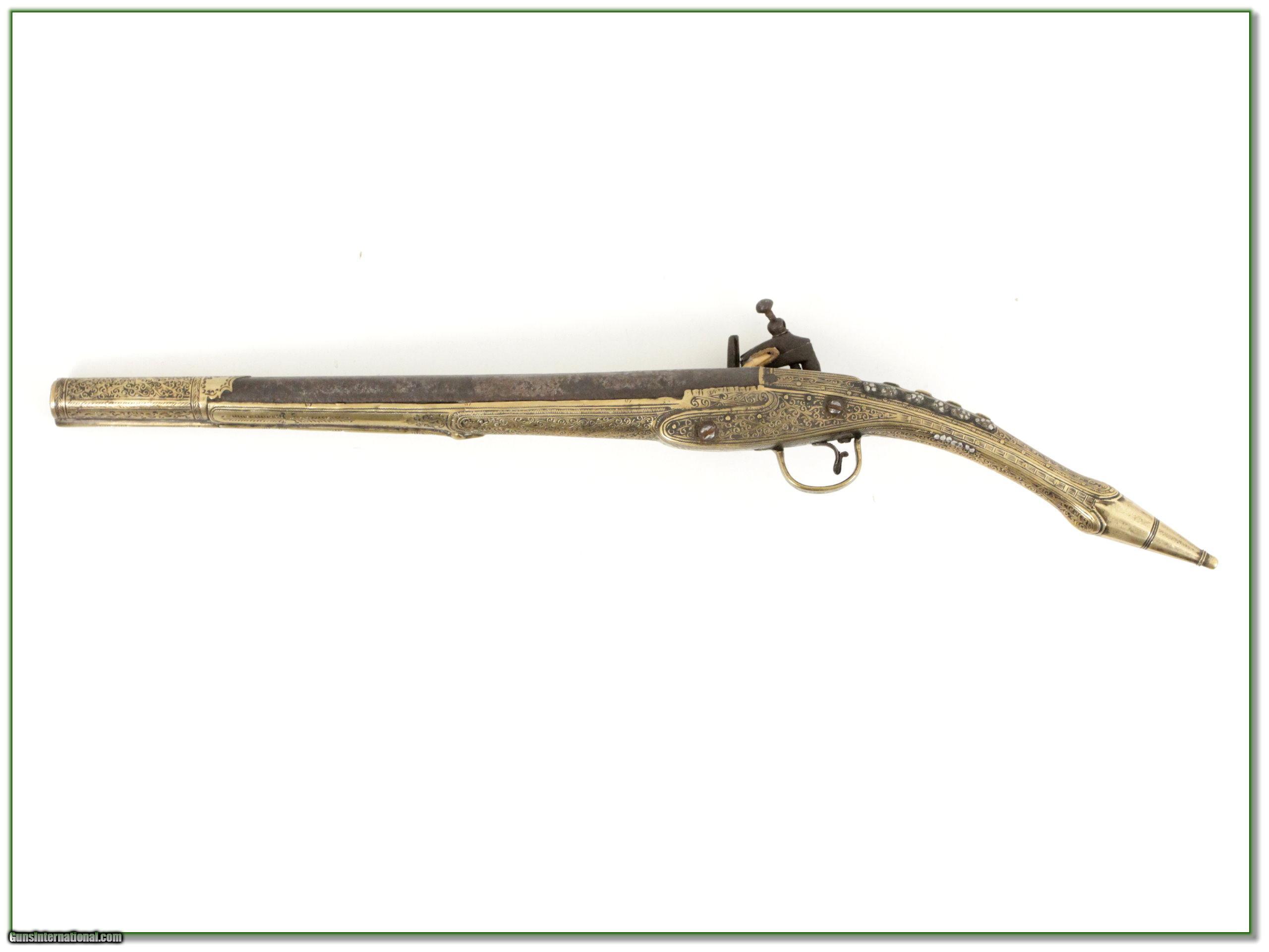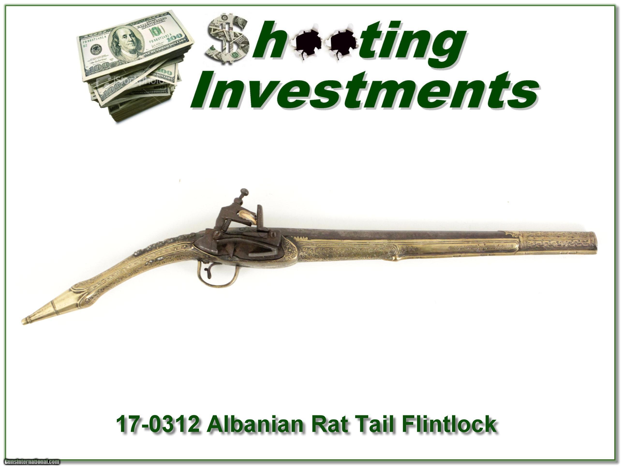 Description: This is a fine example of a 19th century Albanian Rat Tail flintlock. It is extensively decorated with 13in barrel. It is an antique and doesn’t require shipping to a FFL. It was purchase in 2016 for $1800 from Collectors Firearms and is being sold by the estate of the late owner. It will make a fine addition to your collection! I am selling this one on consignment and as such, lay-a-way can’t be used. It does of course have the standard 3-day inspection. Shipping and insurance is $35 or $15 more if you want it shipped in a new Plano hard case. Please email me with any questions or larger pictures. (I now consign quality firearms only 10%! Let me know if you have any you would like to sell!) 17-0312 Payment: Payment is by Money Order, Cashiers Check or Personal Check. I can now also accept MasterCard and Visa with a 3% convenience fee. PayPal can be used for some items but never firearms. Please let us know if you would like to pay via PayPal. Shipping: The shipping charge will be listed in each description. It is $35 for most guns. Some heavy guns or those insured for over $2000 will be higher. Shipments to Alaska and Hawaii are higher because air shipment is required. Most firearms are shipped within 5 days of receipt of payment. We prefer shipping at the beginning of the week to avoid firearms in transit over weekends. We package all shipments carefully and insure them for the full purchase price, rounded up to the next $100. In the unlikely event that damage occurs, it is important that you save all packaging material for the claims process. Optics are shipped Priority Mail and most other non-firearm shipments are shipped First Class. Returns: Our return policy is simple. If for any reason you are not pleased with your purchase, you may return your item for a refund. The only exception is ammunition, it cannot be returned. It is important to us that you are happy. Guns cannot be fired or dissembled before returning them and must be returned in the same condition as received. Notification of a return must occur with-in 3 days of receipt at your dealer. Shipping, convenience and dealer fees are not refundable and are the responsibility of the buyer. Lay-a-way: If needed, we offer a 60 day lay-a-way option on most firearms. It is 1/3 now, 1/3 in 30 days and 1/3 in 60 days. Lay-a-way firearm sales are final. Consigning your firearms with Shooting Investments: We will help you get top dollar for your firearms. While most local guns shops charge 20% or more, our fee is only 10% with a minimum of $50. At your local gun shop it might take months to sell. Selling on-line provides instant access to thousands of interested buyers. You won’t find any other on-line dealer willing to sell your firearms for only 10% or listing every gun on 4 separate s. Selling through an House typically costs the seller 15% and the buyer an addition 15% (so 30%) and you have to wait several months to sell and longer to receive funds. If properly priced, we will sell your firearms in a week or two. Send us an email or give us a call and we’ll explain how easy it is for you to get top dollar. Trading: We collect guns and usually just trade for guns we want to add to our collections. We often sell guns for others wanting to purchase one of ours. We find this the most fair to both of us. Our Commission is only 10% and we hold the gun you want until yours sells. Please contact us if you want to sell one of yours to buy one of ours. Help for California Buyers: We are happy to ship to California. It is the buyer’s responsibility to make sure any item you buy is legal in your state. We are also happy to help with your purchase of a firearm from someone other than us. If you see a gun you would like to buy but the seller can’t or won’t ship to California we can help. You buy the gun and have it shipped to us. We’ll then ship it to your California dealer. The cost for this service is only $30 + shipping. Let me know if we can help! SOLD Antique: Yes |