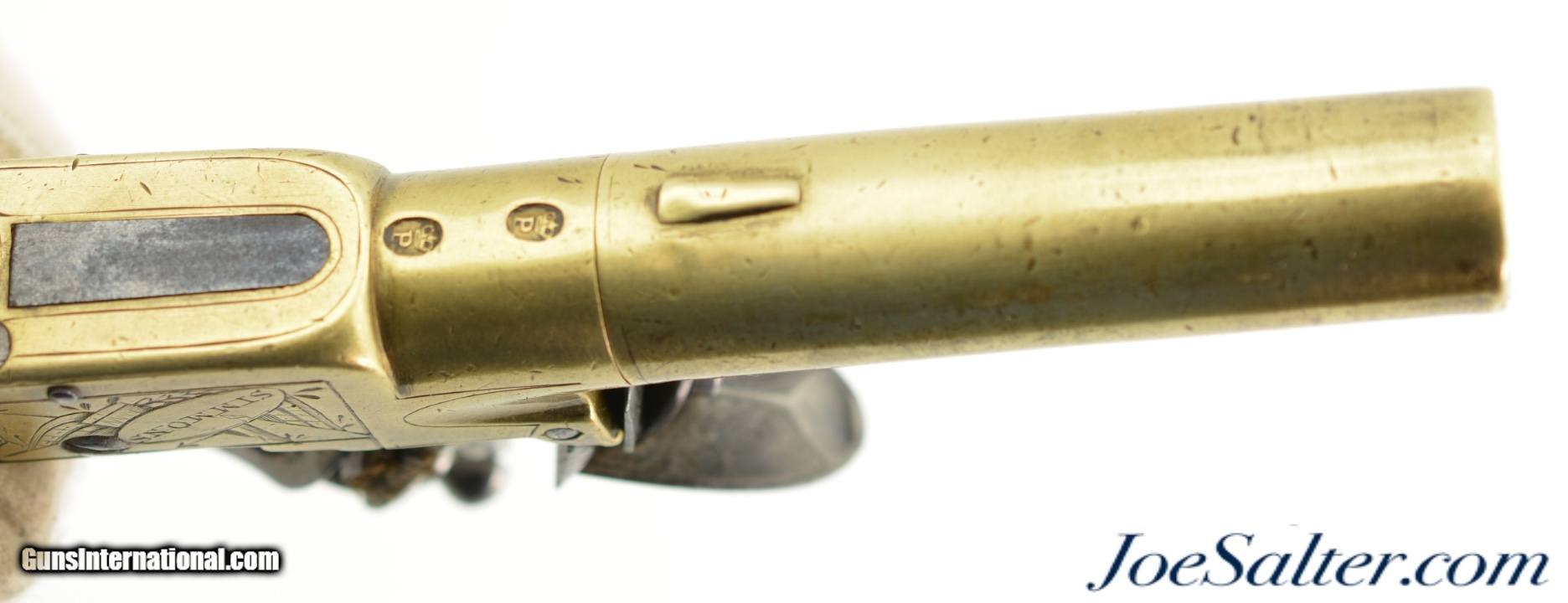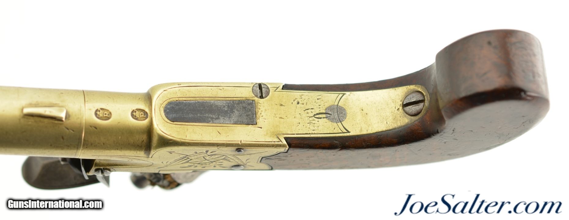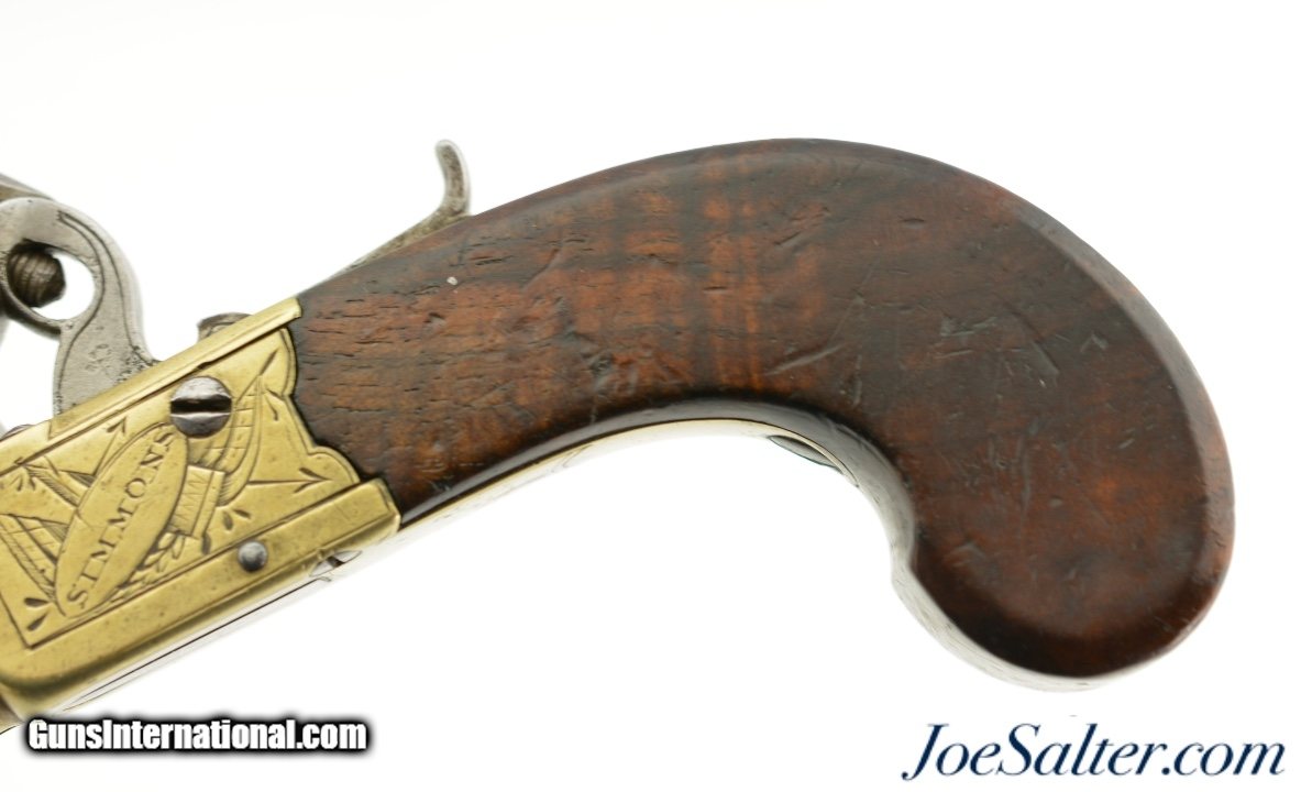 Description: NSN, .45 Caliber, 2 9/16" barrel with an excellent, bright bore. This is an attractive pistol that has an overall pale yellow and ochre patina throughout, with some scattered dark spots throughout. The box frame has a British shield and panoply motif on the right side, and "SIMMONS" on the left. There were two gunmakers in Birmingham in the early 1800s named Simmons: Joseph and John. The bag-shaped, walnut grip has some minor handling marks and blemishes scattered about the original oil finish. The lock and sliding safety are both fully functional. This is a very attractive little pistol, and is in very good-near fine condition overall. Antique SOLD Antique: Yes |